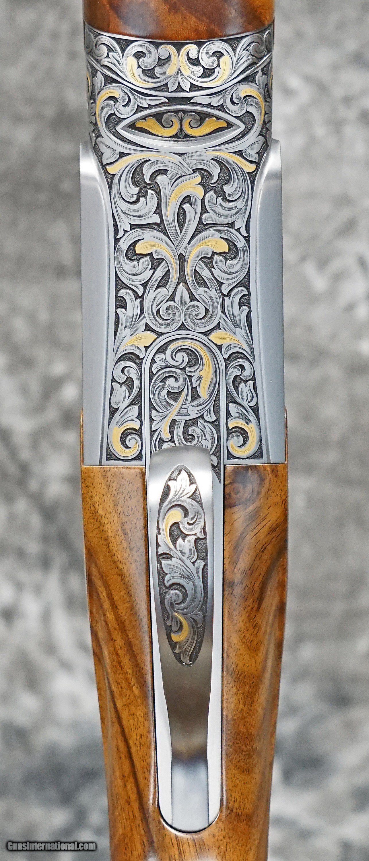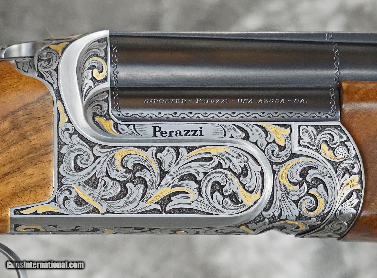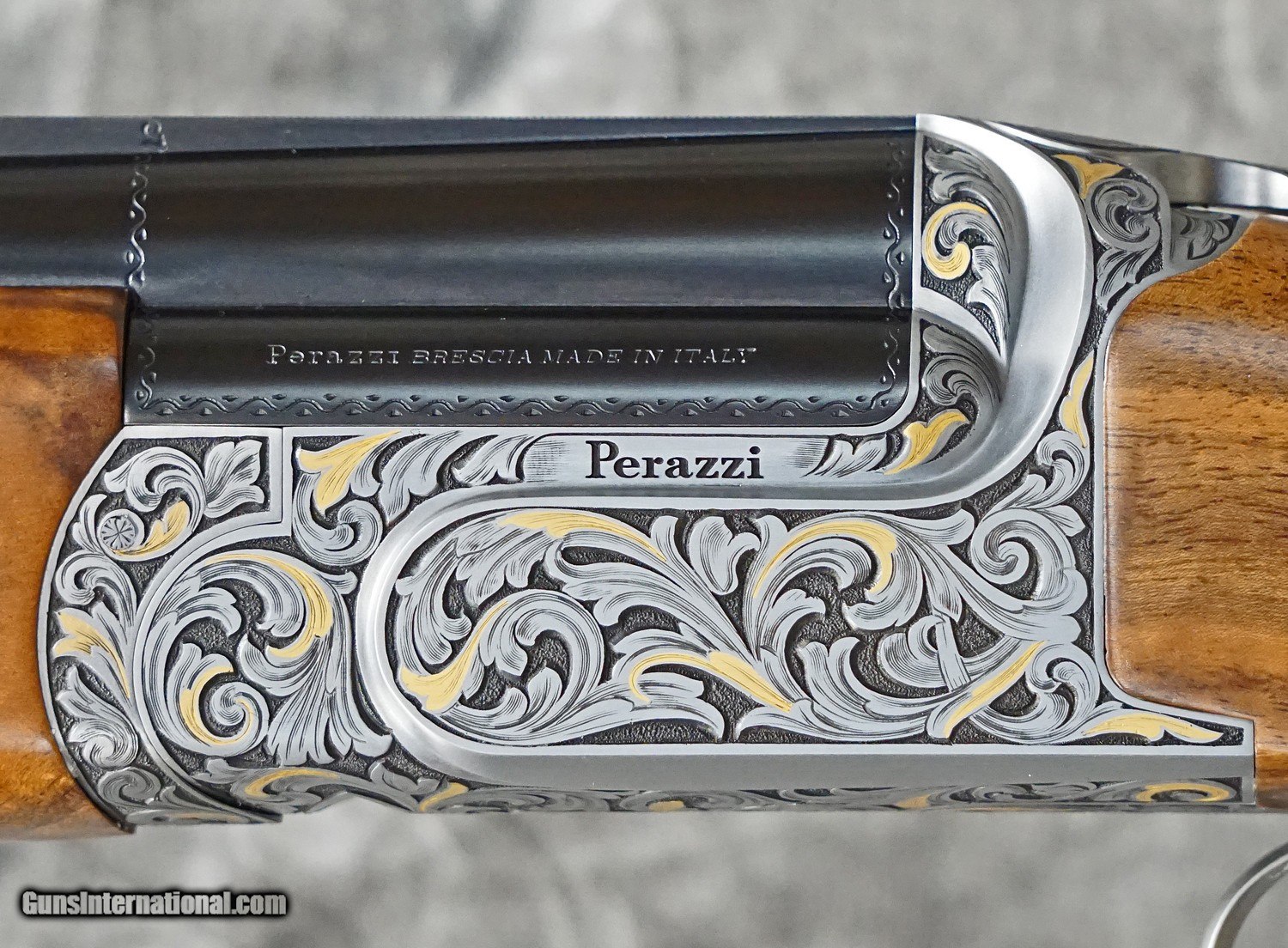 Description: Demo Fired Only Perazzi High Tech S SC3 Gold Sporting 12GA with 32" factory choke tubed barrels, 7x7 tramline parallel rib. Coin finished action featuring gold inlaid scrolls, deeply engraved and highly detailed by the Masters at Giovanelli. Factory fixed coil spring, selective trigger, pierced top-lever. Factory adj. comb sporting stock with right-hand palmswell, HT forearm. Includes factory leather trimmed case, chokes and tools. Very little use, nearly as-new, only recoil pad has been changed to Kickeez No. 600 sporting pad. SOLD Shotgun Gauge: 12 Gauge |