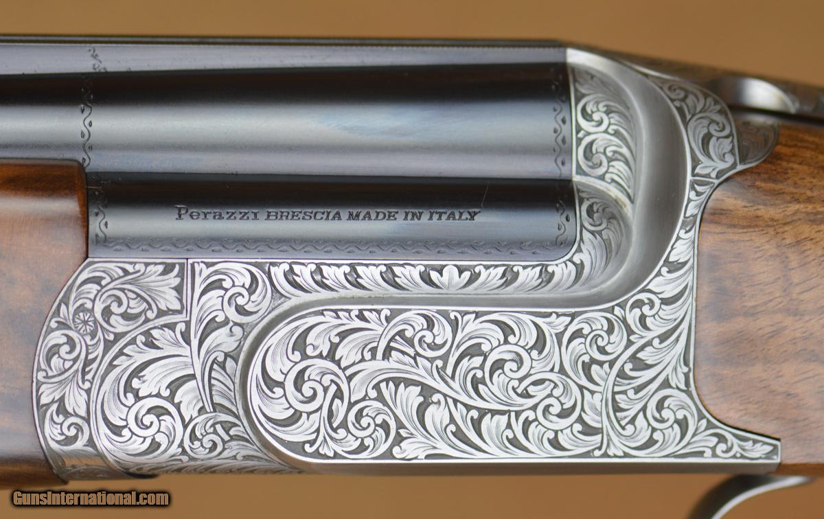Description: New Perazzi High-Tech SC3 Sporting 12GA/20GA/28GA/.410 Four Barrel set with true 32" factory choke tubes, 11x7 flat tapered tramline ribs. Individual forearm and irons for each barrel set. Factory removable selective trigger, pierced top-lever. Coin finished Number 101 Scroll engraving pattern, fully hand-engraved by the Italian master Bottegga C. Giovanelli. Stunning factory adj. comb sporting stock with right-hand palmswell and fully checkered English sporting forearm. Includes factory SC3 case with choke tubes, tools. SOLD |
