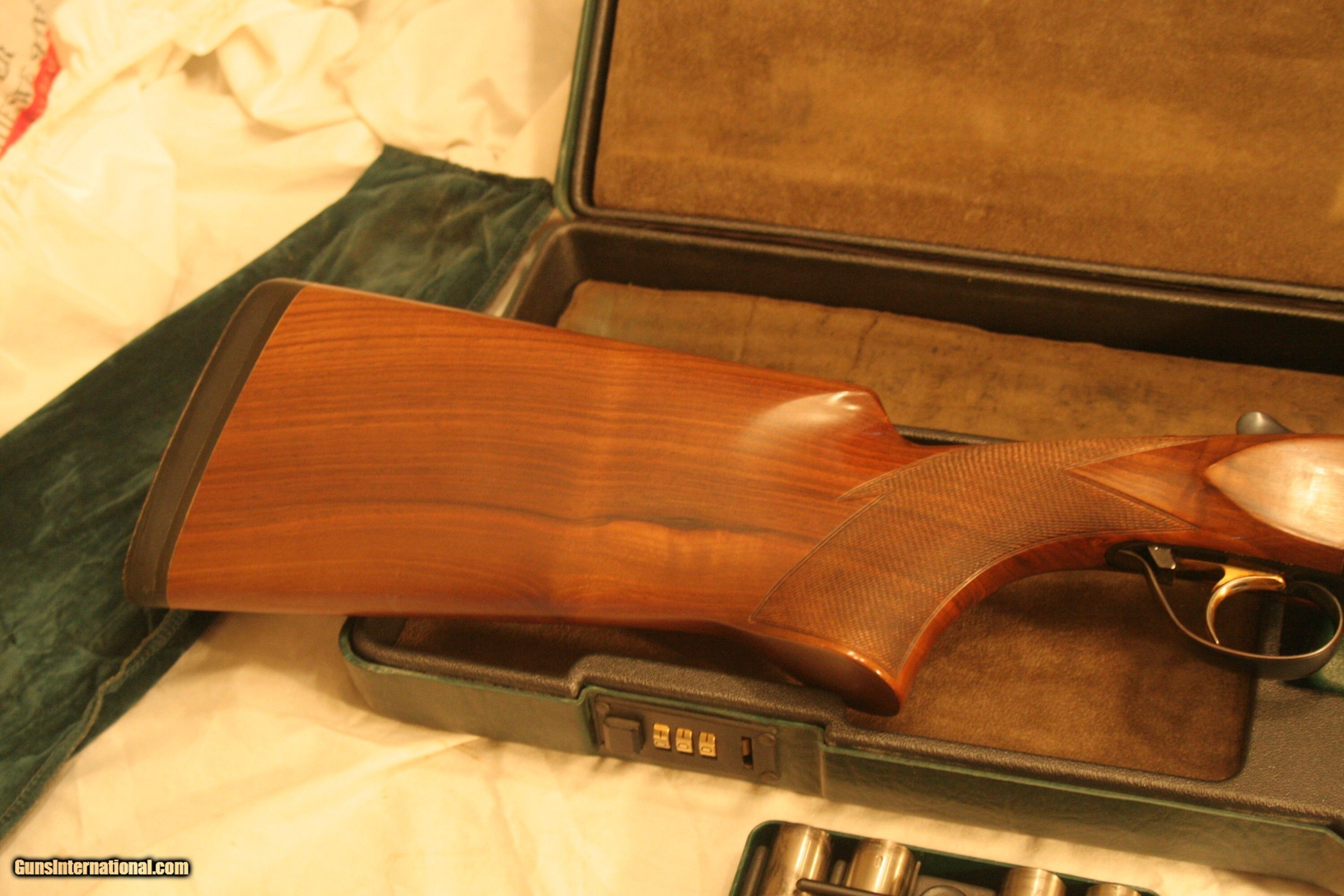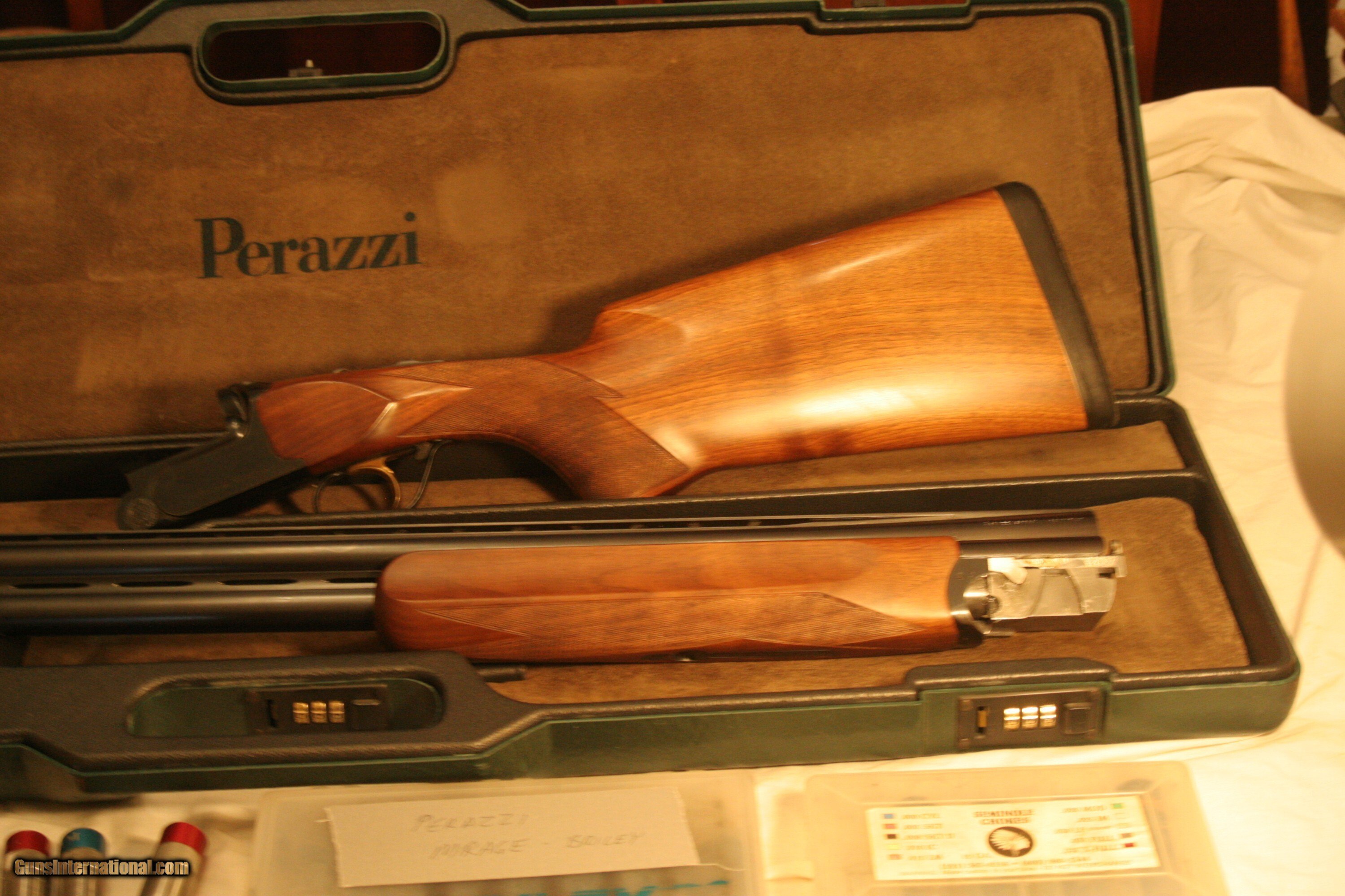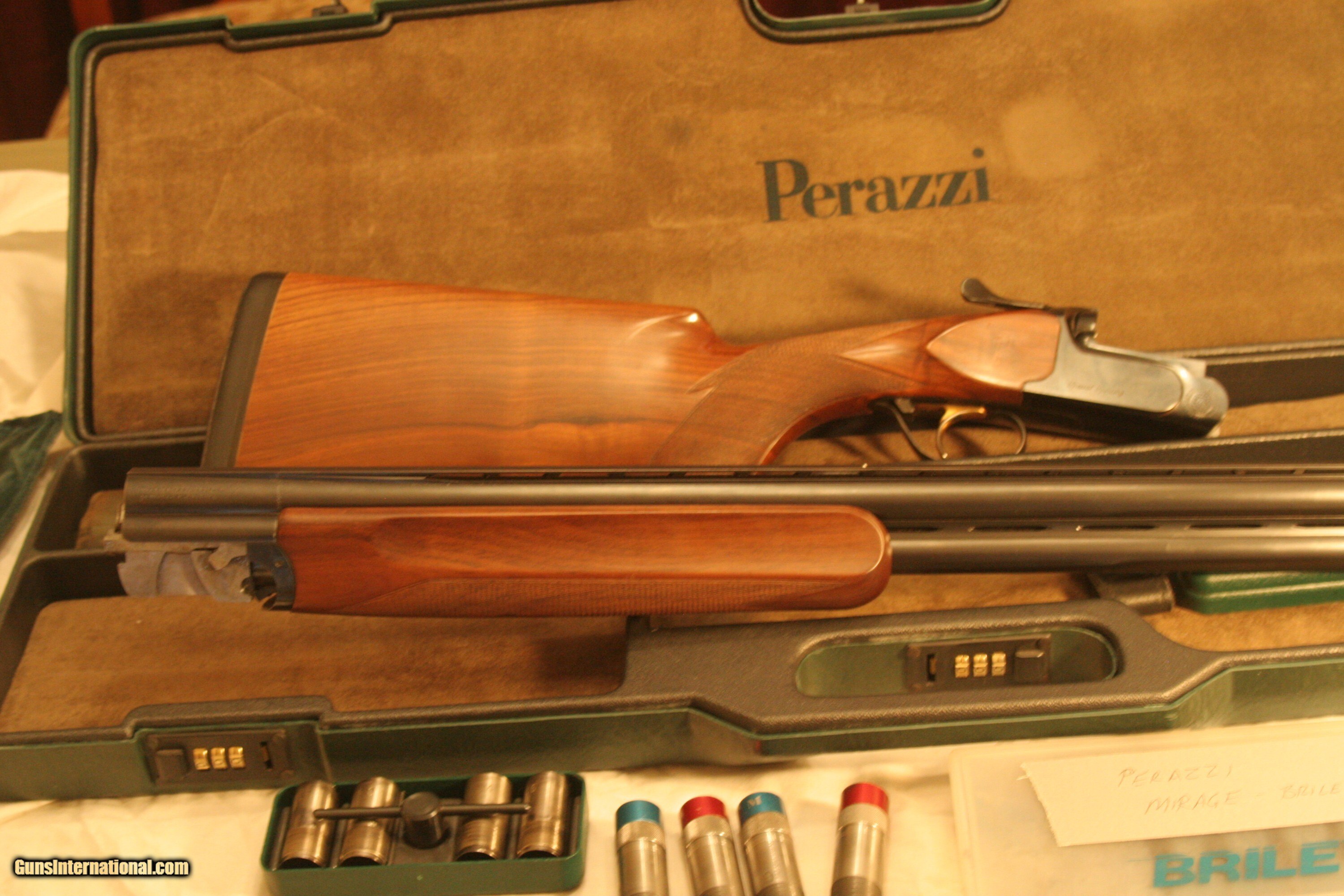 Description: 12 Gauge 31 ½" Barrels Factory Flush Chokes (0,0,2,4,6,8,10) Briley Extended Chokes (SKx2,ICx2,LMx2,Mx2,LFx2) Seminole Extended Chokes (Spreaderx2,IC,LM,M,IM,F,XF) Dimensions 1 5/16” x 1 7/8” Stock SN: 93377 (1995) 14 1/2" LOP, 3/4" Pad, 1.7Kg Barrels, Factory Case, Drop Out Trigger, Trigger Spring Kit Minor Bluing Wear on Forearm Bottom, Otherwise Very Good - $9700 Additional Schnabel Forearm & Adjustable Stock Available ($450) 12 Gauge 29 ½” Fixed Choke Live Bird Barrels, No Side Ribs, 1.47Kg, Bores .725, Chokes Bottom .029, Top .041, Case Live Bird Barrels Can be purchased separately $100 Shipping, Insurance to be Agreed Shotgun Gauge: 12 Gauge Manufacturer: Perazzi Model: Mirage S Serial Number: 93377 Barrel Length: 31 1/2 Ejectors: Yes Condition: Excellent Metal Condition: Very Good Wood Condition: Excellent Bore Condition: Excellent Barrels: 31 1/2 Triggers: Single Selective Stock: K80 Adjustable Stock Comb: 1 5/16 Stock Heel: 1 7/8 Butt Pad: 3/4 LOP: 14 1/2 Chokes: Screw In Case: Perazzi Price: $9,700.00 Shipping: $100.00 Contact Seller |