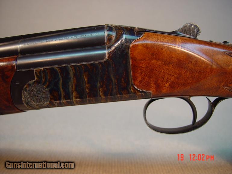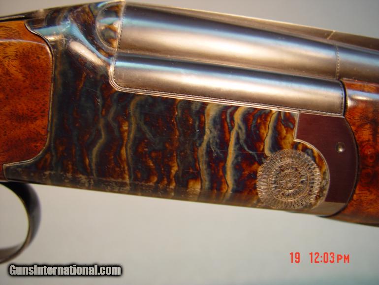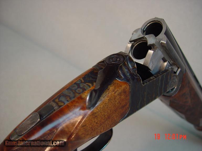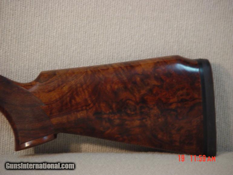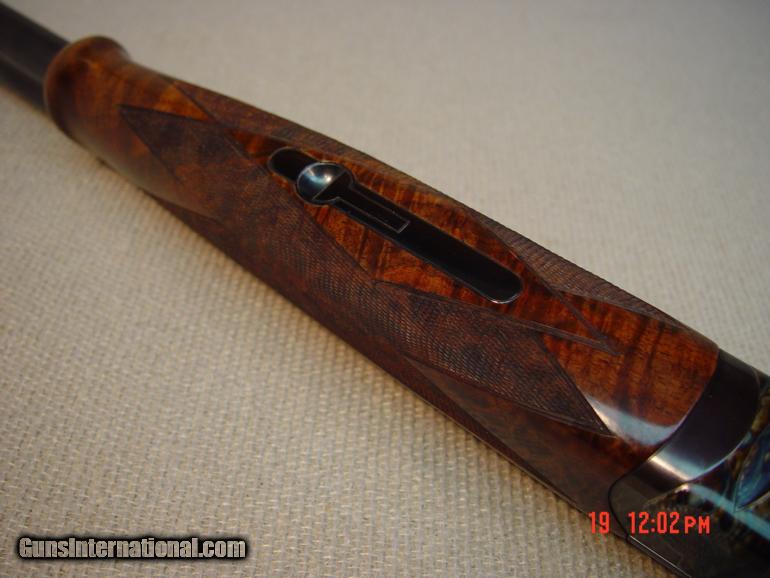 The receiver is beautiful, tiger striped, color case hardened steel. The barrels and receiver rate excellent with full color retained. Extra fancy, highly figured European walnut with a gloss finish is used for the raised comb, Monte Carlo stock and the Schnaubel forearm. The pistol grip features a palm swell for a right hand shooter and the trigger guard has been rolled for a right hand shooter. The wood finish is excellent.