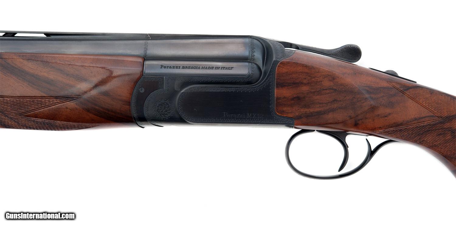 Description: Perazzi - MX-12 - 12 ga - Item Number: PER128060 Shotgun type: O&U Action: Boxlock Ejectors: Yes Trigger: Single Grip: Pistol Grip Forend: Checkered Lop: 15 " Pad thickness: 0.75 " Type of butt: Rubber Pad Drop comb: 1 3/8 " Drop heel: 2 " Cast amount: 1/8 " Cast: OFF Weight: 8 lbs, oz Manufactured in: Italy Manufacture Year: Finish: Blue Overall condition: Very Good Stock condition: Very Good Metal condition: Very Good Stock: Original finish Metal: Original finish Type of Case: Maker's ABS case Extra barrels: 0 Barrel info: Gauge: 12 ga Chamber: 3 " Length: 29 1/2 " Chokes: IC/M Rib type: Ventilated Comments : Gun is in great condition with a few light handling marks. SG-318 SOLD |