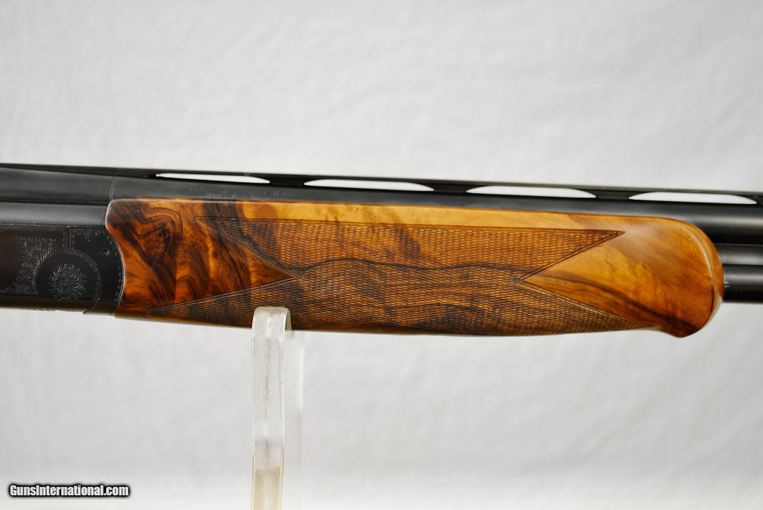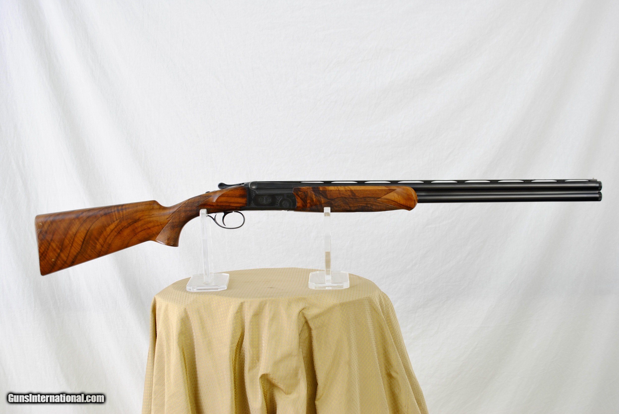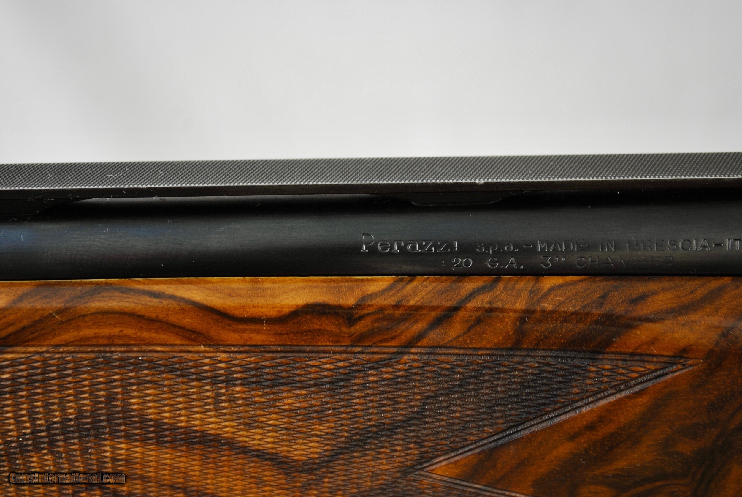 Description: Perazzi MX-20 Pachmayr with 26" Choke Tube Barrels. Imported by Pachmayr in very limited numbers, this is fixed trigger group Perazzi 20 gauge with coil main springs. Single selective trigger. Mirror bores measuring .621 with a #1 Choke Tube (4/1000) and a #2 (6/1000). These chokes woulld approximate Skeet and IC. No additional choke tubes or wrench are provided. Gun has 3" Chambers. Top rib has a small dent on right side toward the muzzle. Not visable when sighting. No looose ribs. All serial numbers are all matching. Gun is tight on face. Well figured wood. Stock has field wear with scatches and a few small dents as shown. Small start / stop crack in stock about 1/4" at bottom rear tang, not readily visable and has been epoxy repaired and reinforced (typical of Perazzi Guns of this time period). Checkered butt. Stock is reovable with normal Perazzi Stock Wrench. Weight of gun is 6 LBS 13 1/2 OZ. LOP is 14 7/16". Drop at Comb l is 1 3/8". Drop at Heel is 2 3/8". Gun is not cased. Shipping is $50. SOLD Shotgun Gauge: 20 Gauge |