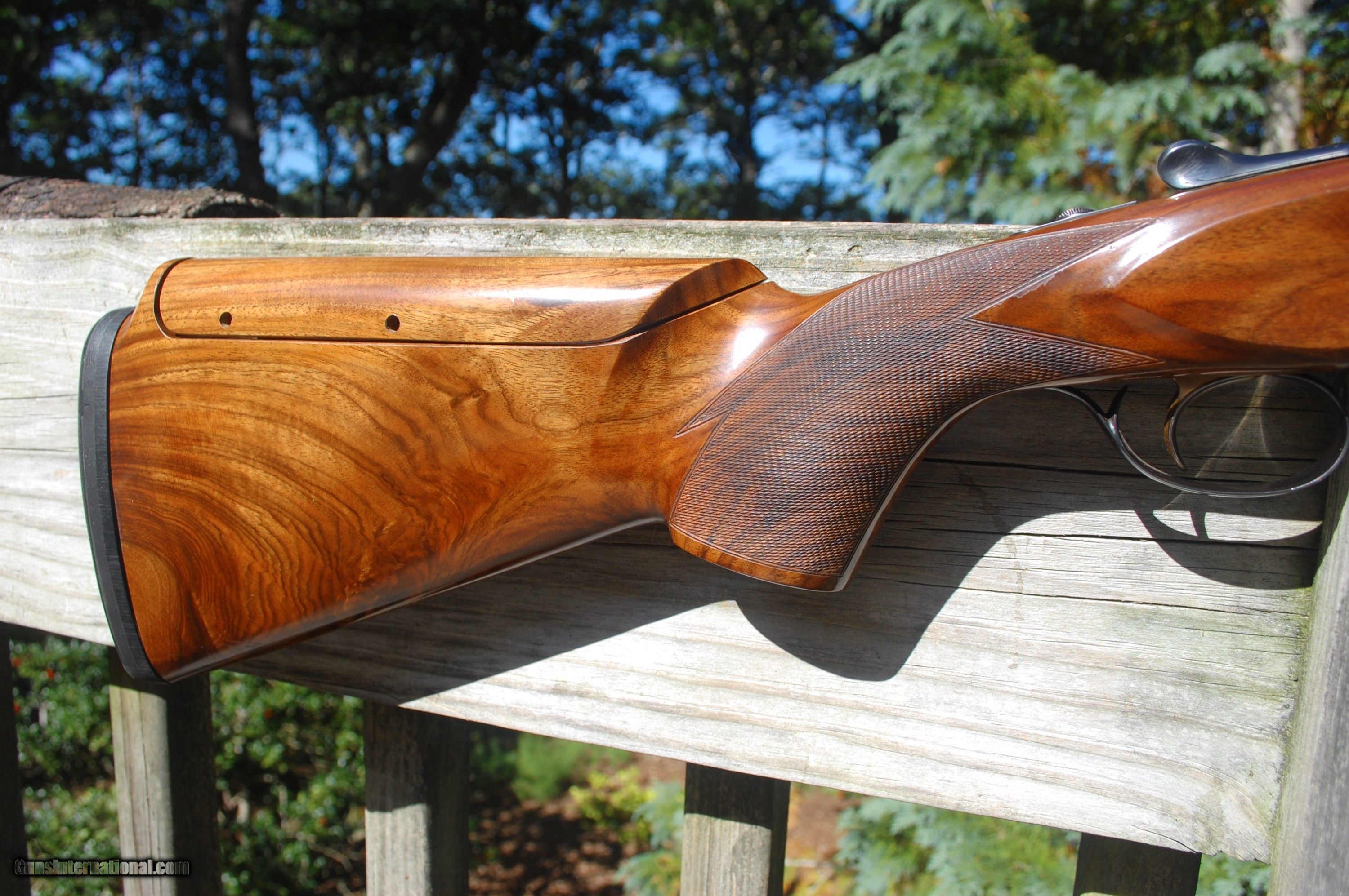 Description: Perazzi MX 2000S with 34" bbl. flat Tramline rib, highly figured English Walnut stock custom made by Dale Venne with Tron adjustable comb, includes origonal Perazzi stock with dimensions (1 1/2", 2 1/4", 14 3/4", cast off), seven Briley S2 Spectrum Thin Wall chokes (C, C, S, IC, LM, LM, IM), barrels wt. 1642 gr., gun balances on the hinge pin, excellent condition, cased. SOLD |
