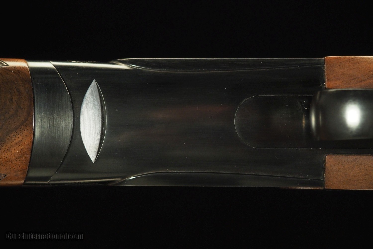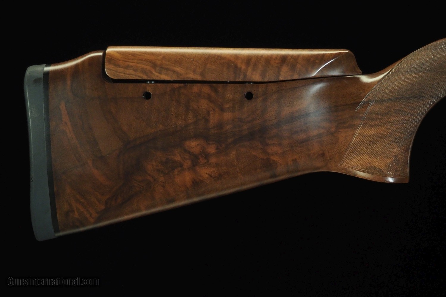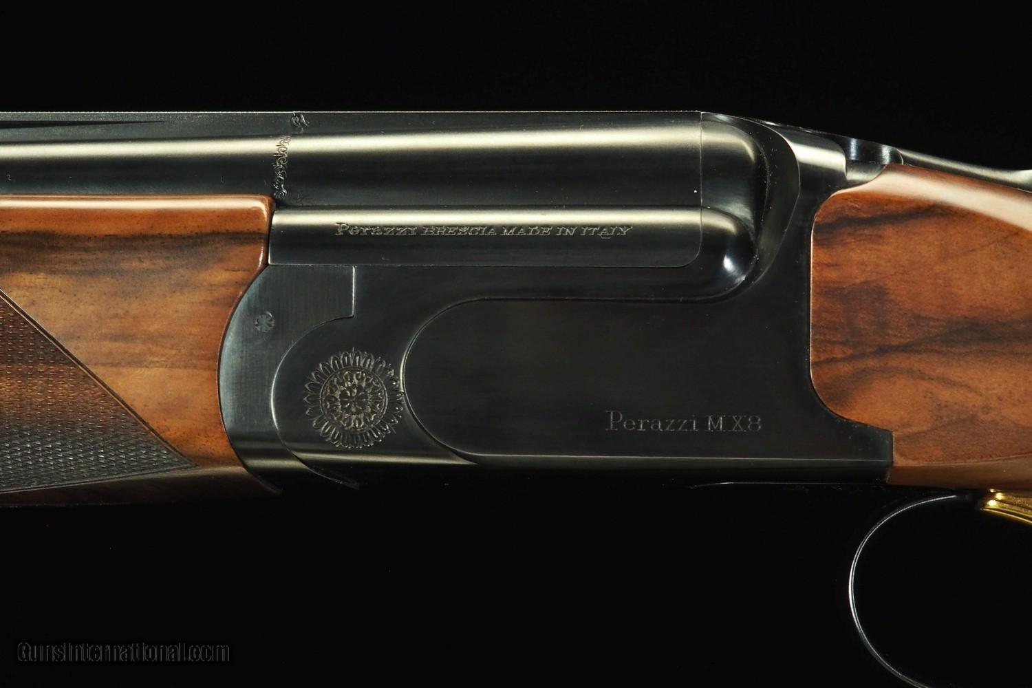 Description: **Sale Pending** Perazzi MX-8, 12 bore, 29 7/8" barrels with machined flat parallel 7/16" wide x 1/4" high vent rib with front and mid beads, fixed chokes .024 IM and .034 Full, 8 lbs. 13 oz., single non-selective trigger, non-automatic safety, 4 3/4" LOP over a Perazzi pad, pistol grip with right hand swelled palm, 3" chambers, nicely figured European walnut stock with adjustable comb, 1/8" cast off, boxlock action with removable flat spring trigger group. Very near new condition gun showing virtually no use or wear. Comes with original grey dual sided Perazzi case with all tools, paperwork including yet to be filled out warranty registration, and spare main springs and firing pins. SOLD |