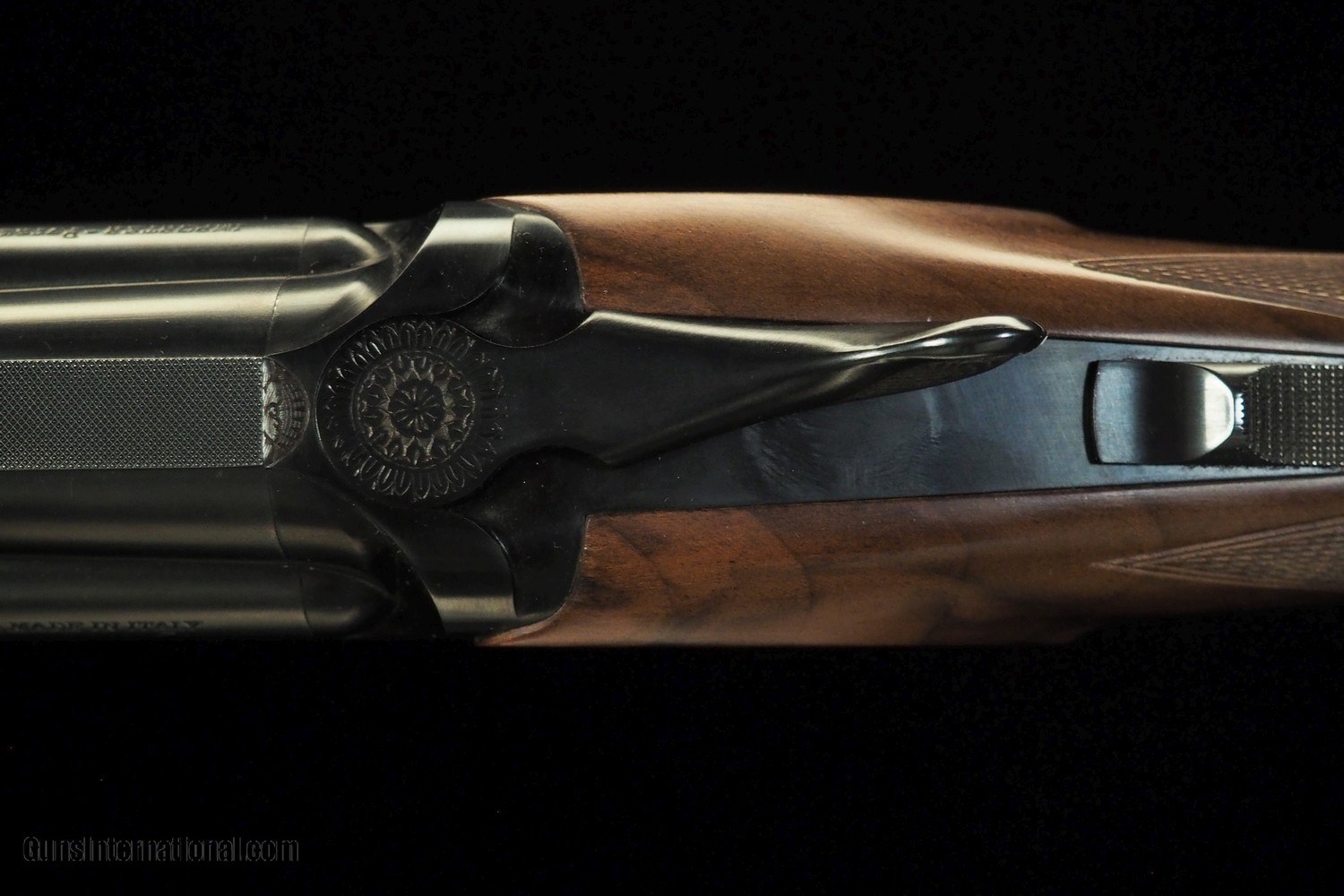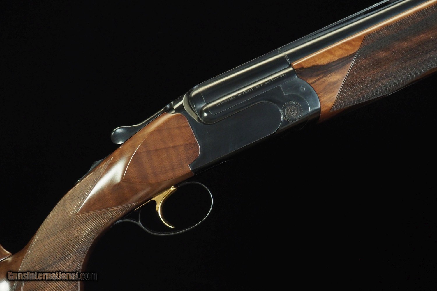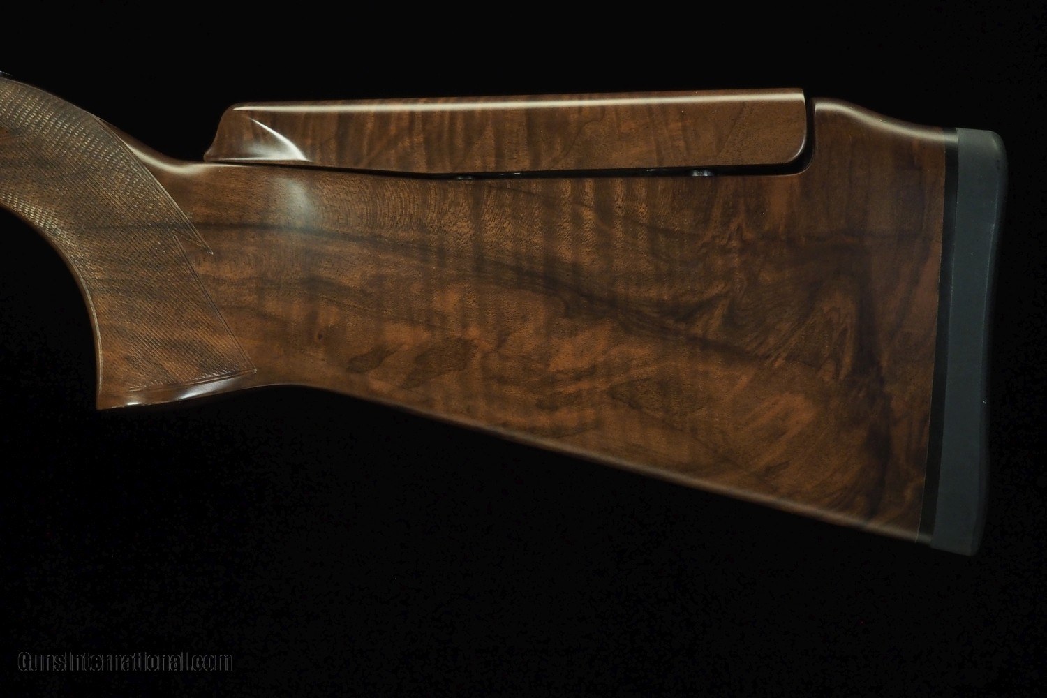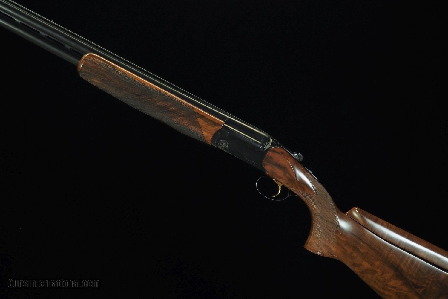 Description: **Sale Pending** Perazzi MX-8, 12 bore, 29 7/8" barrels with machined flat parallel 7/16" wide x 1/4" high vent rib with front and mid beads, fixed chokes .024 IM and .034 Full, 8 lbs. 13 oz., single non-selective trigger, non-automatic safety, 4 3/4" LOP over a Perazzi pad, pistol grip with right hand swelled palm, 3" chambers, nicely figured European walnut stock with adjustable comb, 1/8" cast off, boxlock action with removable flat spring trigger group. Very near new condition gun showing virtually no use or wear. Comes with original grey dual sided Perazzi case with all tools, paperwork including yet to be filled out warranty registration, and spare main springs and firing pins. SOLD |