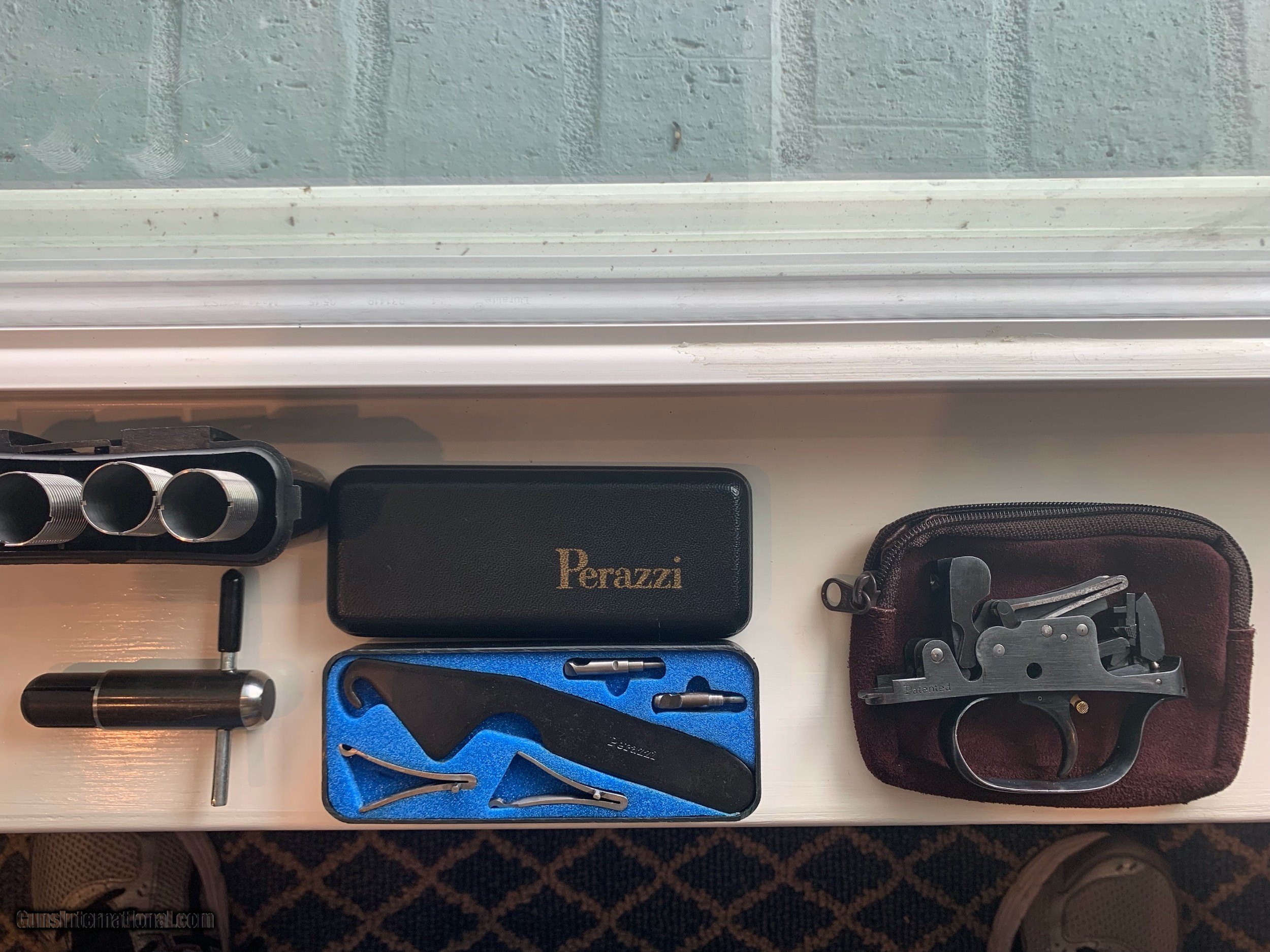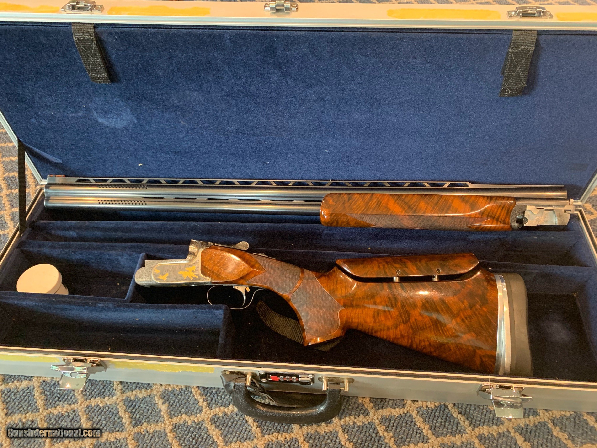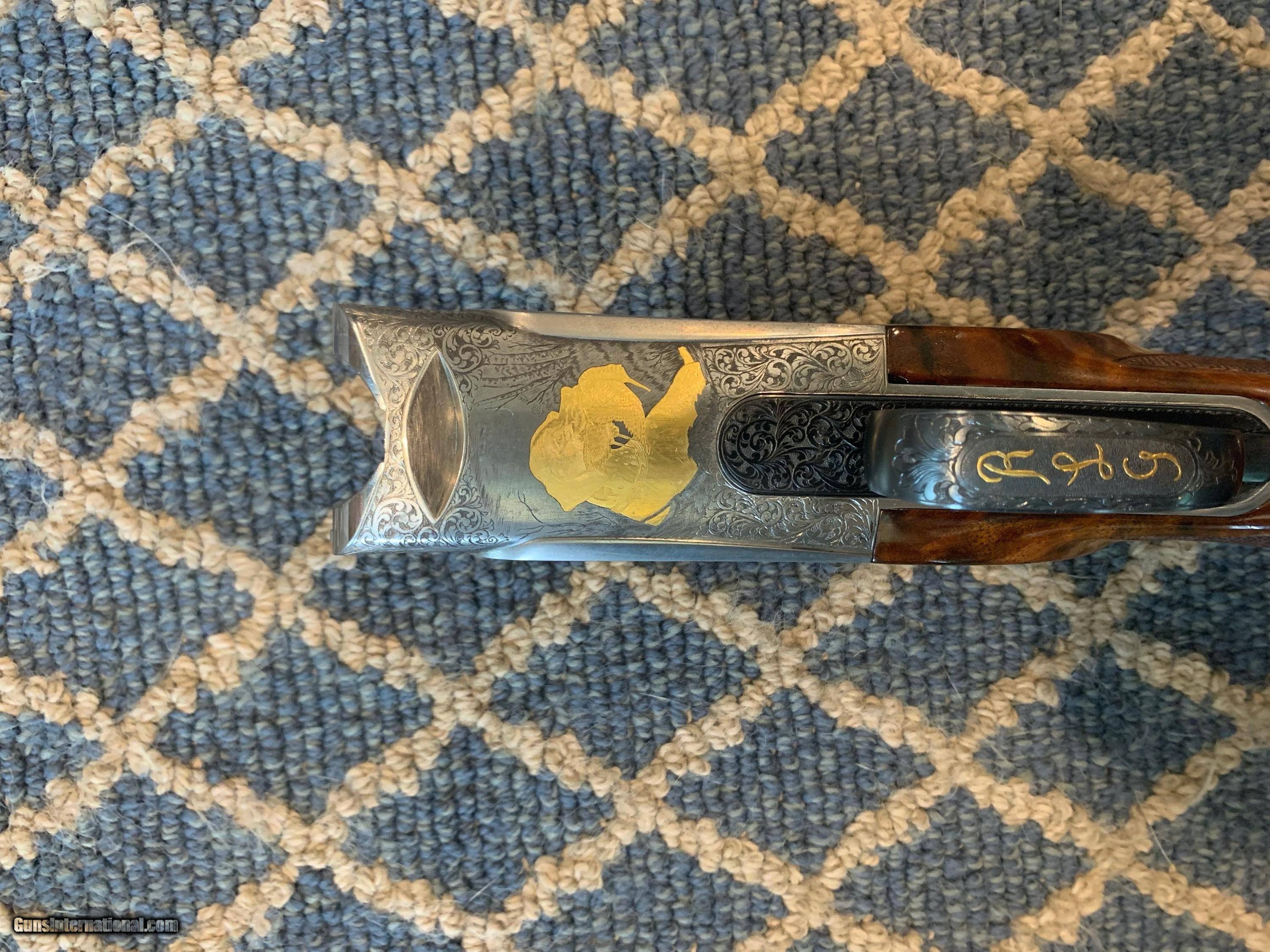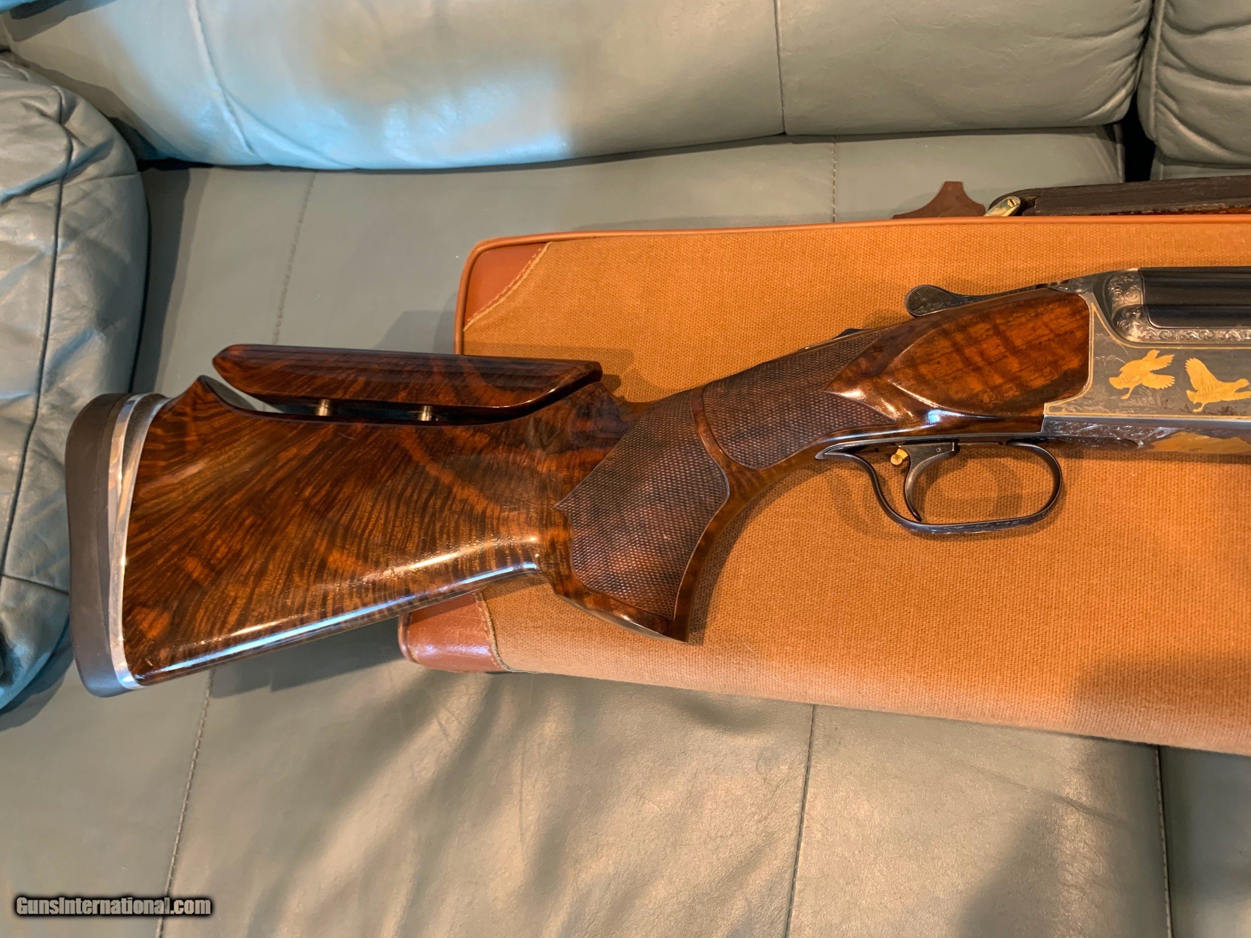 Description: Perazzi MX 8 SCO Gold, engraved by Positti; 29 1/2" barrel -ported & back bored with Kolar skeet tubes 20, 28 & .410. 1-20 ga. briley tube replaced 1-20 ga. Kolar tube. Perazzi 12 ga. screw in chokes (5): (S-1 .720, S-1 .720. S-1 .715, IMP Cyl, Mod. .705 ,& Full .690) with choke tool. Custom Turkish Exhibition Stock (Adjustable comb and butt plate) right hand palm swell. Two removable adjustable triggers and 1 extra perazzi spring/firing pin set and Kolar weight equalizer. Fitted Americase for shotgun and skeet tubes. Gun is in excellent condition with one slight forend crack (epoxied by stock refinisher) almost unnoticeable and 1 small scratch on underside of pistol grip (See Photos) SOLD Shotgun Gauge: 12 Gauge Manufacturer: Perazzi Model: MX8 SCO Gold Serial Number: Pxxxx59 Barrel Length: 29 1/2 Condition: Excellent Metal Condition: Excellent/VG Wood Condition: Excellent/ VG Bore Condition: Excellent Action: O/U Stock Drop: adjustable Stock Comb: adjustable Stock Heel: adjustable Rib: vent |