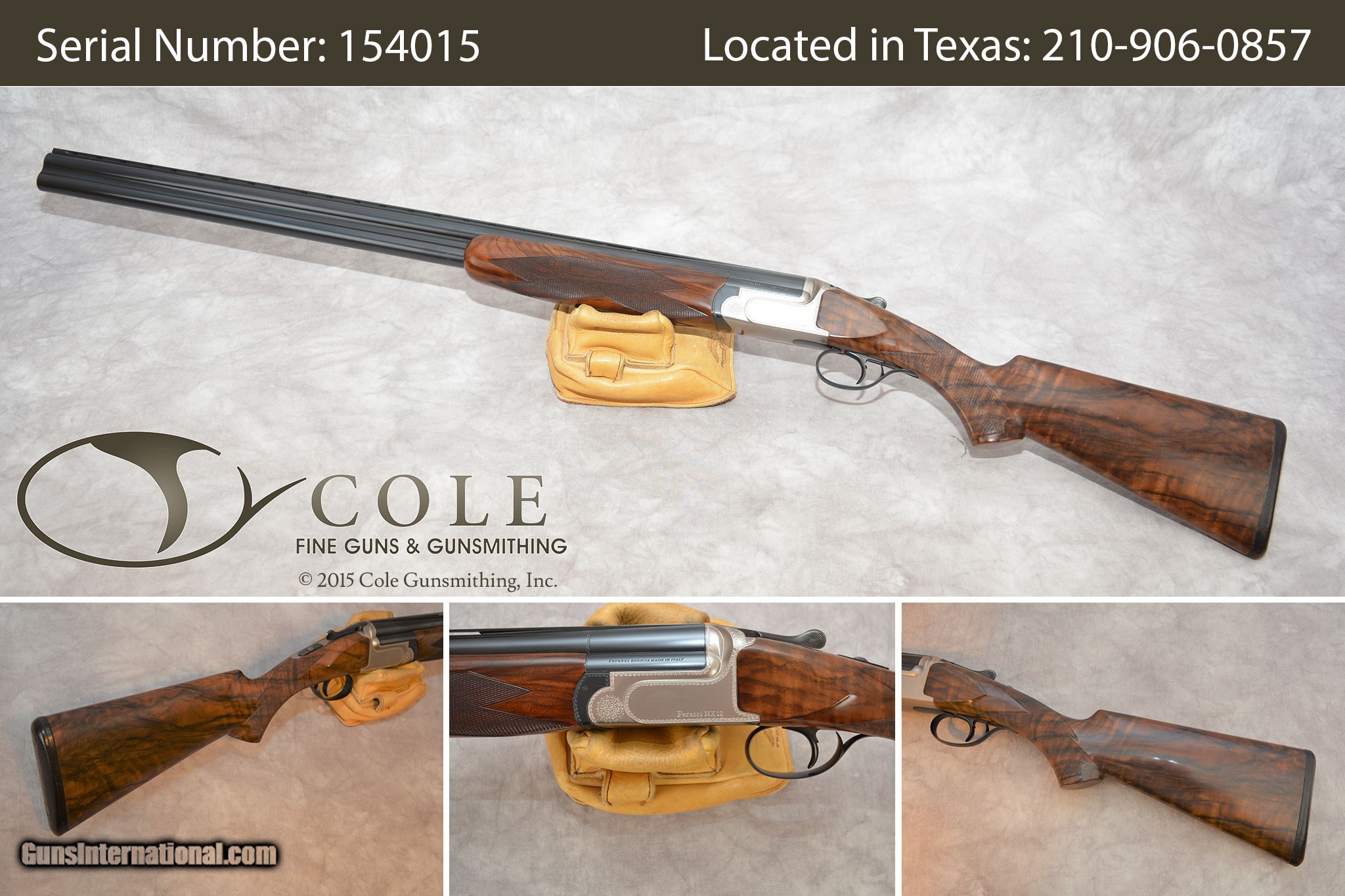 Description: Perazzi MX12 30 inch Offering this fine used Perazzi MX 12 serial # 154015. The gun wears 30-inch barrels which are factory fix choked at .6895 the bottom and .6895 the top. The low straight ventilated rib is 7mm wide. Drop at comb is 1.5 inches, while drop at heel is 2 inches. The gun has a length of pull 14.25 from the trigger terminating at the edge of the leather covered butt pad. The gun is right hand cast with no palm swell. The gun weights 8lbs even. The wood on this particular firearm is a significant factory upgrade from typical standard Perazzi wood. It exhibits some fine color and contrast in the grain. It does have a few very minor safe kisses from storage and use afield. There is a small bit of bluing wear just in front of the forend. The receiver is treated to a light scallop engraving enhancement along the border with an ivy leaf rosette on the hinge points of each side. The gun is factory cased and comes with its owner’s manual, stock tool, Perazzi snap caps, decal and patch as well as the original cloth sleeves for the receiver and barrel. Our newest Cole Fine Gun and Gunsmithing location is now open in San Antonio Texas at the National Shooting Center (NSC), 5931 Roft Rd. We are located on Vendors row Unit 31. Store hours are Wednesday through Saturday 9:30 to 5:30. If your schedule should prohibit you from coming in during our posted hours, please allow us to make ourselves available other days and times by appointment. Do not hesitate to call Tobias at 210-906-0857 if you require an alternative time to view our inventory. Three day non firing inspection period as to posted condition. All firearms will be sold and transferred in compliance with all state and federal regulations via BATF Form 4473. Firearms sold via themay only be shipped to licensed FFL for transfer via BATF Form 4473. SOLD Manufacturer: Perazzi Model: MX12 Serial Number: 154015 Barrel Length: 30 Chambers: 2 3/4 inch Ejectors: Automatic Condition: 98% Metal Condition: 98.5% Wood Condition: 98 Bore Condition: Excellent Barrel Type: Steel Action: Over Under Triggers: Single Gauge Info: 12 Stock Comb: 1.5 Stock Heel: 2 Butt Pad: Leather LOP: 14.25 Rib: 7mm Ventilated Flat Case: Factory Item Location: San Antonio Texas |