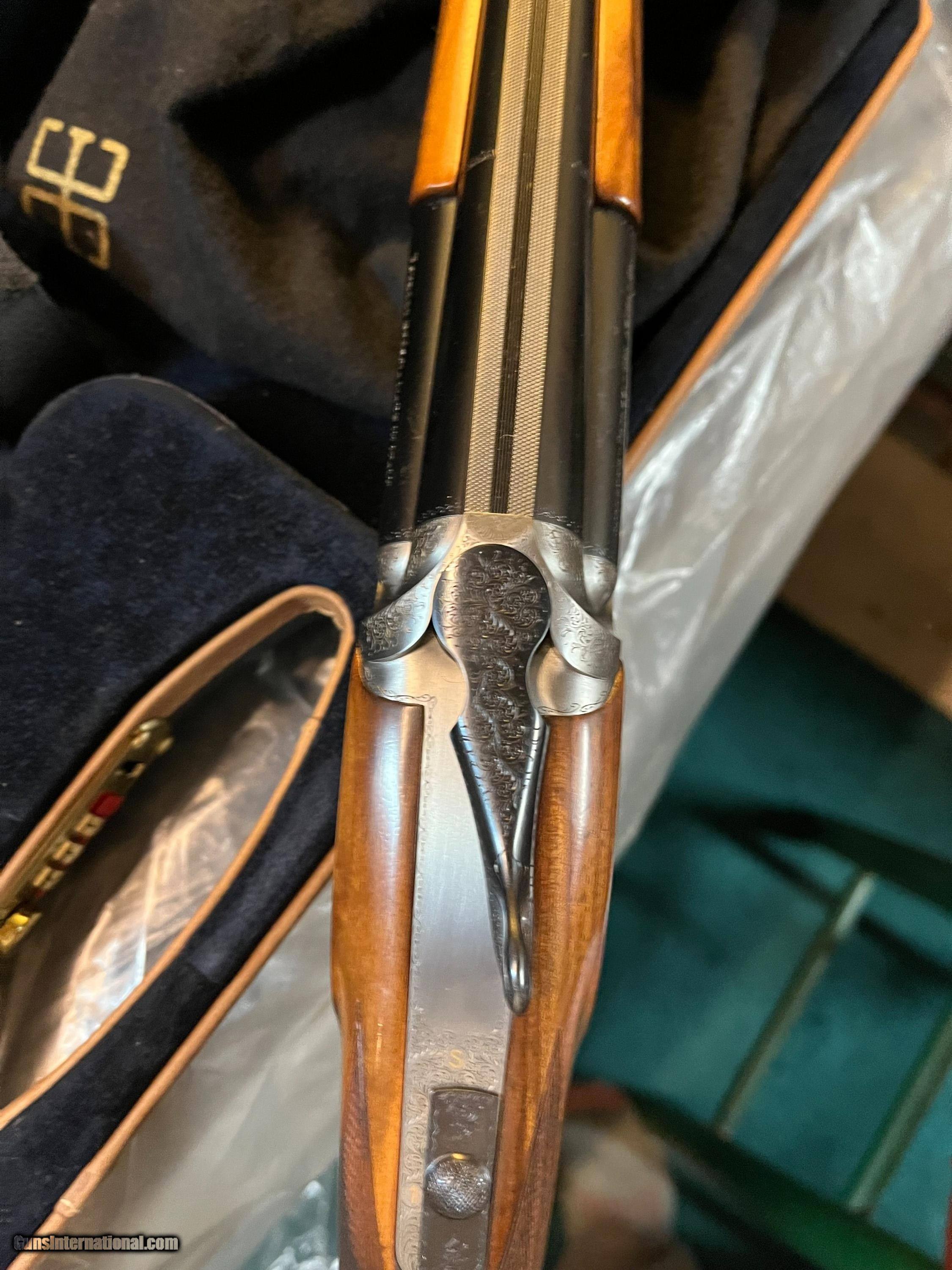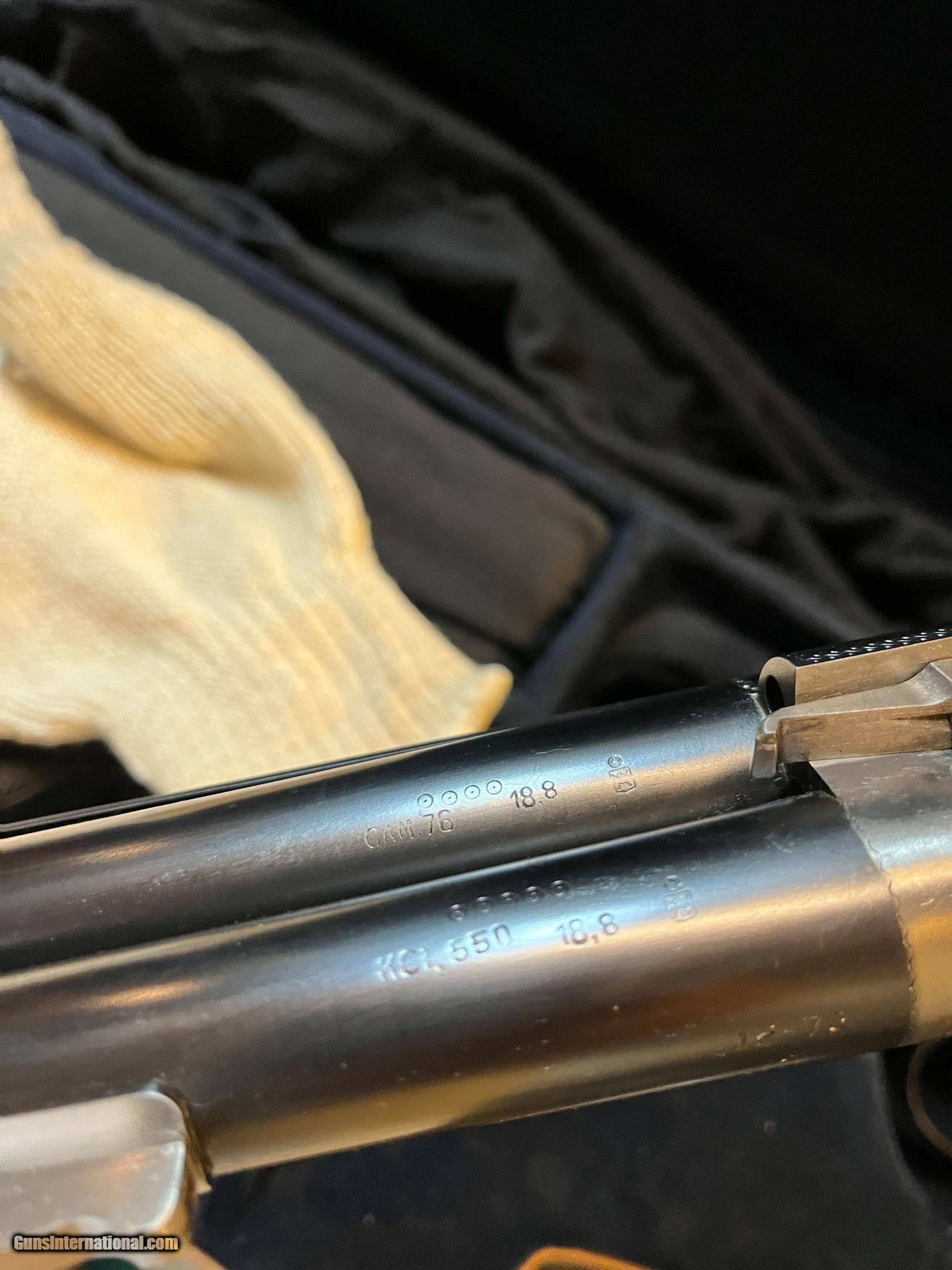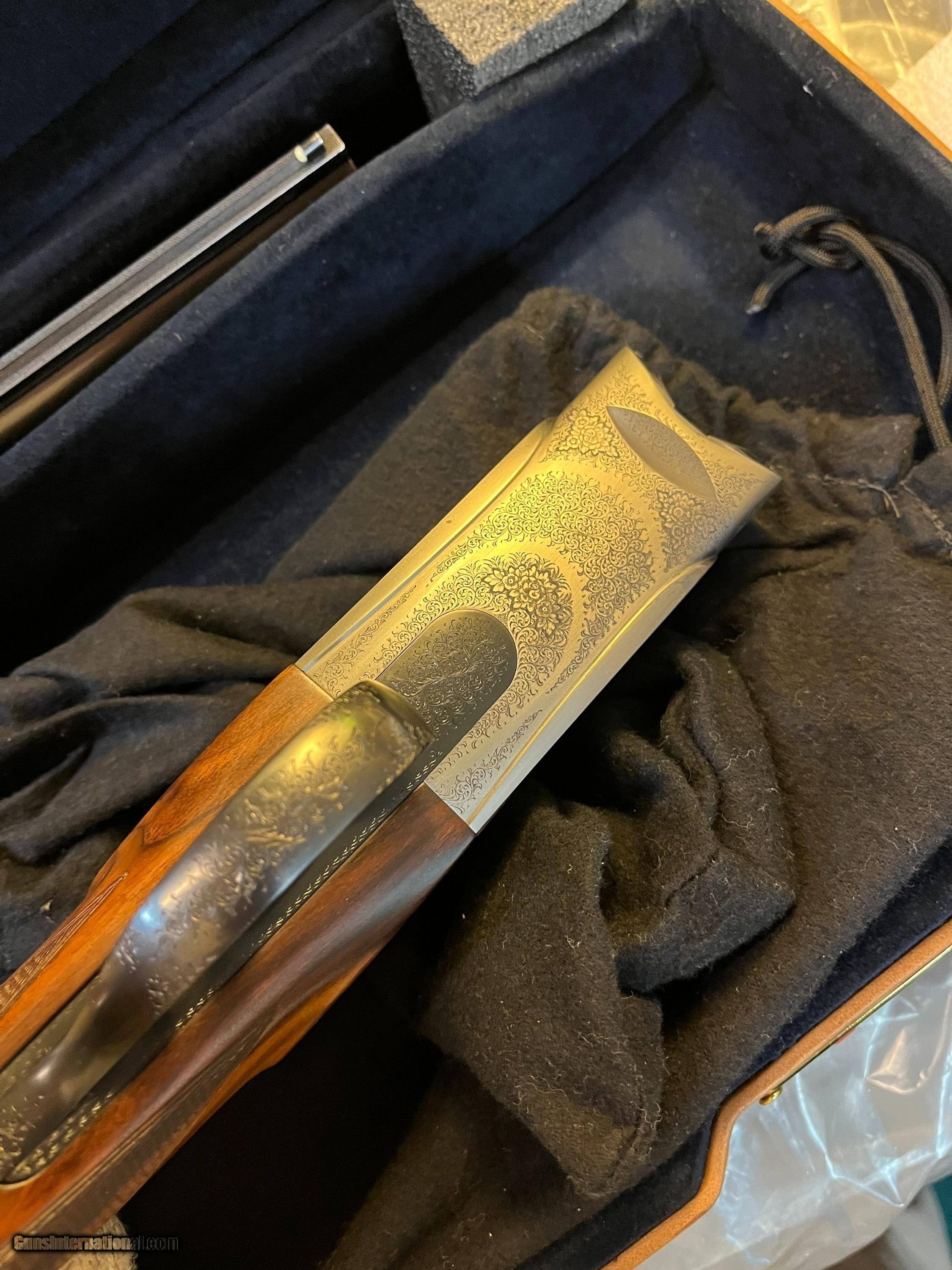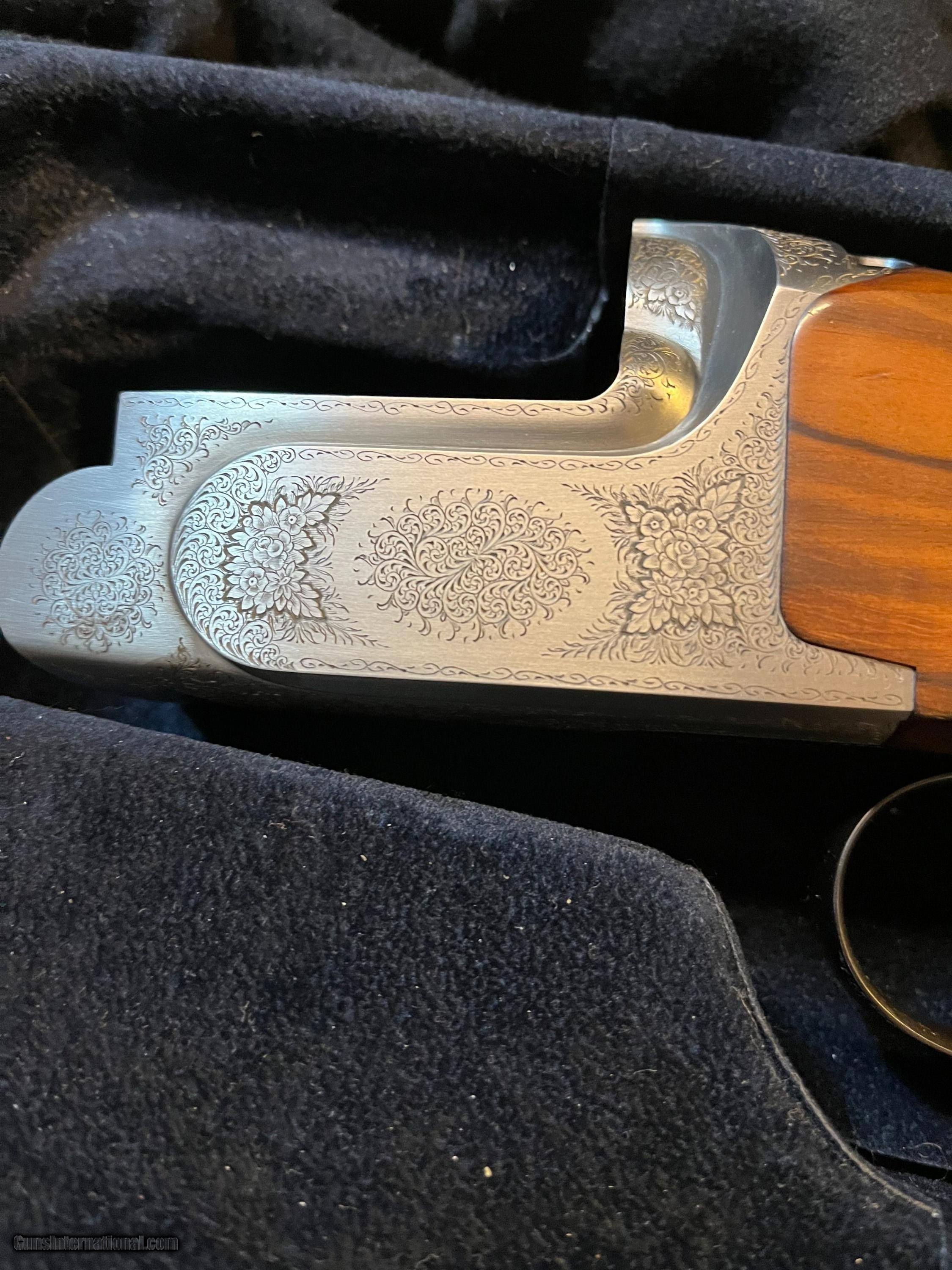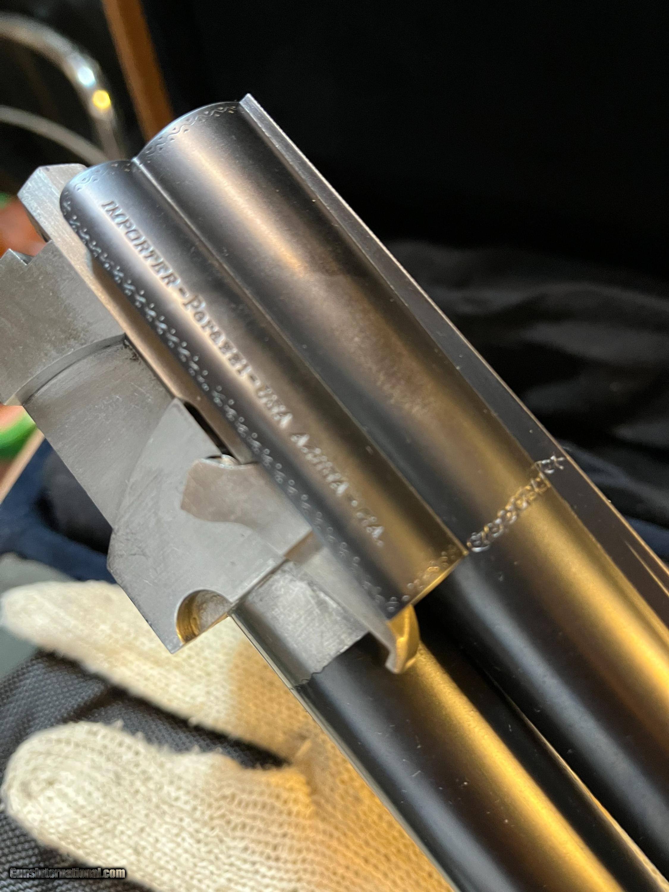Description: Excellent plus/as-new, hardly used, tight, custom ordered MX12 SC3 grade with factory competition bored (over-bored) 31 1/2" barrels at 18.8 mm (1.550KG weight). Chokes are .013 and .020 (LMod and TMod). 11mm x 7 mm tapered, flat tramline rib with side ventilation. SC3 #1 engraving pattern (tight English scroll and bouquets) signed by the master Narcissi. Upgraded wood with very strong straight figure in beautiful honey and chocolate tones, English style fully checkered sporting/field forearm matches the stock perfectly. Stock dimensions are 14 3/4in LOP, 1 3/8in DAC and 1 7/8in DAH. Overall weigth is 8 lbs, 5 oz. Single selective trigger. Original factory SC3 hard case with stock tool and factory socks. A beautiful, great balanced clays (or pheasant!) crusher with great patterns and light felt recoil due to the special boring. Truly a gun anyone would be proud to own and shoot. SN 1347xx. This gun would cost well over $21,000 to replace/order today. SOLD Shotgun Gauge: 12 Gauge Manufacturer: Perazzi Model: MX12 SC3 grade Serial Number: 1347xx Barrel Length: 31.5 Bore: 18.8 Chambers: 2 3/4 Ejectors: Y Condition: Exc/as-new Metal Condition: as-new Wood Condition: Exc Bore Condition: perfect Barrels: vented Action: MX12 OU Triggers: single selective Stock: Turkish walnut Stock Dimensions: 14 3/4 LOPx 1 3/8 x 1 7/8 Stock Comb: 1 3/8 Stock Heel: 1 7/8 Stock Cast: off Fore End: English style sporting with full checkering Butt Pad: factory rubber LOP: 14 3/4 Rib: 7mmx11mm tapered flat tramline Weight: 8 lbs, 5 oz Manufacture Date: Date code BZ Chokes: fixed- .013 lower and .020 upper Engraving: full hand engraving by noted master Extras: Comp bored and regulated like today’s hi-tech models Case: factory (as-new) SC3 hardcase |