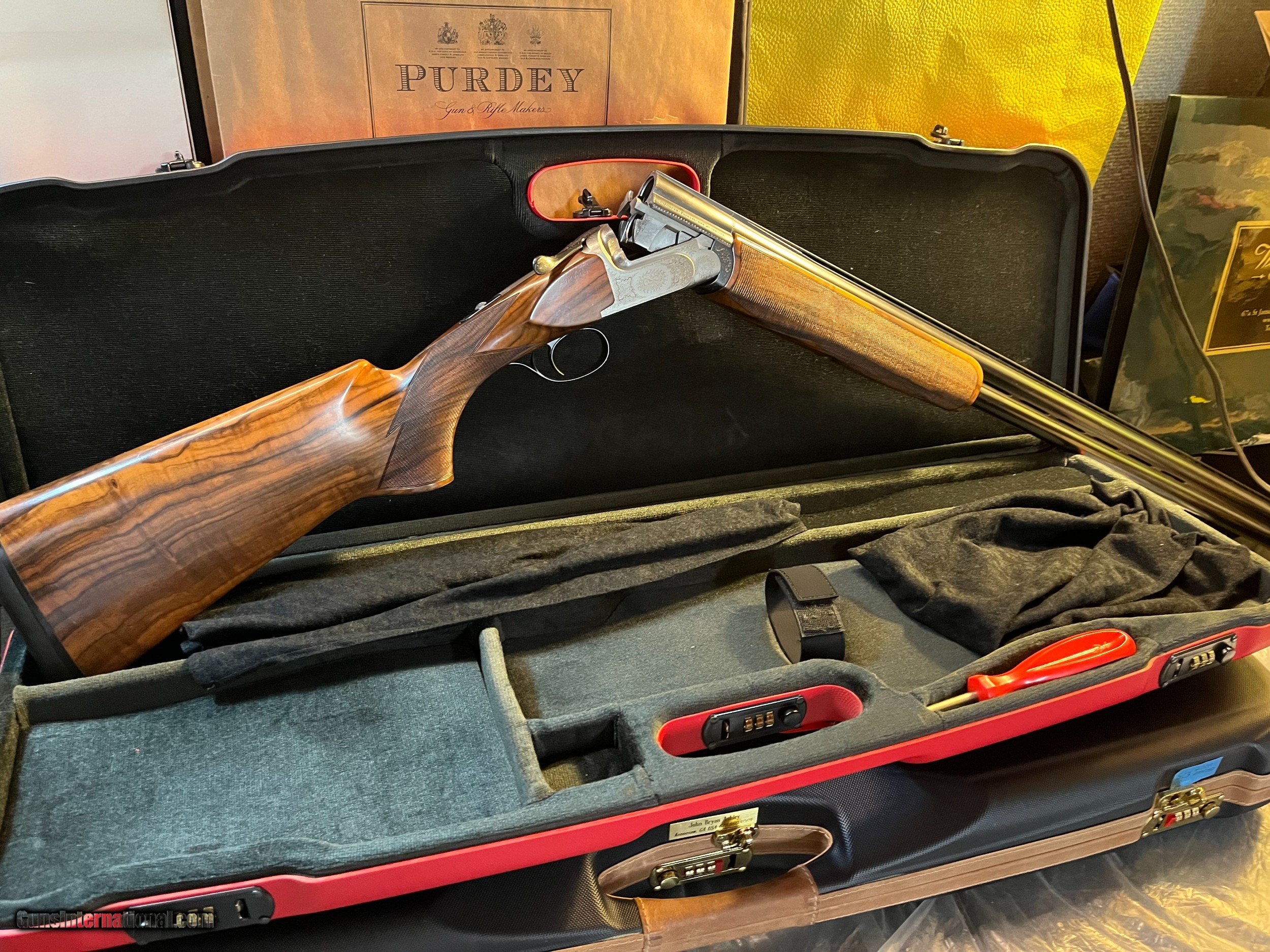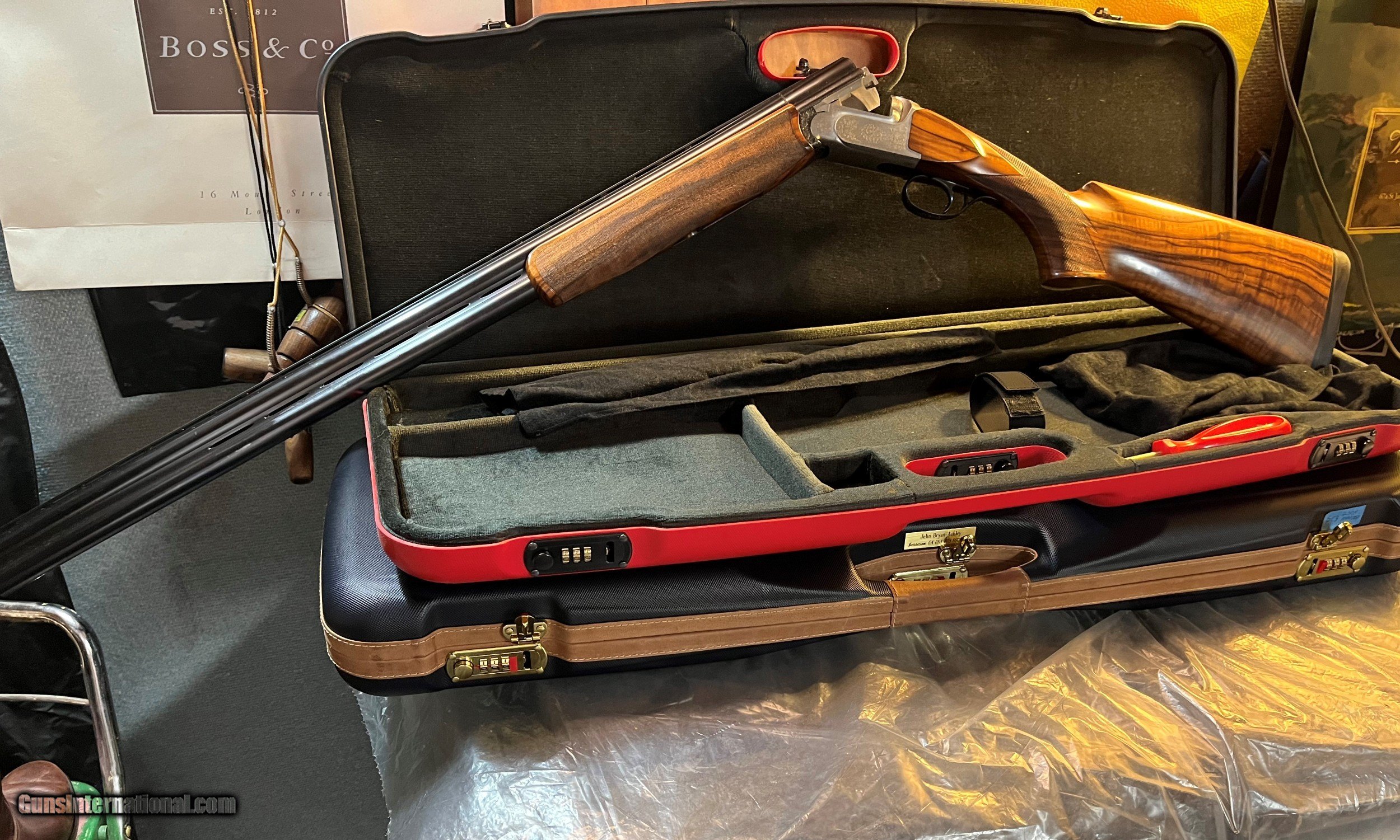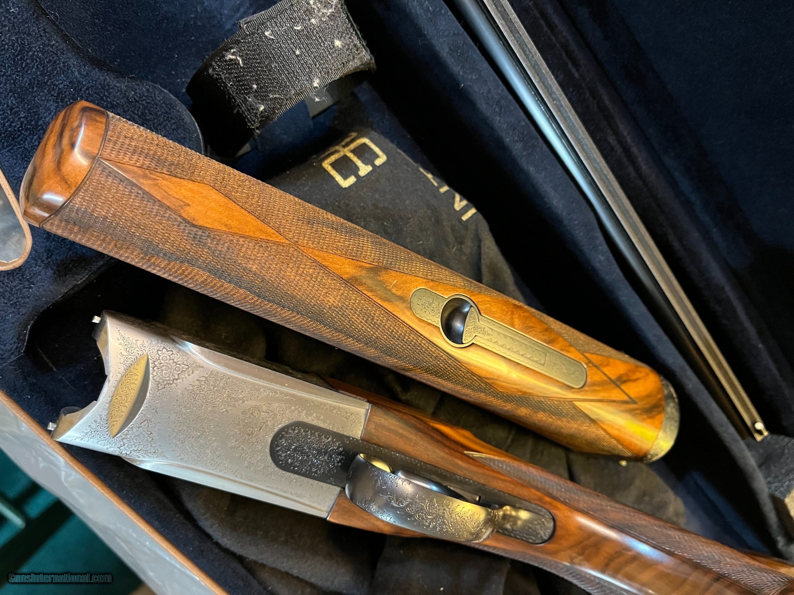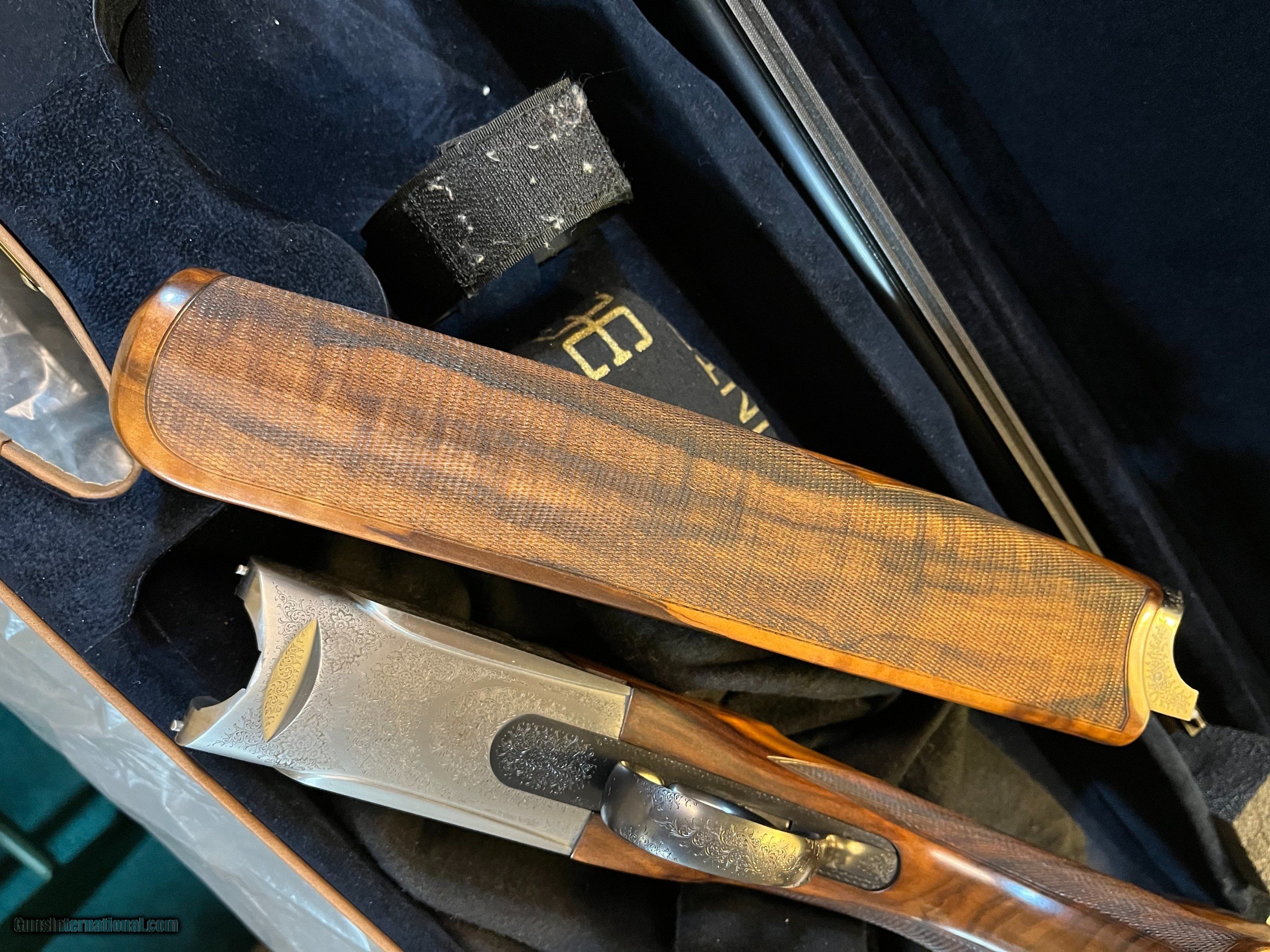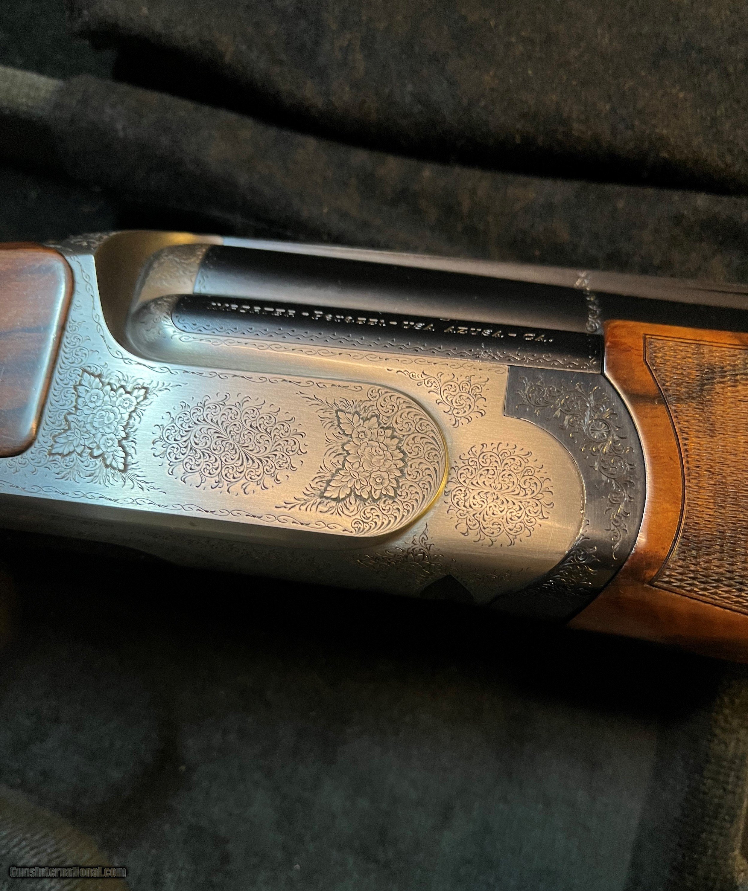 Description: Excellent plus/as-new, hardly used, tight, custom ordered MX12 SC3 grade with factory competition bored (over-bored) 31 1/2" barrels at 18.8 mm (1.550KG weight). Chokes are .013 and .020 (LMod and TMod). 11mm x 7 mm tapered, flat tramline rib with side ventilation. SC3 #1 engraving pattern (tight English scroll and bouquets) signed by the master Narcissi. Upgraded wood with very strong straight figure in beautiful honey and chocolate tones, English style fully checkered sporting/field forearm matches the stock perfectly. Stock dimensions are 14 3/4in LOP, 1 3/8in DAC and 1 7/8in DAH. Overall weigth is 8 lbs, 5 oz. Single selective trigger. Original factory SC3 hard case with stock tool and factory socks. A beautiful, great balanced clays (or pheasant!) crusher with great patterns and light felt recoil due to the special boring. Truly a gun anyone would be proud to own and shoot. SN 1347xx. This gun would cost well over $21,000 to replace/order today. SOLD Shotgun Gauge: 12 Gauge Manufacturer: Perazzi Model: MX12 SC3 grade Serial Number: 1347xx Barrel Length: 31.5 Bore: 18.8 Chambers: 2 3/4 Ejectors: Y Condition: Exc/as-new Metal Condition: as-new Wood Condition: Exc Bore Condition: perfect Barrels: vented Action: MX12 OU Triggers: single selective Stock: Turkish walnut Stock Dimensions: 14 3/4 LOPx 1 3/8 x 1 7/8 Stock Comb: 1 3/8 Stock Heel: 1 7/8 Stock Cast: off Fore End: English style sporting with full checkering Butt Pad: factory rubber LOP: 14 3/4 Rib: 7mmx11mm tapered flat tramline Weight: 8 lbs, 5 oz Manufacture Date: Date code BZ Chokes: fixed- .013 lower and .020 upper Engraving: full hand engraving by noted master Extras: Comp bored and regulated like today’s hi-tech models Case: factory (as-new) SC3 hardcase |