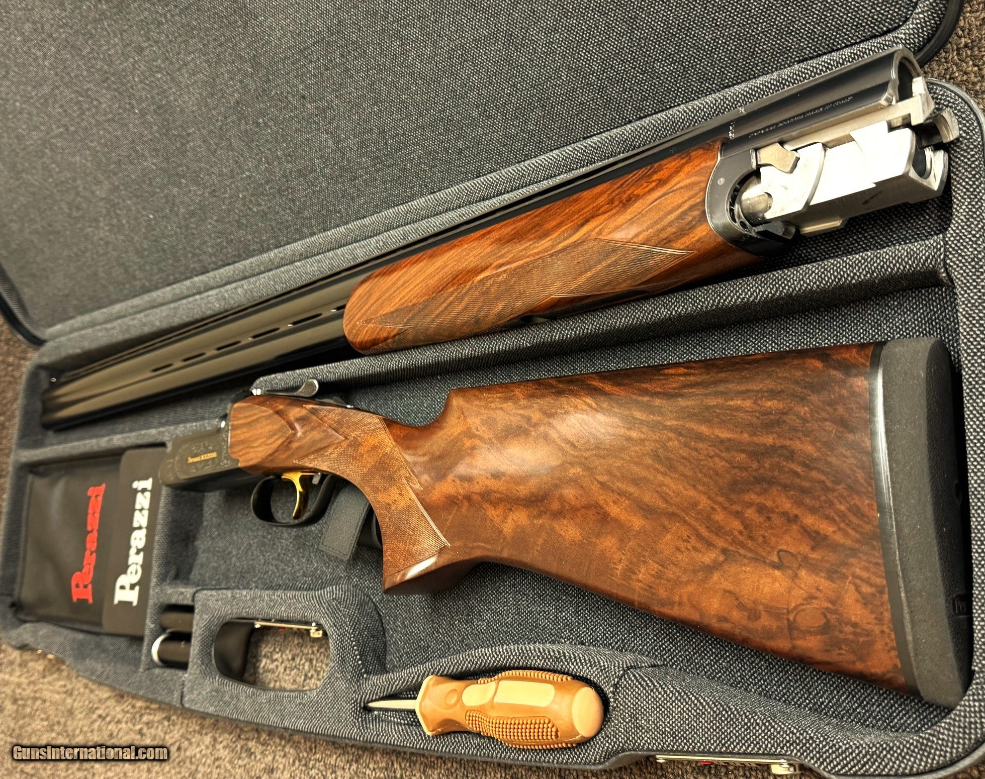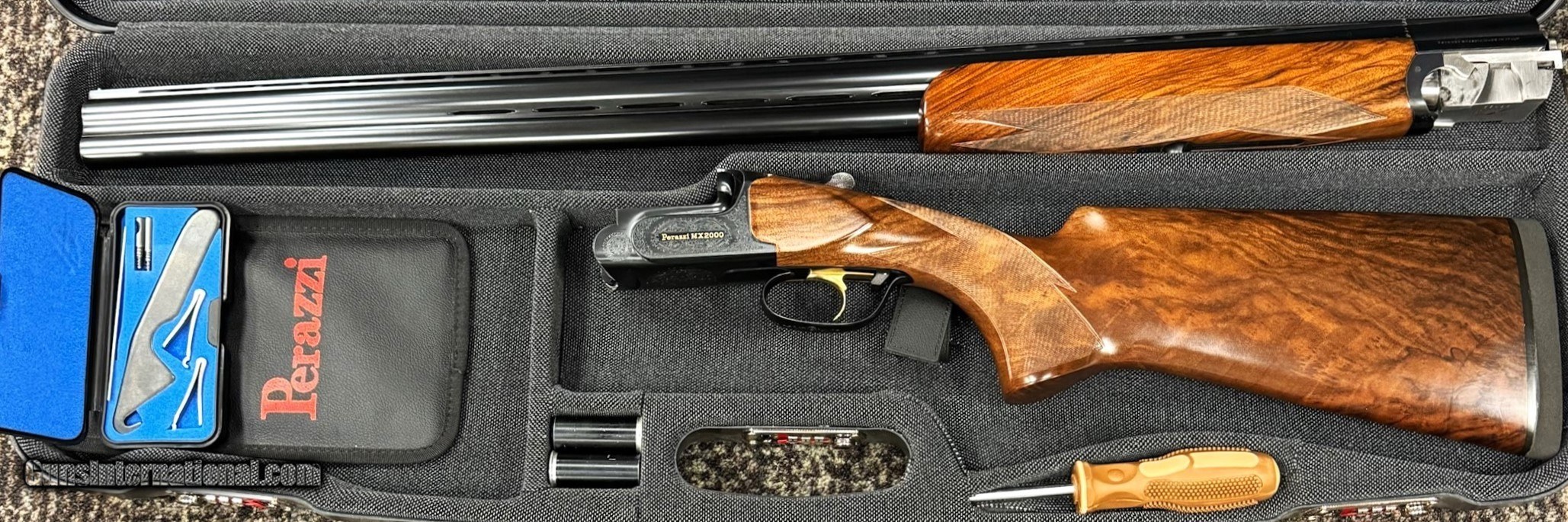 Description: Pre owned MX2000/8 Sporting Model - engraved and signed by Gerri - equipped with drop out trigger with flat springs and barrel selector - 11mm x 7mm flat, non tramline rib - fixed choke M/IM (.020/.024) 1.590KG/18.7 - SC2 wood - Right hand sporting stock - 1/2 checkered English forend - Stock dimensions are: 1 3/8" x 2 1/4" x 15" - all accessories - paperwork - factory case - MFG 2023 - This single owner Perazzi is un altered since it left the factory - all numbers match - You must look closely to find any handling marks - action is tight and remains in excellent condition - Ser#166495Note: 32" fixed choke (IM/F) 28 ga barrel available for an additional $4,800 and has been fit to the gun. In addition a like new Perazzi spare trigger group with selector and coil springs is available for an additional $1,200 and is in Like New condition SOLD |