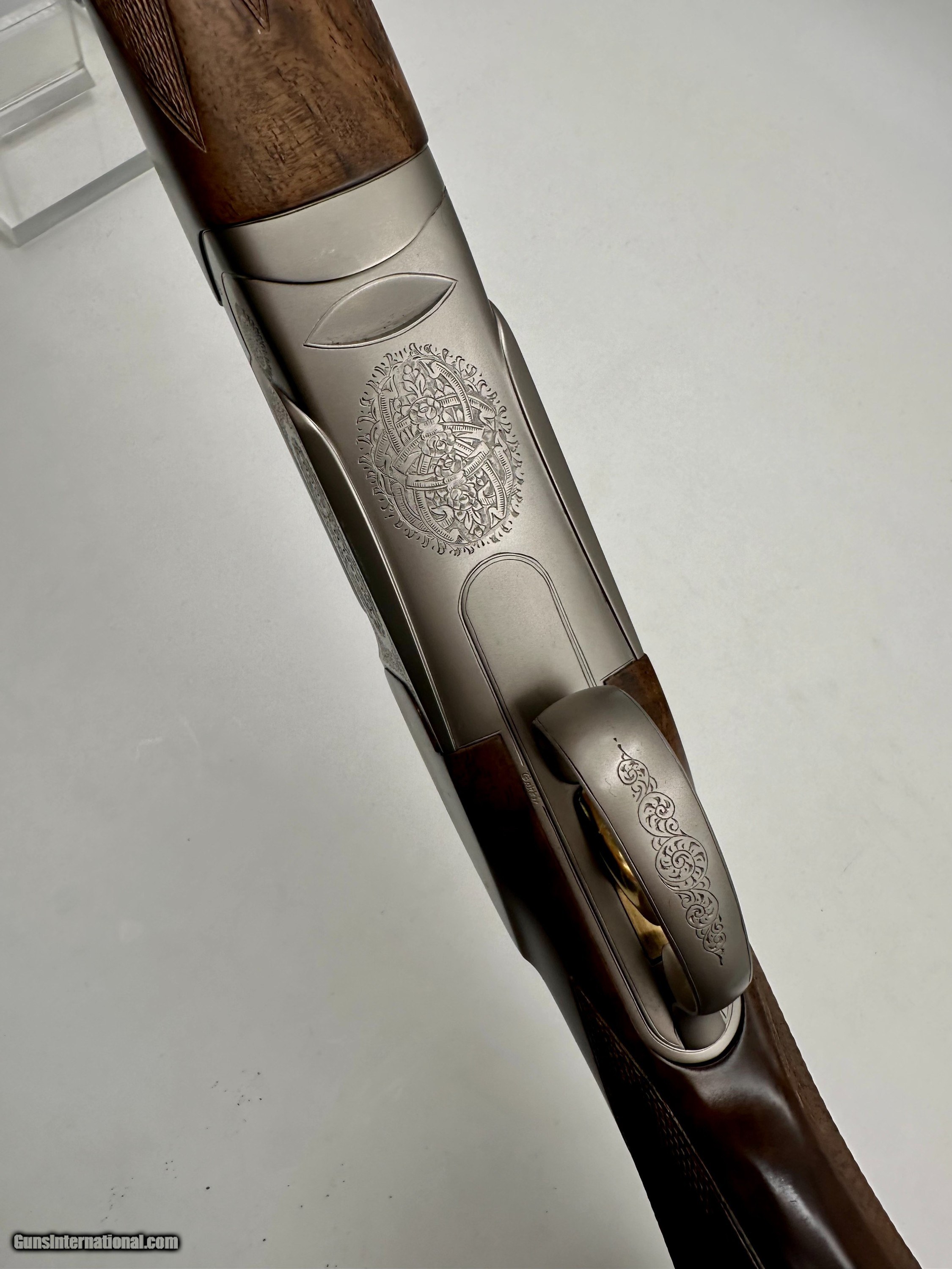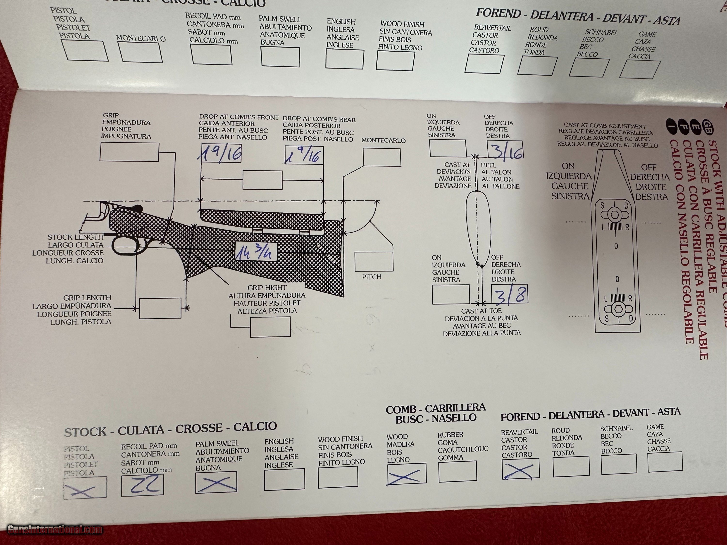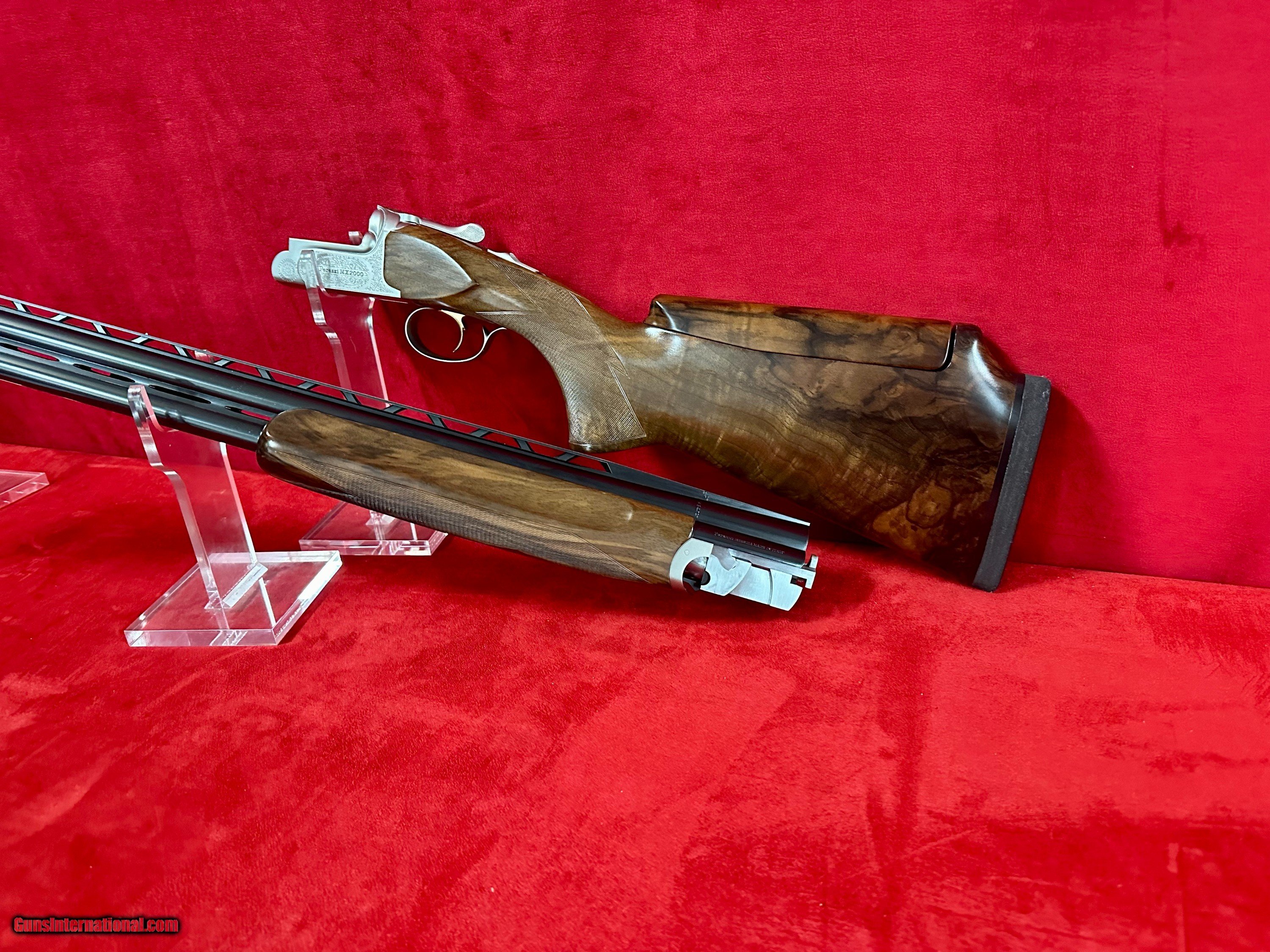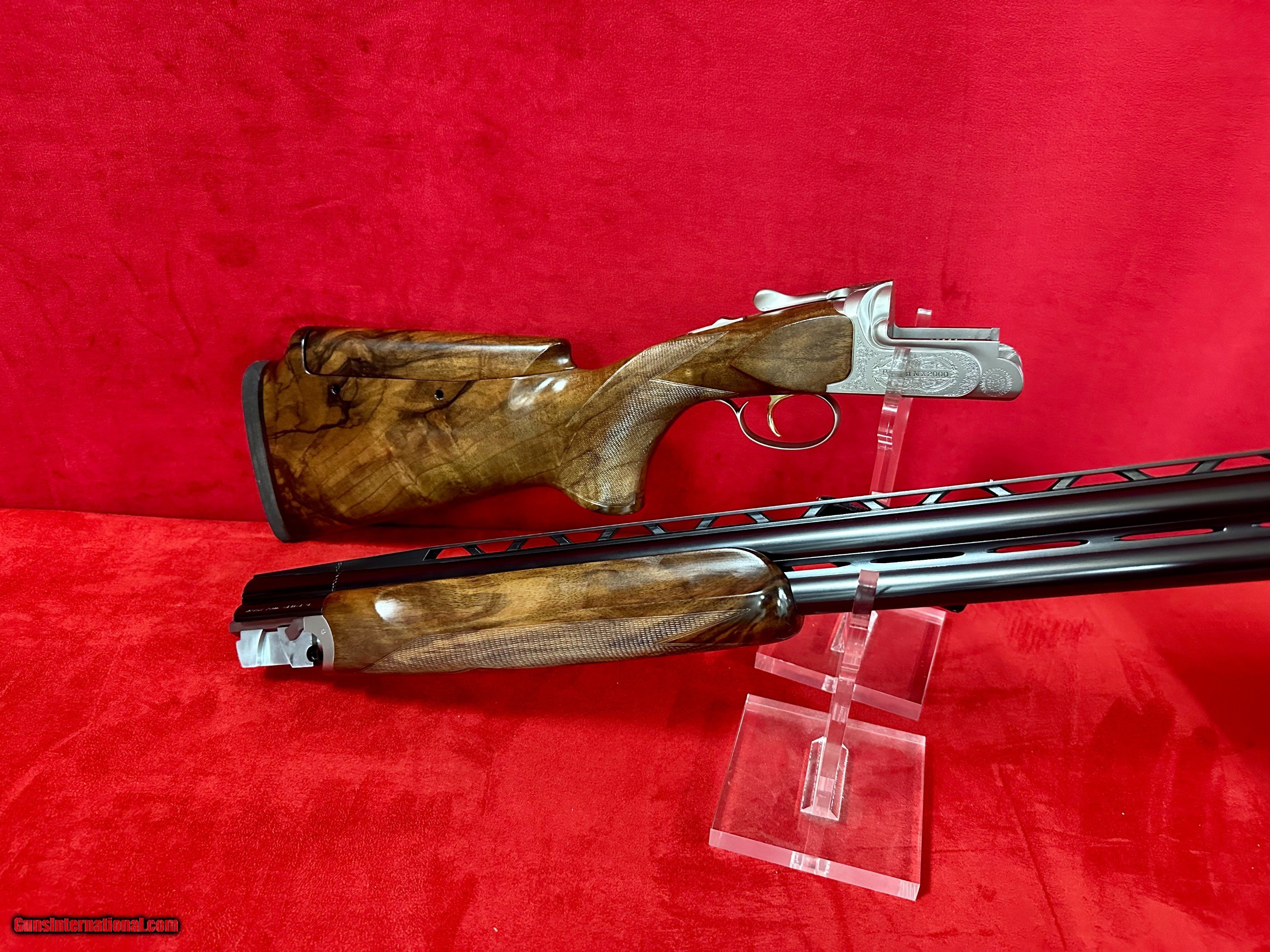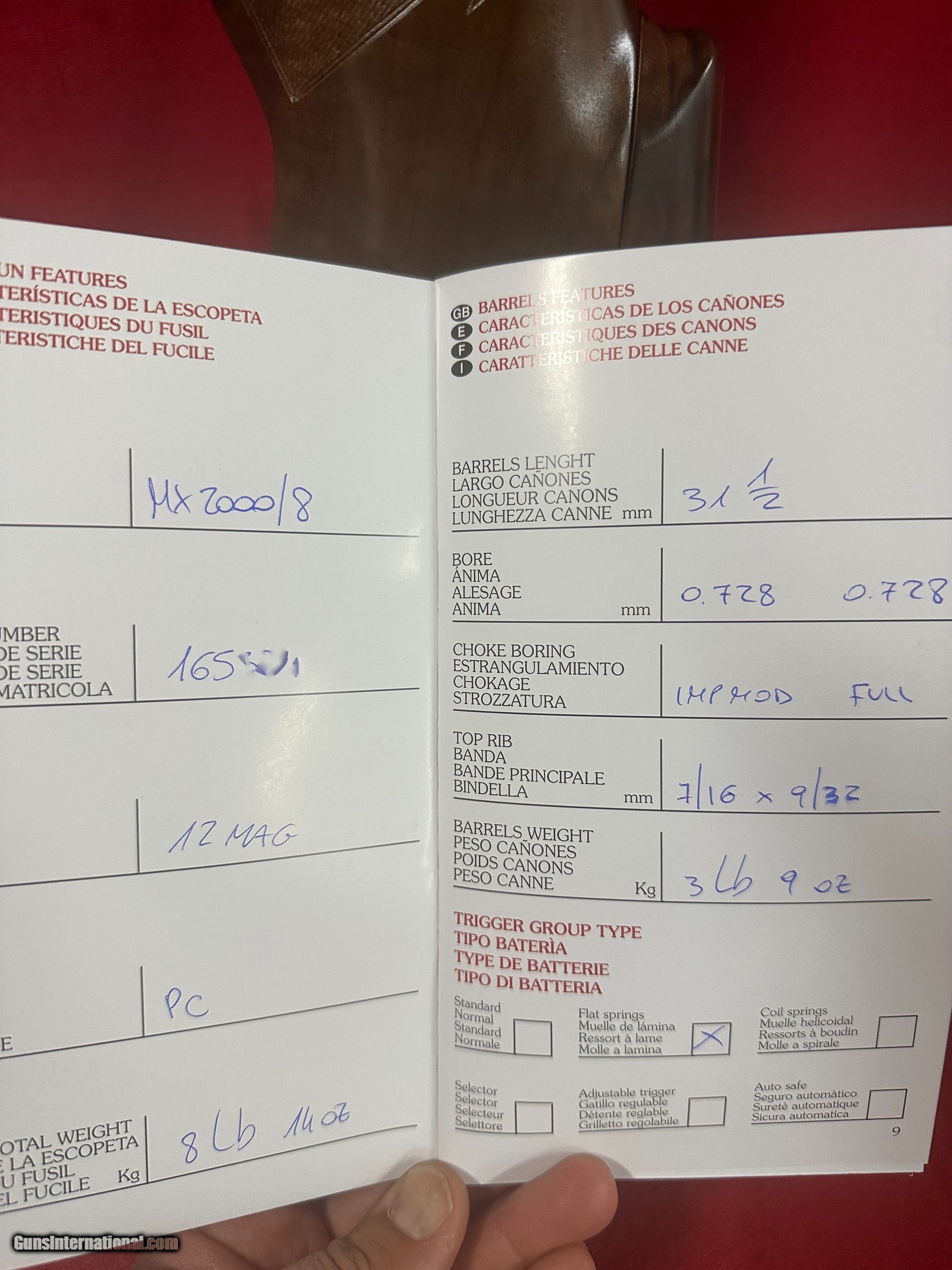 Description: Perazzi MX2000/8 all serial numbers matching #165XXX Brand NEW and Unfired. Has the new style 70/30 alto rib which is designed to shoot 70/30 with beads stacked. Also has the upgraded ALL nickel on top latch, safety button and forearm iron. SC2 wood upgrade Barrel spec: 31.5 inch Tramline 11x7 tapered rib 70/30 Tapered POI rib 18.7 bore 1.620kg Fixed choke .028/.036 Stock Dimensions: 1.50 x 1.50 x 2.50 Right hand palm swell Factory 4 way adjustable comb Length of pull 14.75 3/8 cast off at toe SOLD Shotgun Gauge: 12 Gauge |