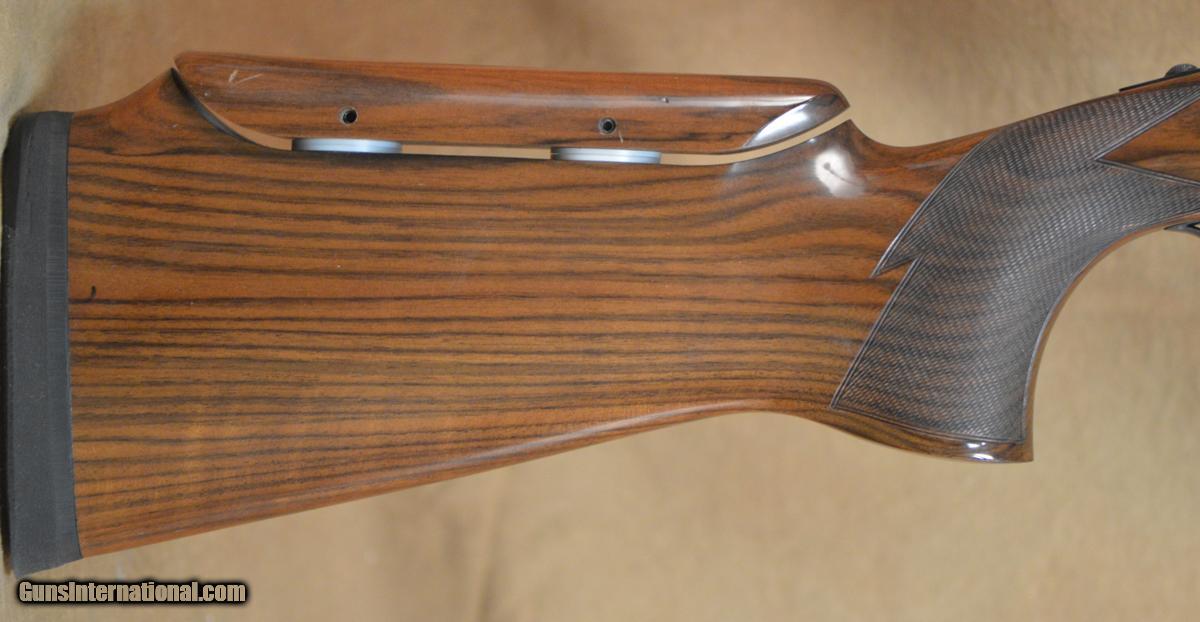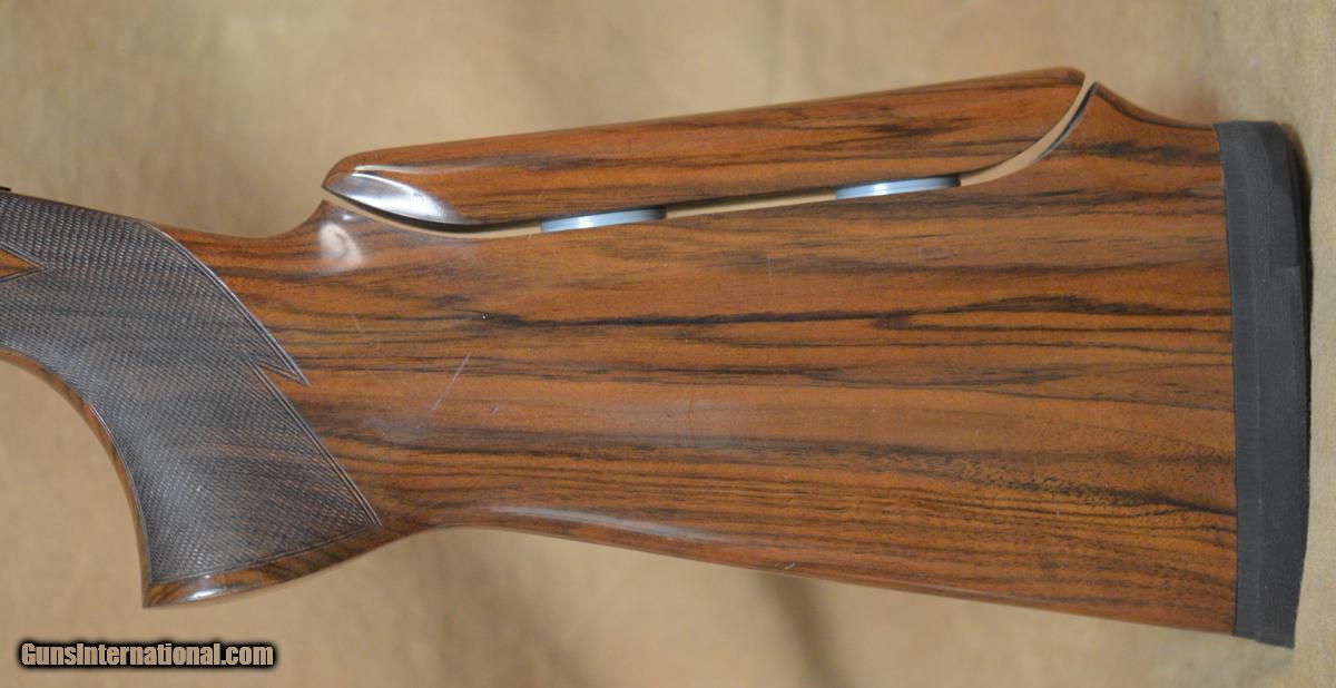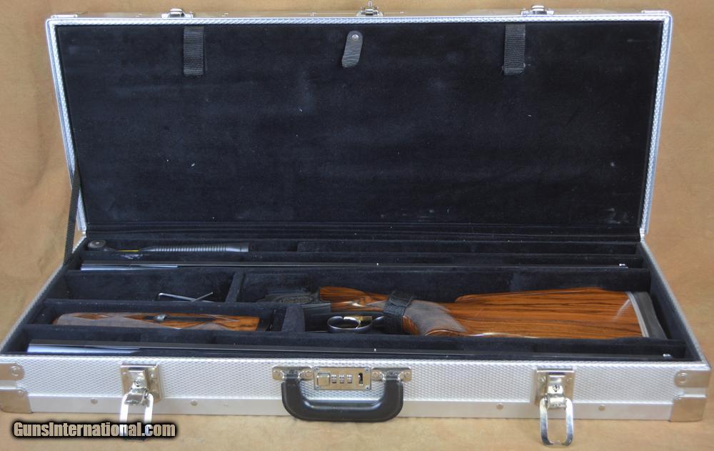 Description: Perazzi MX2000/8 Skeet Combo 12GA with 29 1/2" fixed choke (SKT/SKT) heavy barrel with 11x7 tramline rib, Briley porting; factory Lightweight barrel with full set of Kolar AAA (20, 28 & .410) sub-gauge tubes. Factory blued action with "MX2000" factory engraving, removable non-selective trigger. Factory Monte-Carlo skeet stock with aftermarket adj. comb, right-hand palmswell and fully checkered round forearm. Handling marks in stock and forearm, bluing wear on receiver and forearm. Includes Nasco case, tools. SOLD |