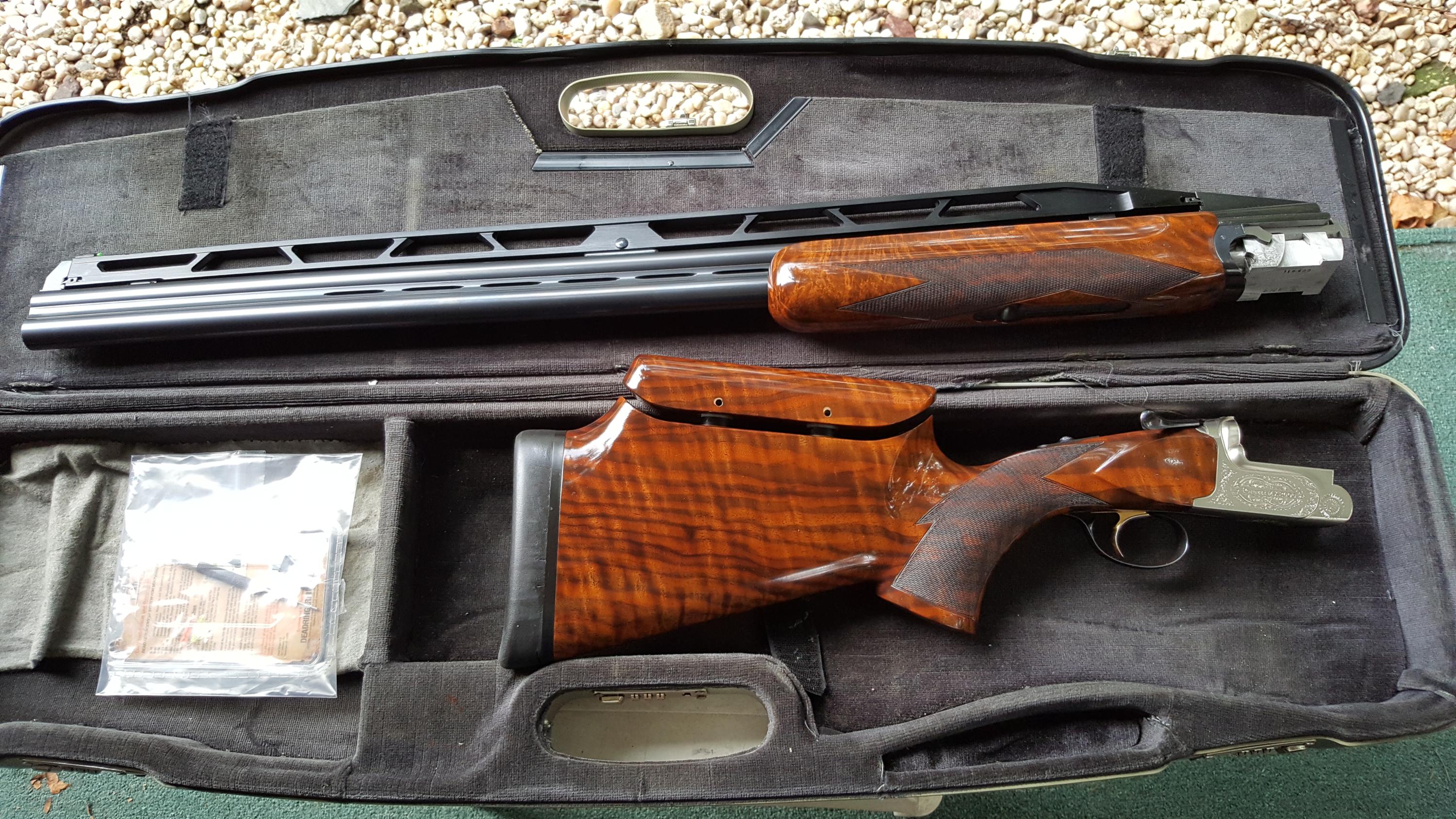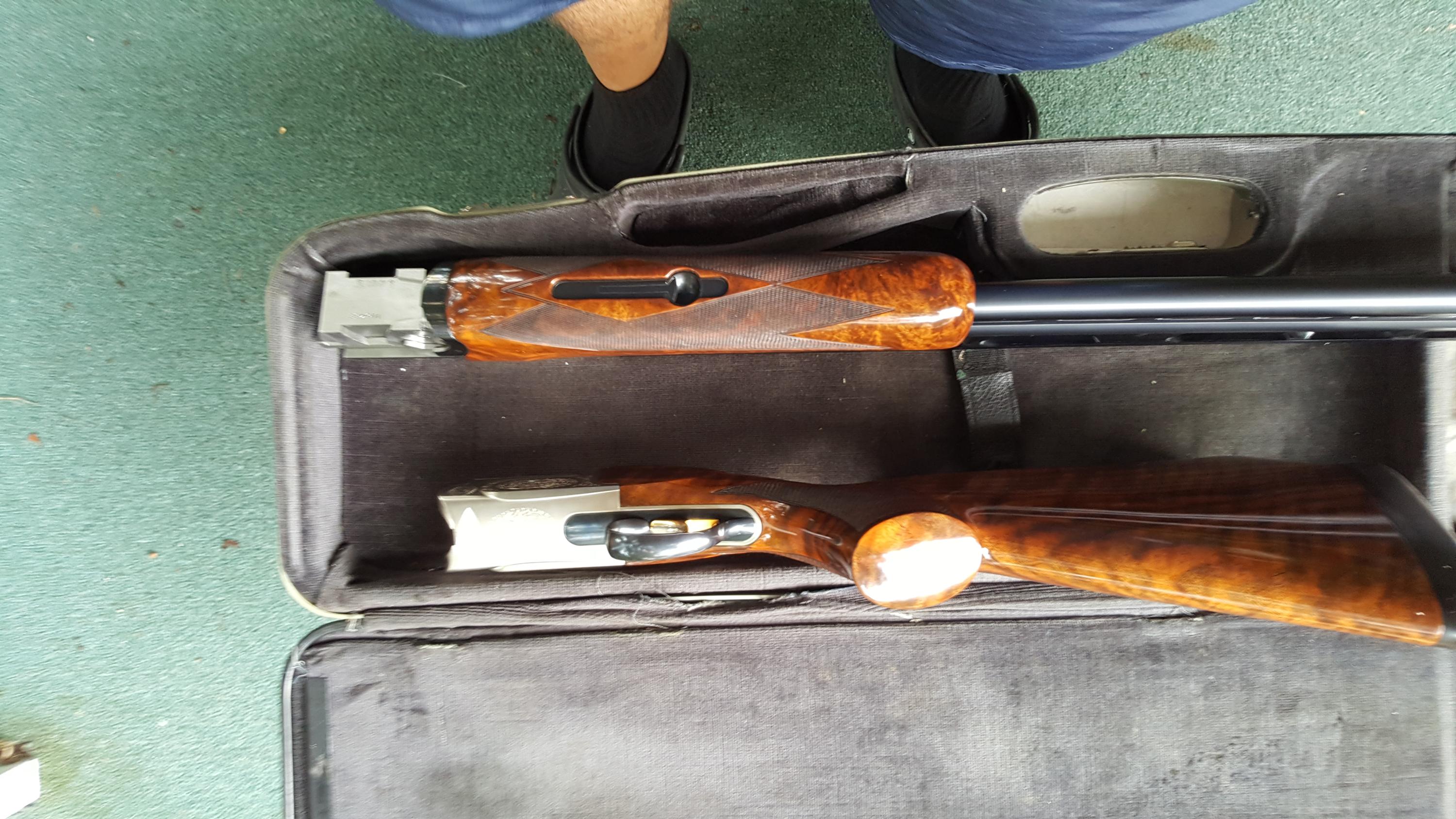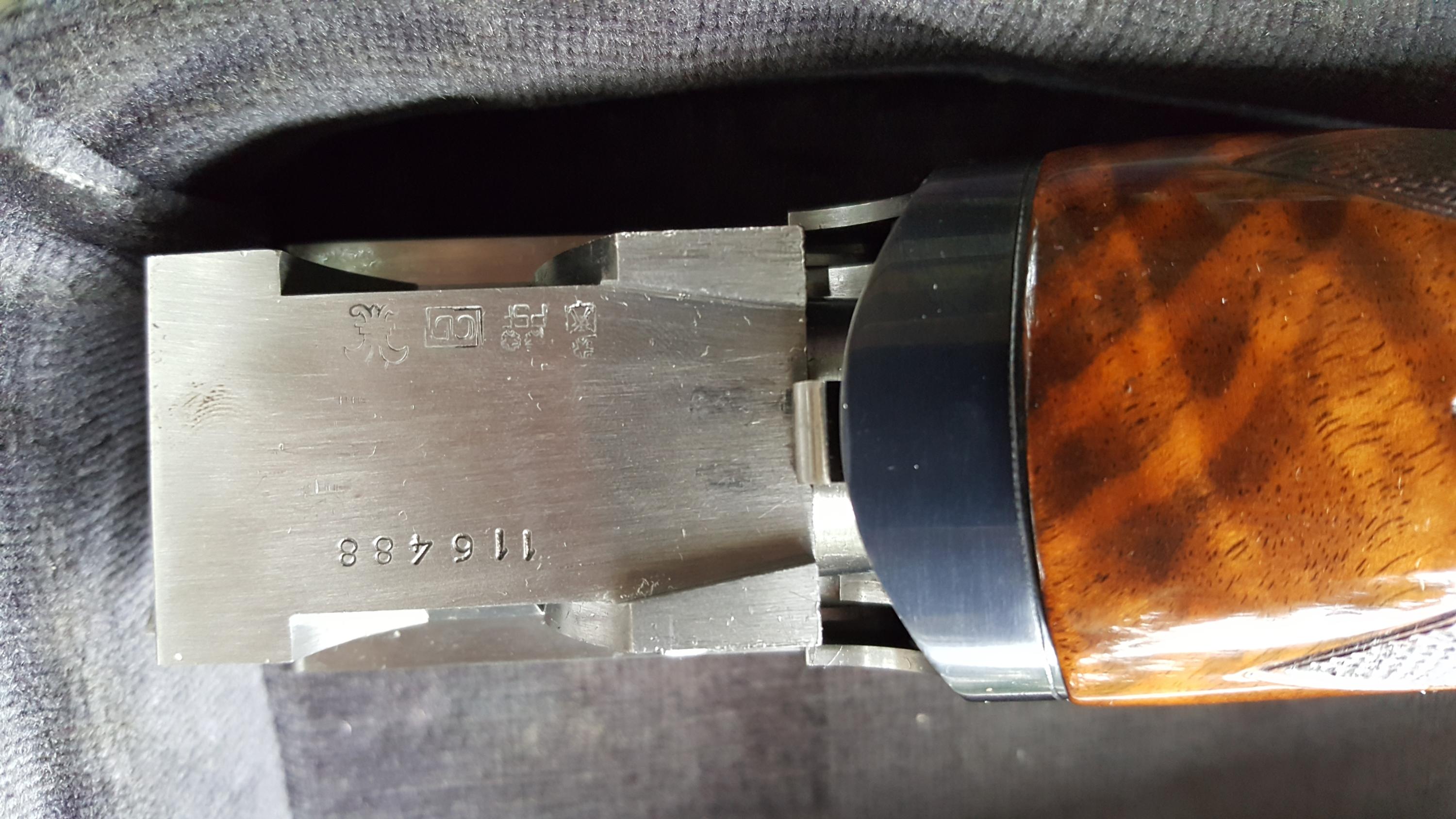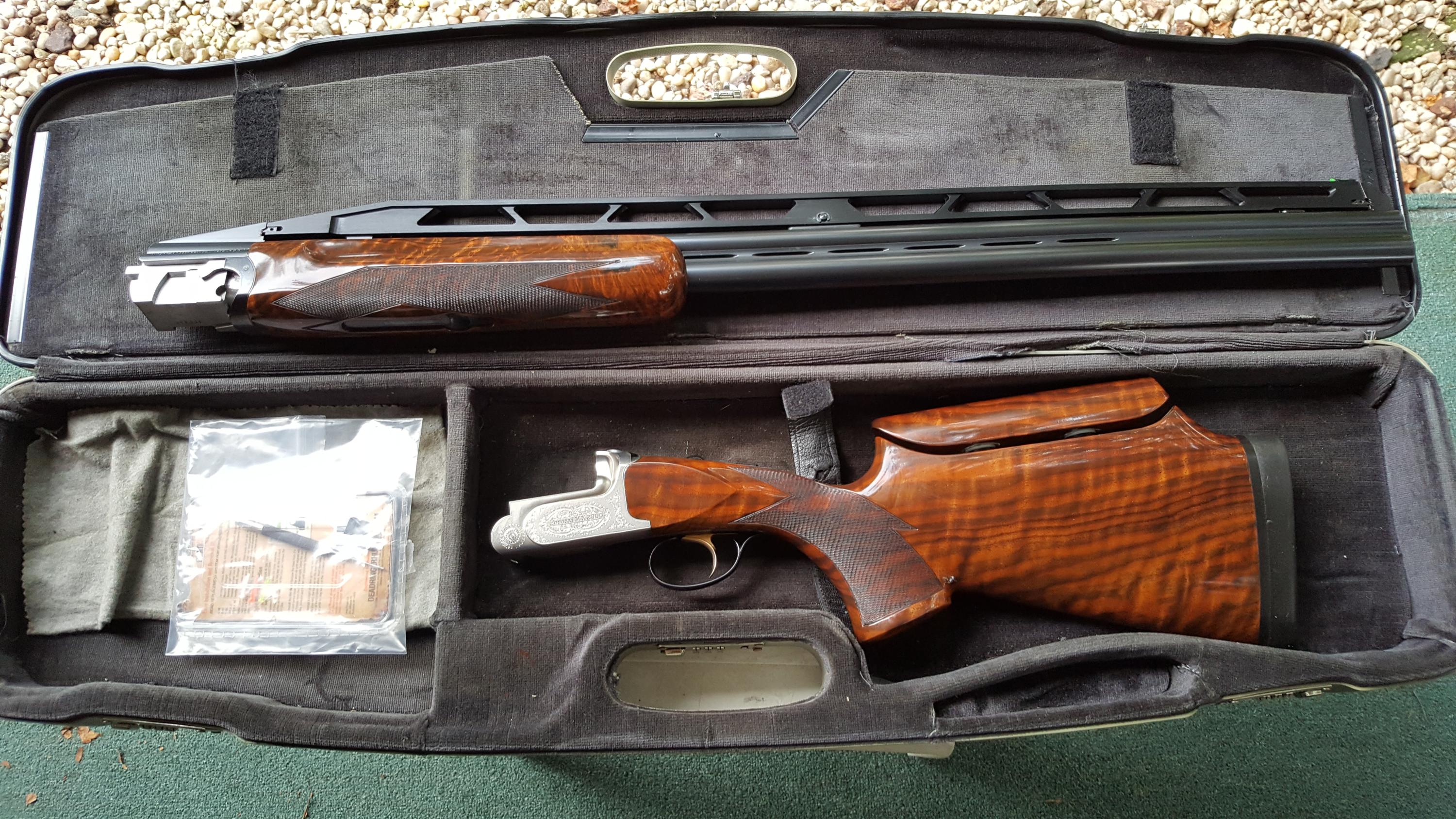 Description: Great for double trap. Serial #116488, 12 ga, 31 1/2" high adjustable ventilated rib barrels choked modified and improved cylinder and have bright excellent bores. This shotgun remains in excellent condition with the barrels retaining about 98% original blue that shows just a few minor handling marks. The coin finished receiver remains in excellent condition and features attractive light scroll work embellishment. The lever, safety, and triggerguard also retain nearly 98% original blue with some very minor thinning and the trigger retains the majority of its gold finish. The shotgun is fitted with beautiful high-grade walnut furniture that displays very attractive fiddleback and crisp checkering throughout. The forend and Monte Carlo buttstock remain in excellent condition with just a few handling marks. The stock features slight palm swells and is fitted with an adjustable comb and a rubber "Kick-Eez" pad that gives a 14 1/4" length of pull. The shotgun features a single removable pull trigger, non-automatic safety, ejectors, and a green fiber optic front sight. Included is a gray plastic Perazzi case with a cleaning cloth and a sight kit that includes a tool, the original white bead sight, and a white, orange, and spare green inserts. A superb shotgun that still locks up tight and appears to have seen very little use. See pictures for condition. More pictures of specific area will be provided on request. I do ship to CA. Shipping and insurance $150 to lower 48. AK, HI pay more, contact prior to bid. International buyers: Contact prior to bid. Please budget $1000 - $1500 for export fees and shipping. If you cannot find US exporter, I will find one for you and facilitate document preparation for $200 upfront nonrefundable fee. It is your responsibility to obtain import license and translate it to English in home country. If paying by PayPal add 4% to final invoice. For wire transfer - contact for credentials. Layaway available up to 3 months, 3 equal payments - 10% extra. 3 days no fire inspection. Unless item is materially misrepresented 10% will be deducted from refund. SOLD Manufacturer: PERAZZI Model: MX2000 Serial Number: 116488 Caliber Info: 12Ga Chambers: 3 Ejectors: Yes Condition: Excelent Metal Condition: Excelent Wood Condition: Excelent Bore Condition: Excelent Barrels: 31 1/2 Barrel Type: O/U Action: Inertial Triggers: ST Gauge Info: 12 Stock: Adjustable Comb LOP: 14 1/4" Rib: High Adjustable 5 notches Finish: Gloss Sights: Fiber Case: Perazzi Item Location: 11756 |