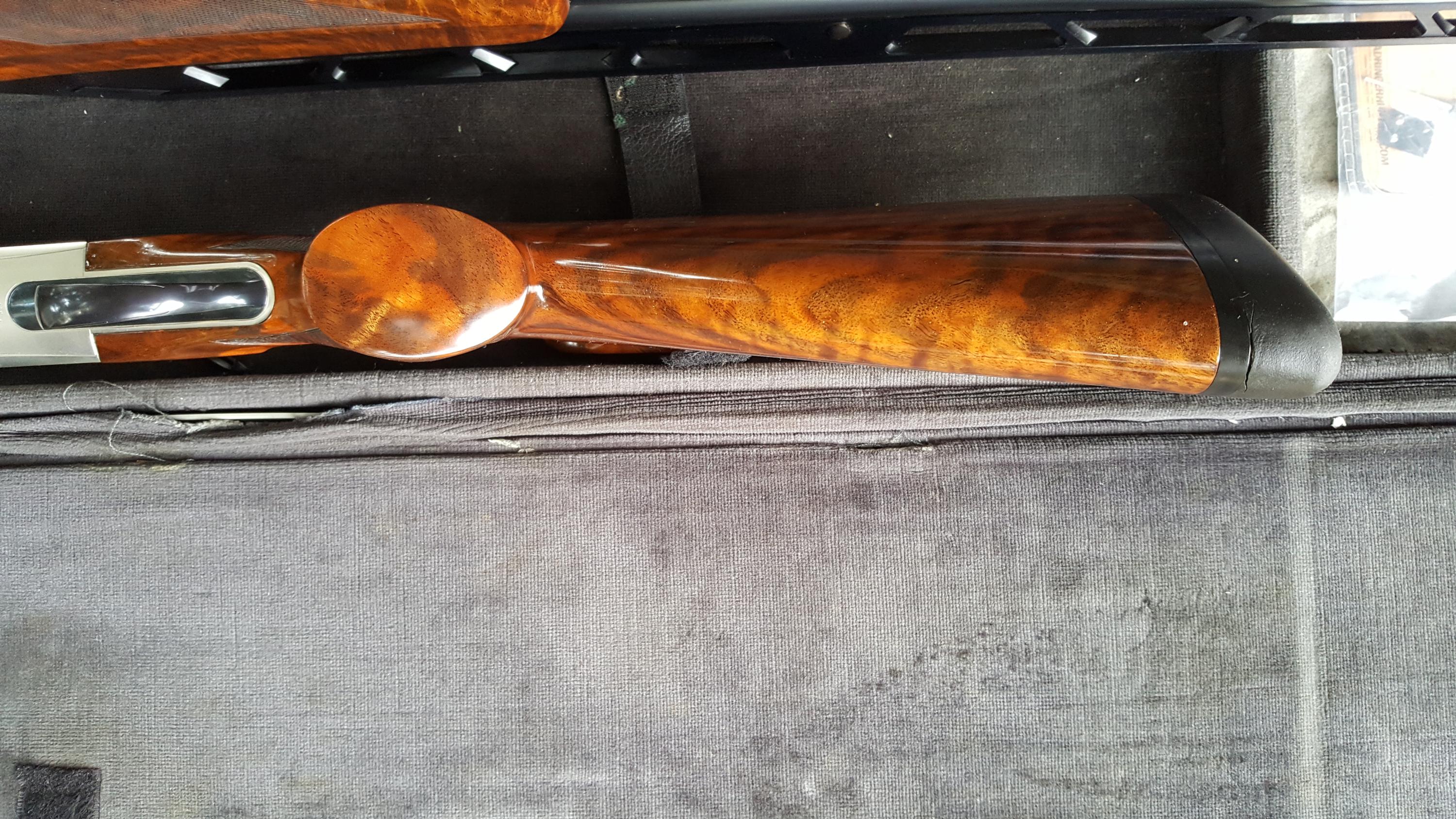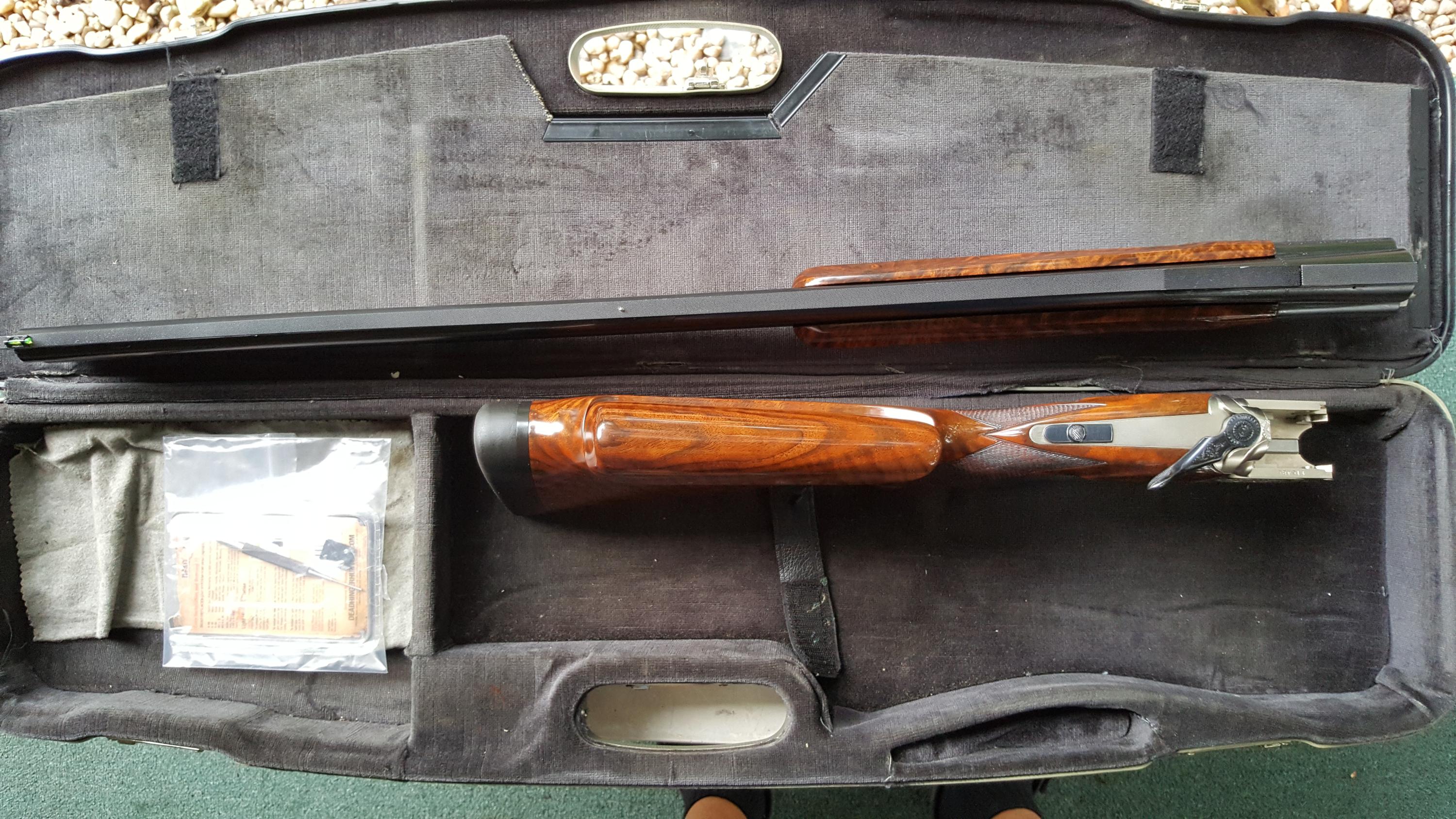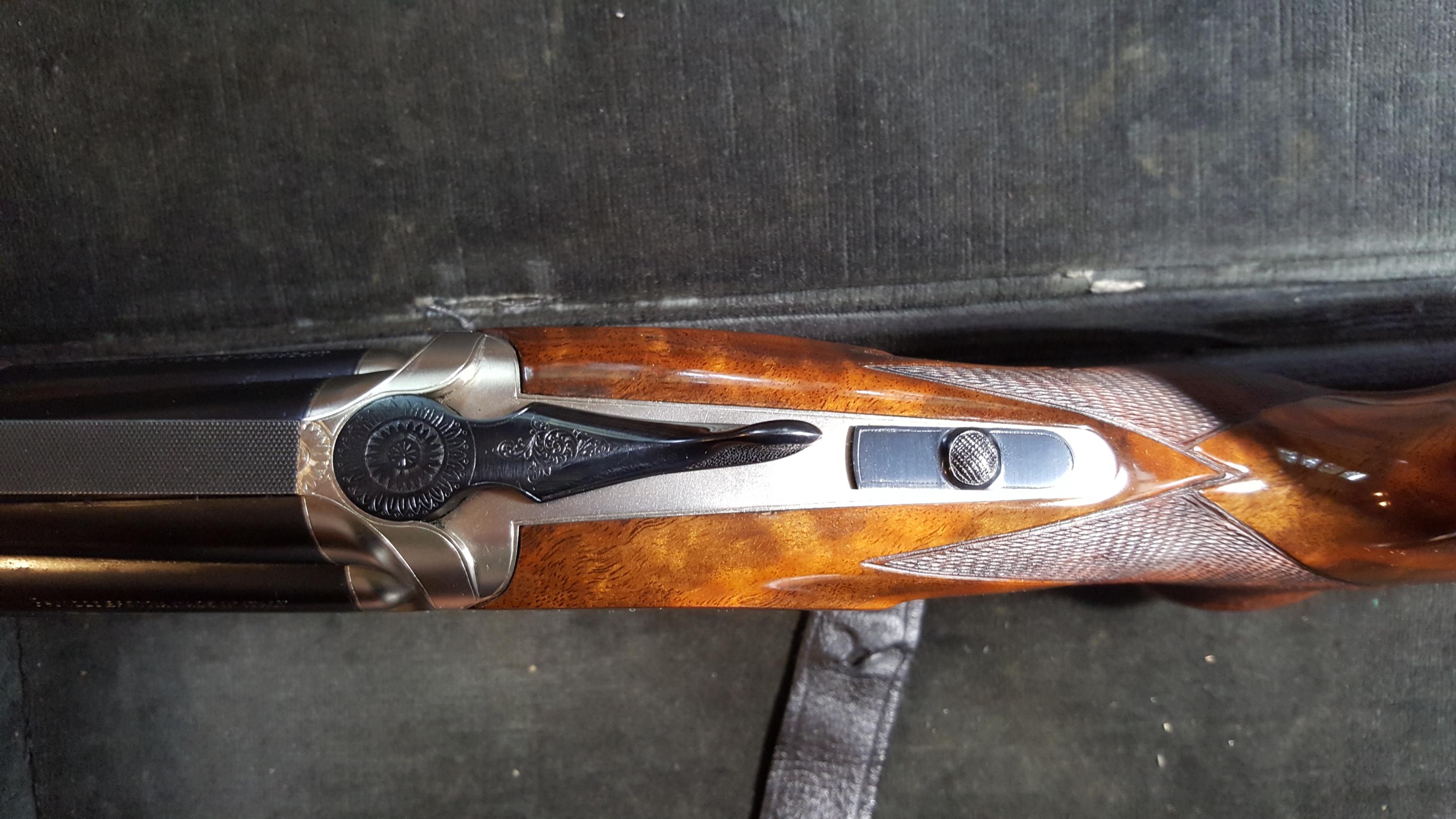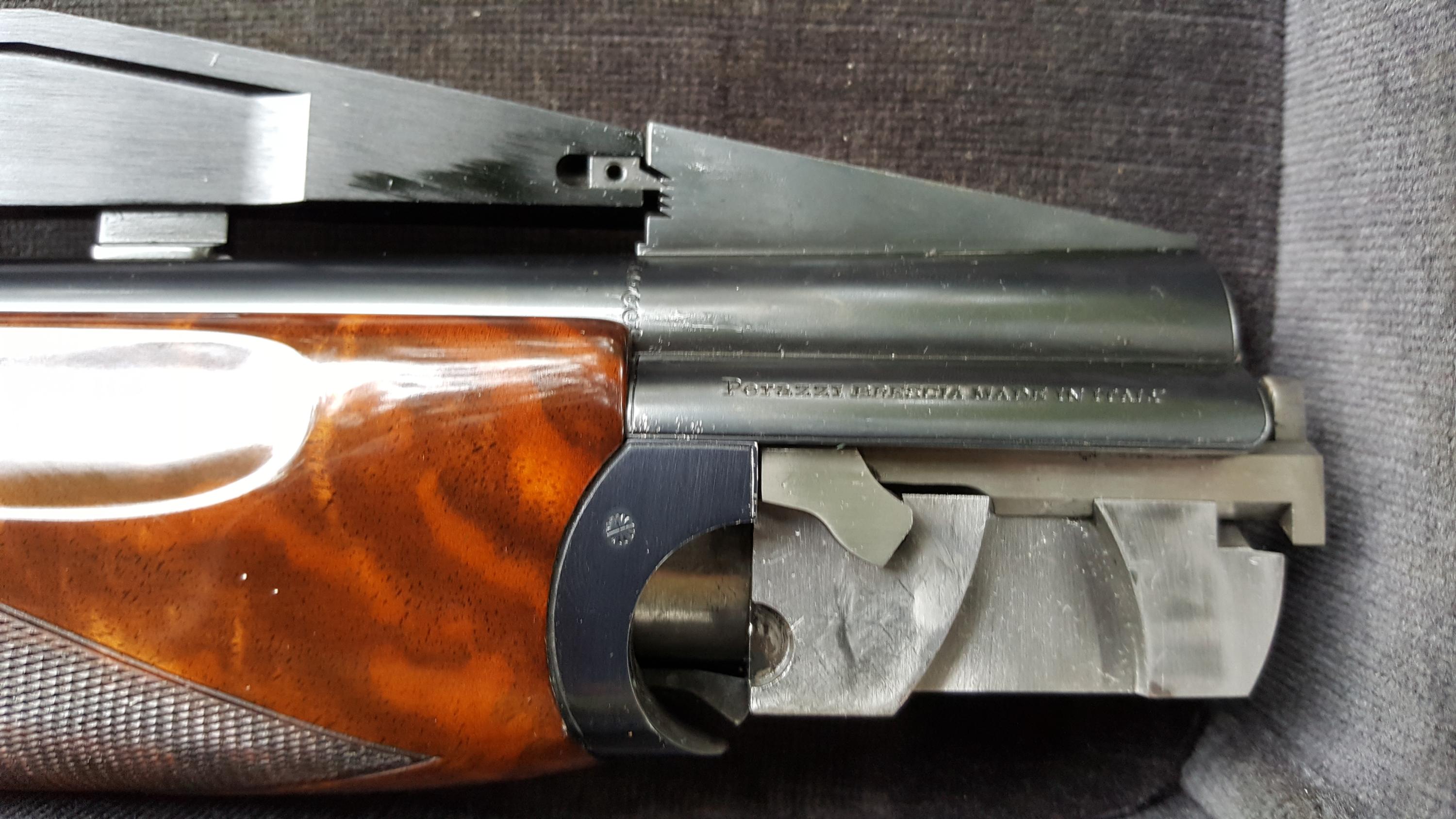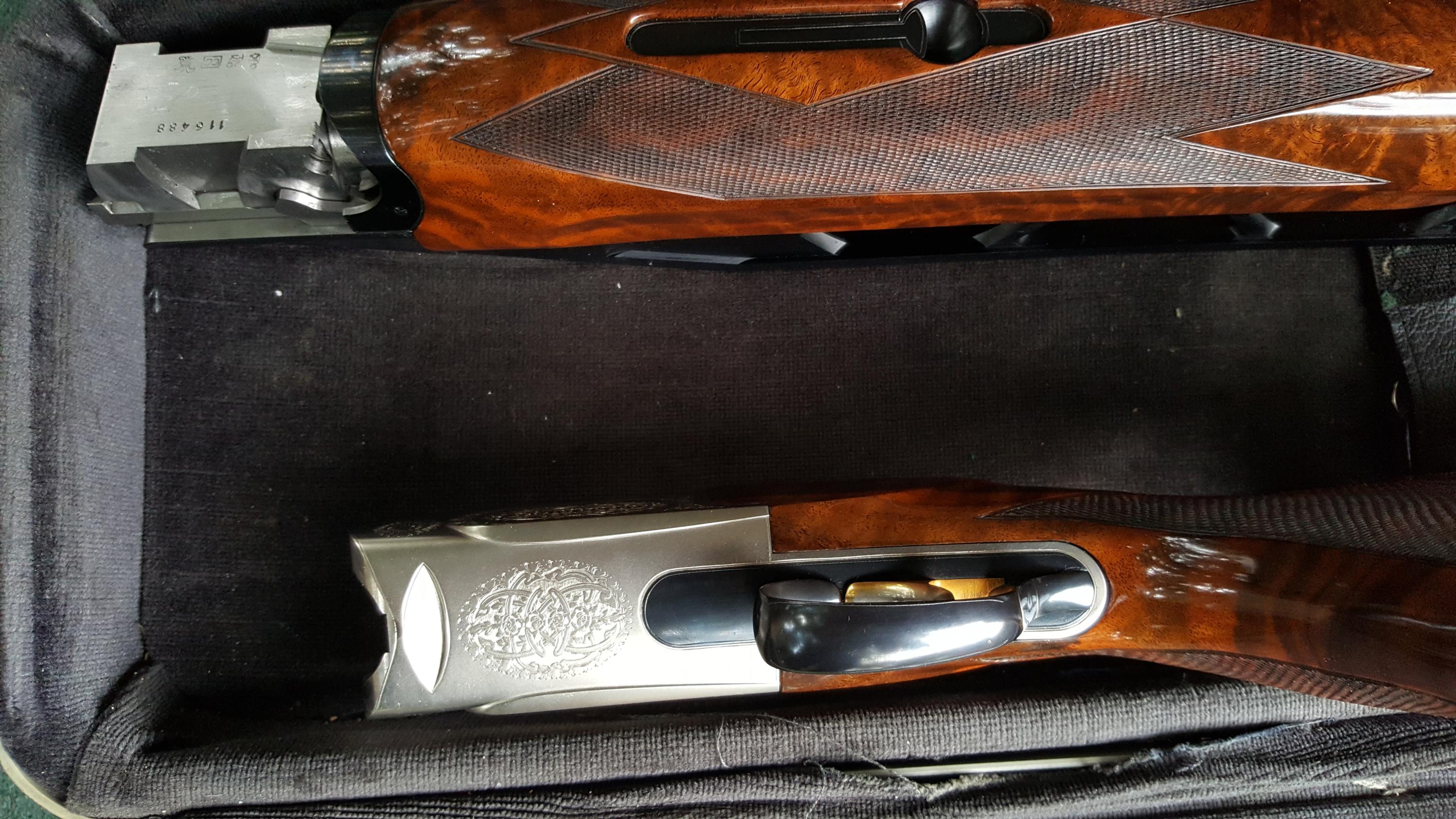 Description: Great for double trap. Serial #116488, 12 ga, 31 1/2" high adjustable ventilated rib barrels choked modified and improved cylinder and have bright excellent bores. This shotgun remains in excellent condition with the barrels retaining about 98% original blue that shows just a few minor handling marks. The coin finished receiver remains in excellent condition and features attractive light scroll work embellishment. The lever, safety, and triggerguard also retain nearly 98% original blue with some very minor thinning and the trigger retains the majority of its gold finish. The shotgun is fitted with beautiful high-grade walnut furniture that displays very attractive fiddleback and crisp checkering throughout. The forend and Monte Carlo buttstock remain in excellent condition with just a few handling marks. The stock features slight palm swells and is fitted with an adjustable comb and a rubber "Kick-Eez" pad that gives a 14 1/4" length of pull. The shotgun features a single removable pull trigger, non-automatic safety, ejectors, and a green fiber optic front sight. Included is a gray plastic Perazzi case with a cleaning cloth and a sight kit that includes a tool, the original white bead sight, and a white, orange, and spare green inserts. A superb shotgun that still locks up tight and appears to have seen very little use. See pictures for condition. More pictures of specific area will be provided on request. I do ship to CA. Shipping and insurance $150 to lower 48. AK, HI pay more, contact prior to bid. International buyers: Contact prior to bid. Please budget $1000 - $1500 for export fees and shipping. If you cannot find US exporter, I will find one for you and facilitate document preparation for $200 upfront nonrefundable fee. It is your responsibility to obtain import license and translate it to English in home country. If paying by PayPal add 4% to final invoice. For wire transfer - contact for credentials. Layaway available up to 3 months, 3 equal payments - 10% extra. 3 days no fire inspection. Unless item is materially misrepresented 10% will be deducted from refund. SOLD Manufacturer: PERAZZI Model: MX2000 Serial Number: 116488 Caliber Info: 12Ga Chambers: 3 Ejectors: Yes Condition: Excelent Metal Condition: Excelent Wood Condition: Excelent Bore Condition: Excelent Barrels: 31 1/2 Barrel Type: O/U Action: Inertial Triggers: ST Gauge Info: 12 Stock: Adjustable Comb LOP: 14 1/4" Rib: High Adjustable 5 notches Finish: Gloss Sights: Fiber Case: Perazzi Item Location: 11756 |
