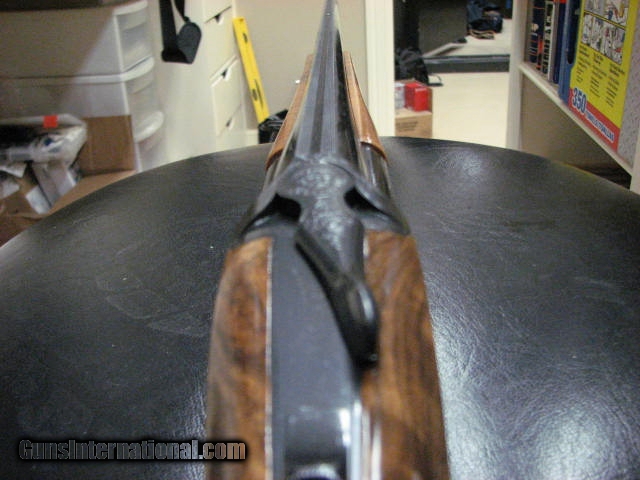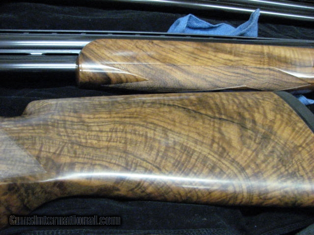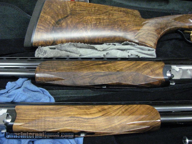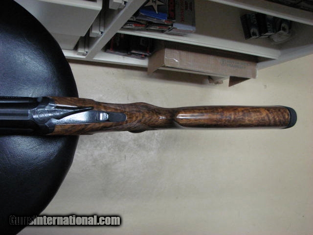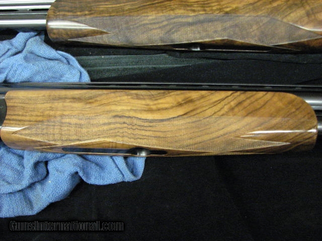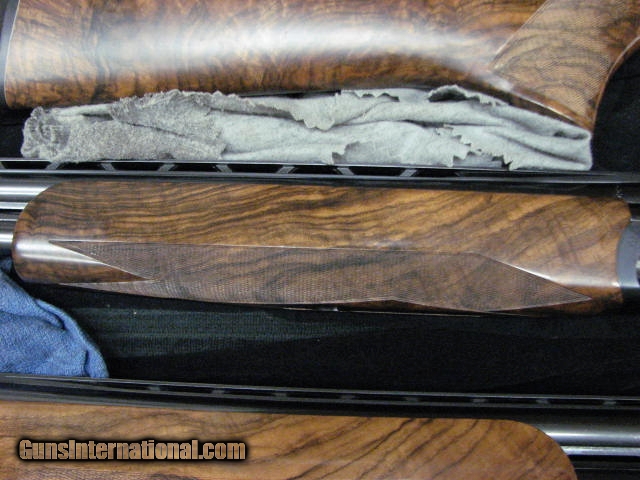 Description: SALE PENDING.....SALE PENDING..... Perazzi MX2000 32" 12 ga and 32" 20 ga with two forends and very nicely configured SC2 wood with Perazzi two barrel case, manual, snap caps, extra trigger leaf springs, etc (all as it came from factory). Stock is a sporter configuration and has a nice palm swell and is for right handed shooter with a fairly small amount of cast off and factory pad. DAC is 1.46", DAH is 2.24", cast at heel is .2", cast at toe is .39", LOP approx. 14.8". Pull trigger is removable and non-selectable. 12 ga barrels are fixed choke MOD/IMOD and 18.8 bore (.740 bore), 32" with tramline flat 2mm height rib that is tapered 11mm to 7mm. 12 ga barrels are stamped 1.53kg but actual weight on a digital scale is 1.47kg. The 12 ga barrels have had a metal field bead installed in place of the factory white bead at the muzzle by Lucio Sosa when he was with Perazzi. The mid bead is factory. 20 ga barrels are essentially new (less than 1 case of 20 ga fired through these barrels) 32" and choked MOD/IMOD as well. Bore is 15.9mm (.634 bore-per manual with the gun). Barrels stamped 1.54kg and actual weight on a scale is 1.50kg. This gun has the standard 2mm flat rib that is tapered 11mm to 7mm and has the standard factory metal mid bead and factory white bead at the muzzle. Gun has been fired very little (approx. 2K rounds as 12 ga and literally less than 1 case of 20 ga fired). Included a pic showing how little wear is on the breach face of the receiver. Not a single mark on the wood anywhere and gun has been handled very little so wood finish is still the original "satin" Perazzi finish. Gun is obviously very tight. Overall weight of the gun as a 12 ga is 8 lbs 5 oz and weight of the gun as a 20 ga is 8 lbs 4 oz (measured on my digital scale). Both sets of barrels on the gun balance on the trunions. Very nice feeling, smooth, lively clays gun!! SOLD |