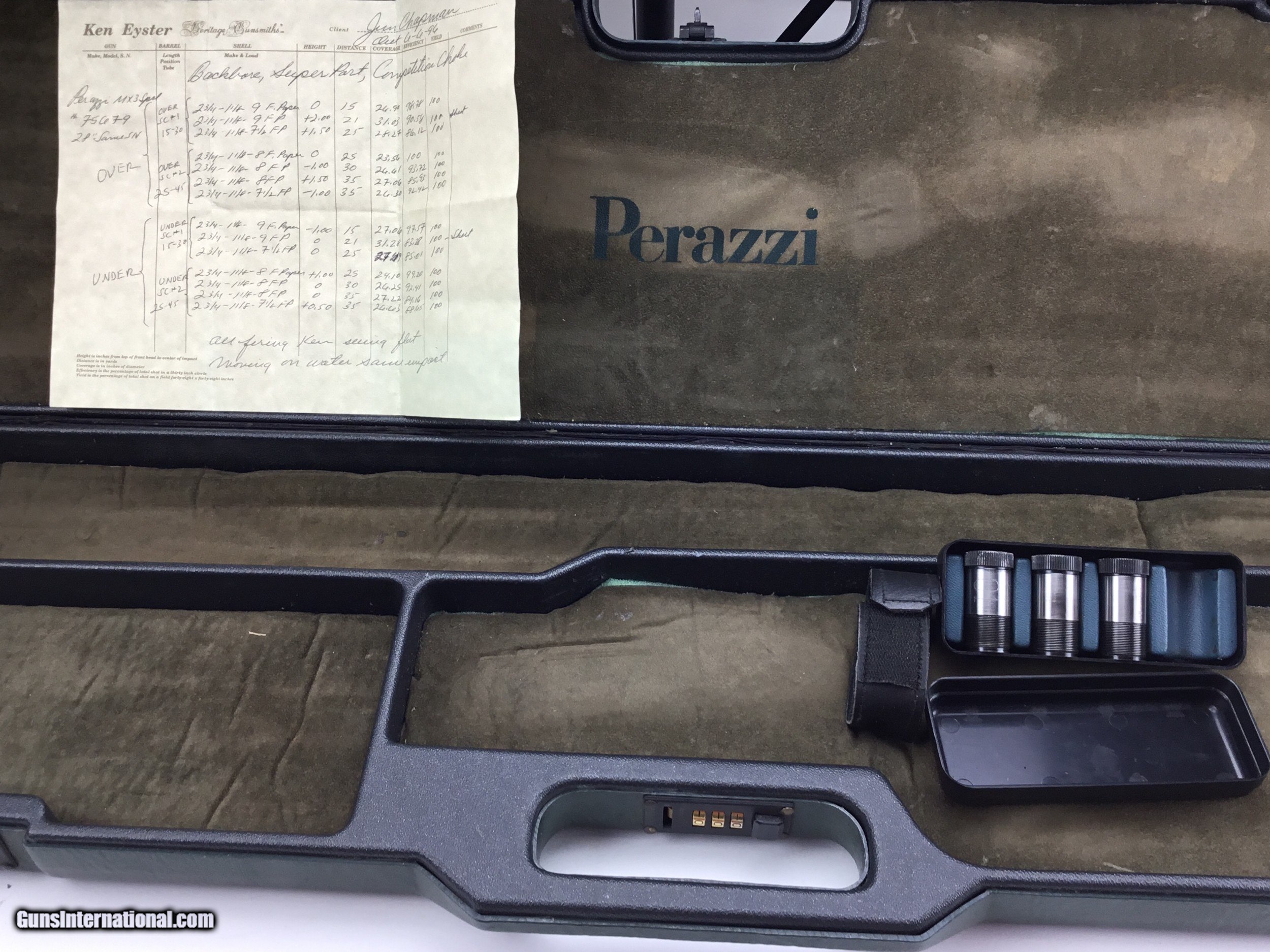 Description: PERAZZI MX-3 SPECIAL 12 GAUGE, Straight Grained Stock with Enhanced Compression Lines and Flat Knob over Makers Red Recoil Pad, 28” Ported Bbls Back Bored and Tuned by Ken Eyster(with Papers), Brass Mid and White Front Bead, 5 Perazzi Choke Tubes 2-#0: Skeet, #7 & 8: Mod, #4: Full .031, 2 ¾” Chambers, Drop Comb: 1 ½”, Drop Face: 1 ?”, Drop Heel: 1 ?”, LOP: 13 ½”, Cast Face: 1/16”, Cast Heel: ?”, Minor Handling Marks on Stock, Bores Bright and Shiny, Condition Overall: Excellent, Makers Case, Manufactured in Italy, SN-75679, #297, HAMPELS GUN COMPANY, SINCE 1919, AMERICA’S OLDEST GUN SHOP. SOLD Manufacturer: Perazzi Model: MX3 Special Serial Number: 75679 Case: Factory |