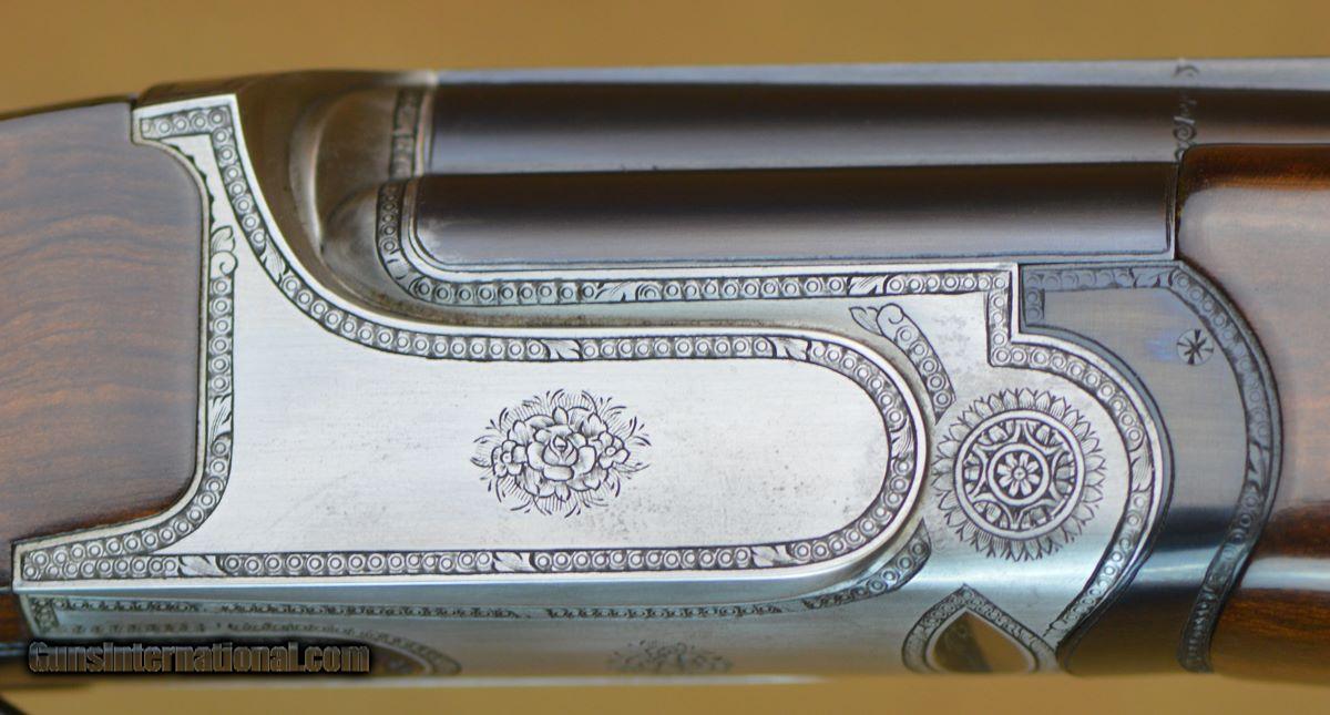 Description: Perazzi MX410 Game .410 Bore with 29 1/2" fixed choke (.008/.016) barrels, flat 7x7 parallel game rib. Fixed, selective coil spring trigger. Factory coin finished "SC2" engraved receiver featuring hand engraved borders and vignette. Outstanding factory Prince of Wales pistol grip stock, Schnabel forearm. Minor handling marks in stock and forearm, receiver shows some darkening and flaking of lacquer. Includes factory case, tools. SOLD |