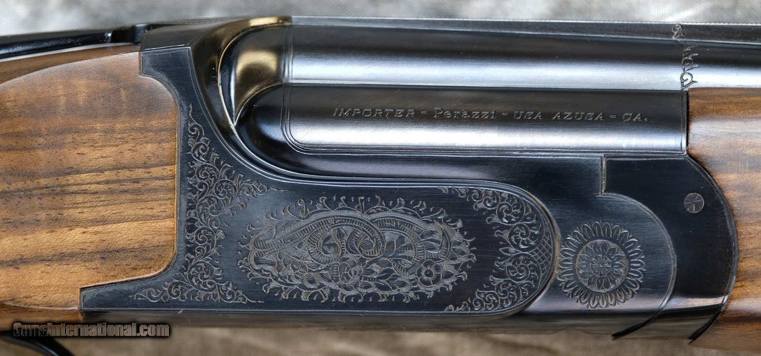 Description: New Perazzi MX410 Lusso Game .410 Bore with 29" fixed (M/IM) choked barrels, 7x7 parallel game rib with solid side ribs. Factory hand engraved "Lusso" grade action featuring scrolls, florals and ribbons by Terri, scaled .410 action, blued with coil spring selective trigger. Factory SC2 Grade Purdey Style pistol grip game stock to 13mm recoil pad and game forearm. Includes factory case, tools. Call 626-633-1002 for pricing. SOLD Shotgun Gauge: .410 Gauge |