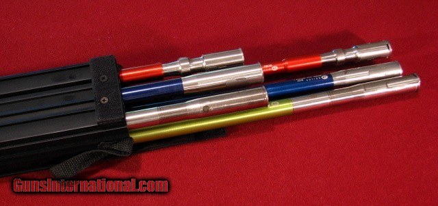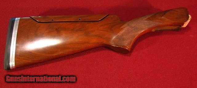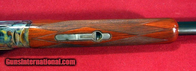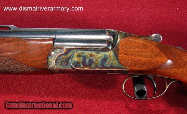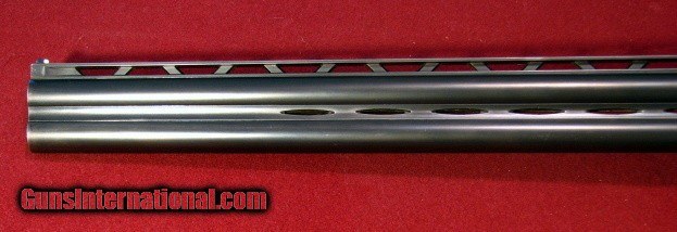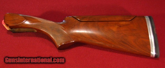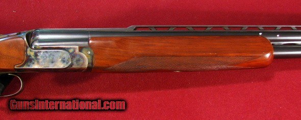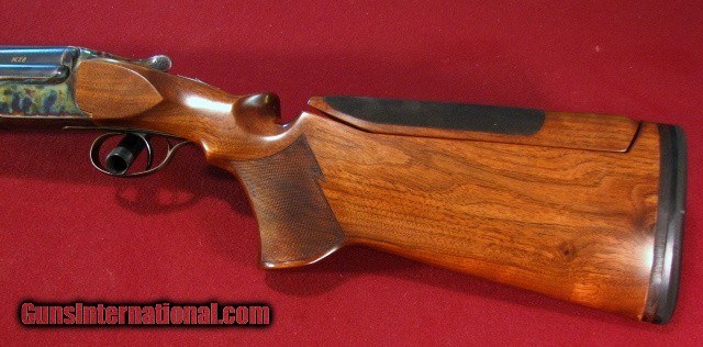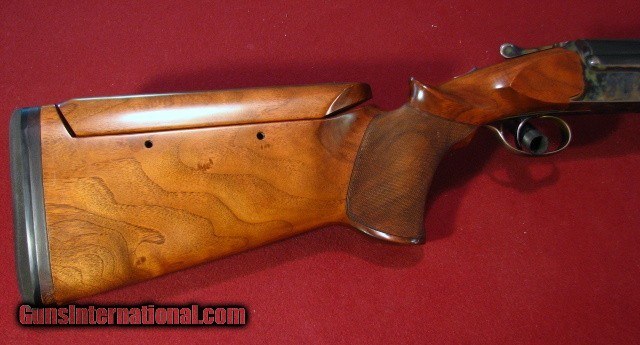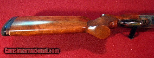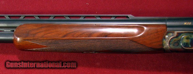 Description: Perazzi MX8 12 Gauge, S.N. 41XXX , with 76cm. [29 7/8"] IC/IM barrels with excellent bores measuring .736 on the top and .735 on the bottom. Chokes measure .026 on the top and .011 on the bottom. Matted 10mm stepped ventilated top rib and ventilated side ribs. Color Case hardened receiver with drop out trigger group and border engraving and engraving of the hinge pin covers and top spindle. Stocked with an Italian custom "Thumb Over" stock with a palm swell and adjustable comb with a soft rubber cheekpiece insert. 14 3/4" LOP to a soft rubber pad. Also included is the factory buttstock with adjustable comb and buttplate in excellent condition with 14 3/4" LOP to a Kick-Eez pad. Additionally included is a set of 29 1/4" Briley 20, 28, and .410 subgauge tubes all of which have removeable chokes. These cased in a Briley choke tube case. [$1800 retail value] This piece is an Ithaca import with the Type 3 forend. It remains in excellent 98% overall condition. Top lever well right of center. Vibrant case colors. Blue at 99% Excellent value as accessorized. SOLD |