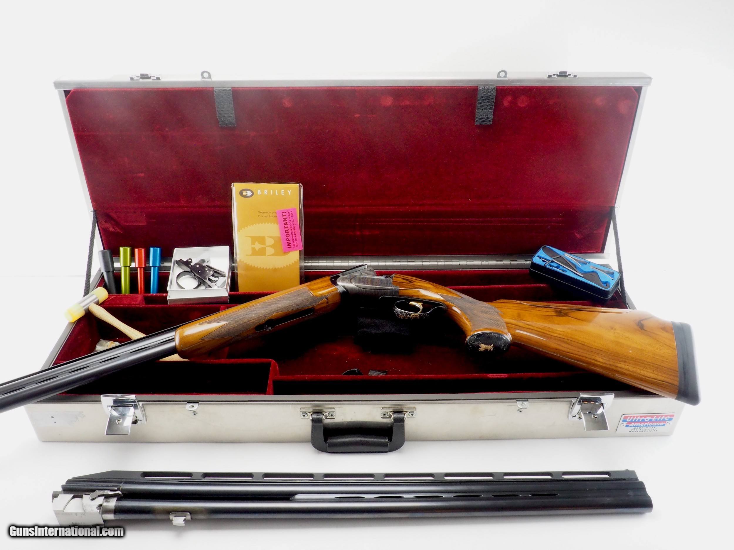 Description: Perazzi MX8 sporting with ramp rib 12ga/32” barrels plus 28” barrels fitted for included Briley Ultralight 20ga/28ga/.410 tubes. The receiver serial is 49xxx; the 32” barrels and forearm match at 38xxx, meaning they are Type 3. The 28” barrels are also Type 3. This gun was put together into a set, and appears to have been fitted by someone who knew what he was doing. The 32” barrels measure out to 31 7/8”, while the 28-inchers are actually 28 3/8” long. The stock is a custom with very shootable dimensions, and looks and feels like a Wenig—although we cannot confirm this for fact. Included is a top-first trigger group and a bottom-first trigger group, both fit to the receiver. NOTE: stock dimensions are measured with the step-rib 32” barrel in place. The 28” barrel has a slightly taller add-on rib in place. Make: Perazzi Model: MX8 Gauge: 12ga Hand: right Barrel length: 32” (31 7/8”) Chokes (32”): fixed, .019” over .012” Barrel weight (32”): 1.596kg Barrel length: 28” (28 3/8”) w/ Ultralight tubes Barrel weight (28” w/ 20ga tubes): 2.188kg LOP: 15” DAC: 1 3/8” DAMC: 1 3/8” DAH: 2 3/16” Accessories: knockout tools, complete factory Perazzi spring kit, extra trigger group (two trigger groups total) Case: Americase Ultralight, fitted for both barrels and tubes SOLD |
