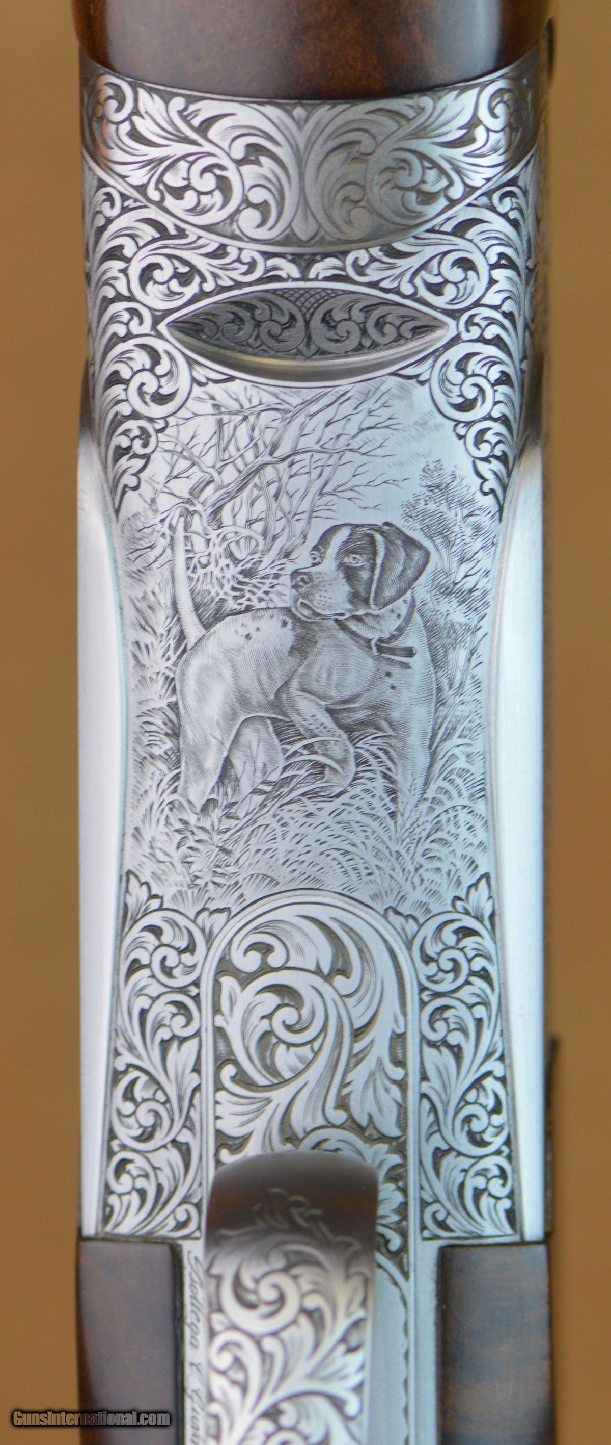 Description: Perazzi MX8/20 SC3 Sporting 20GA with 32" factory choke tubed barrels, 2mm ramped 10x7 tramline rib. Coin finished, fully hand-engraved scaled 20GA action featuring scrolls and game scenes by Italian Master Bottega Giovanelli. Removable selective trigger. Factory adj. comb stock with right-hand palmswell, PSA Pro forearm. Outstanding overall condition with very minor handling marks. Includes factory case, chokes and tools. SOLD |