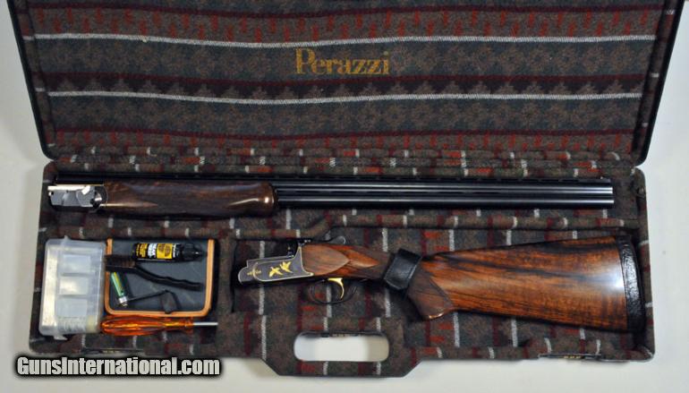 Perazzi MX8 Ser. No. 87601. 20 Ga.- 29 1/2" barrel with full set of Briley thin walled chokes. Beautifully engraved and gold enlayed by Angelo Bee. Detachable trigger and nicely figured stock- 15 1/2"X 1 1/2"X 2". Cased in Perazzi hard case. Wonderful gun for clays or hunting.