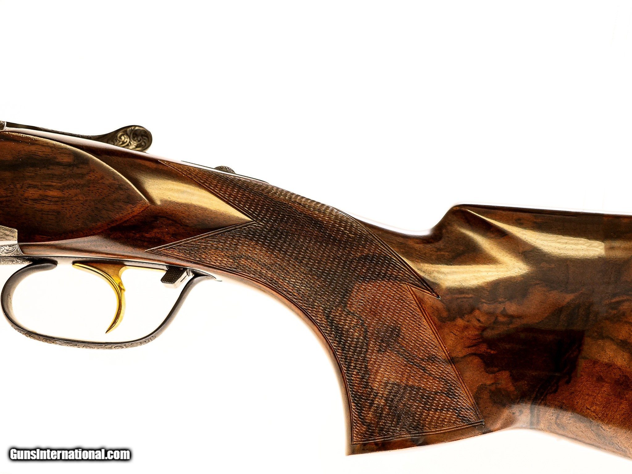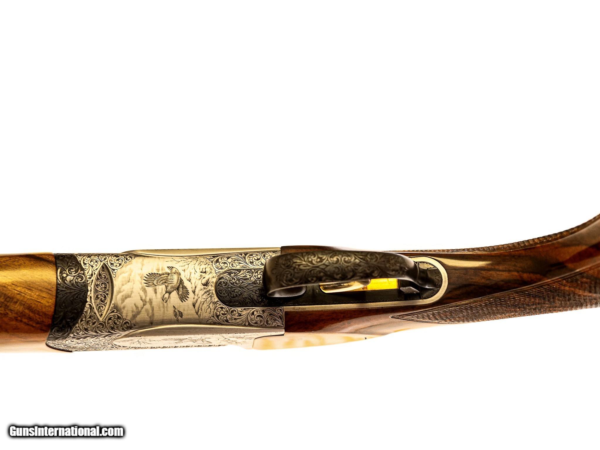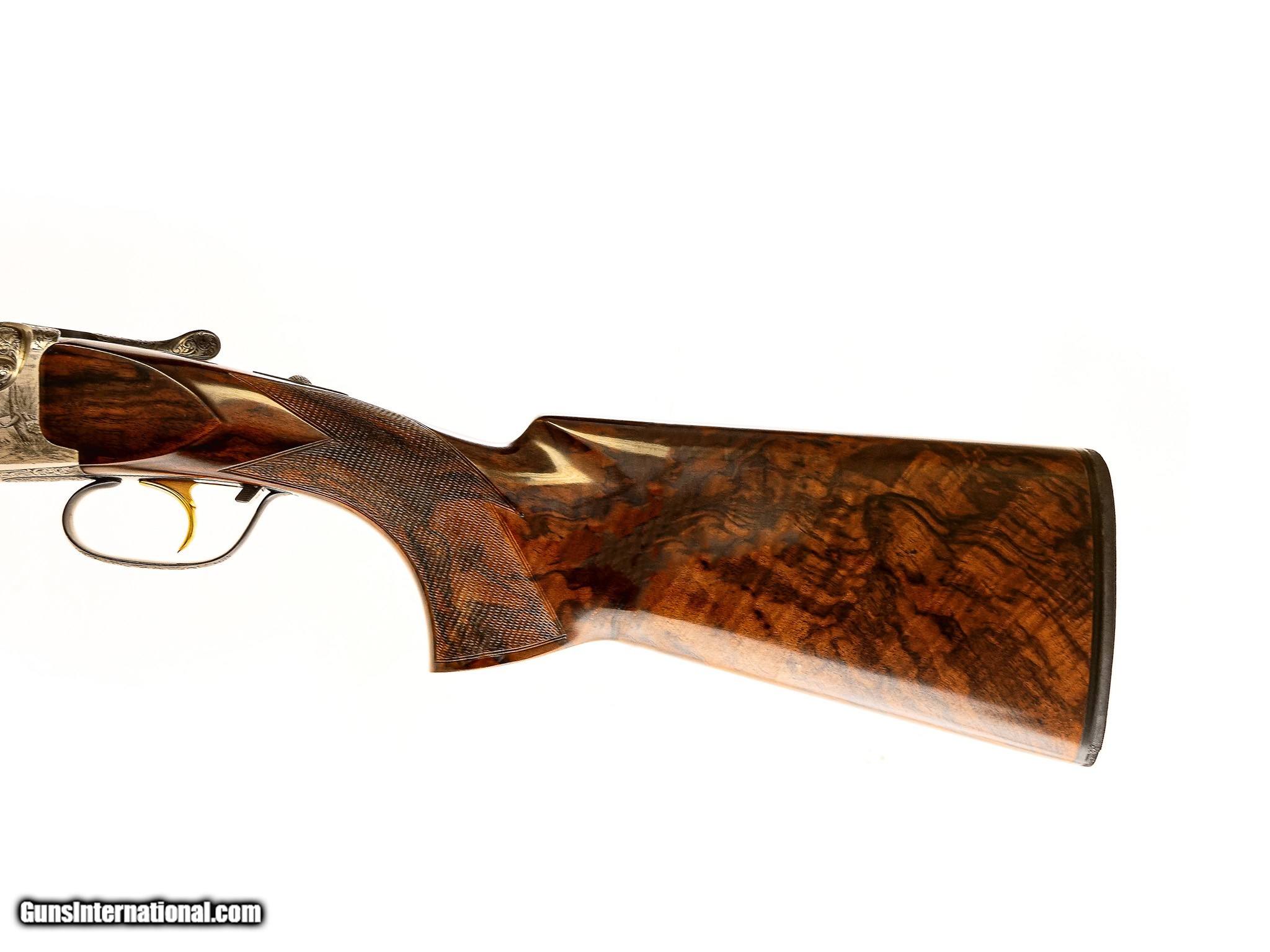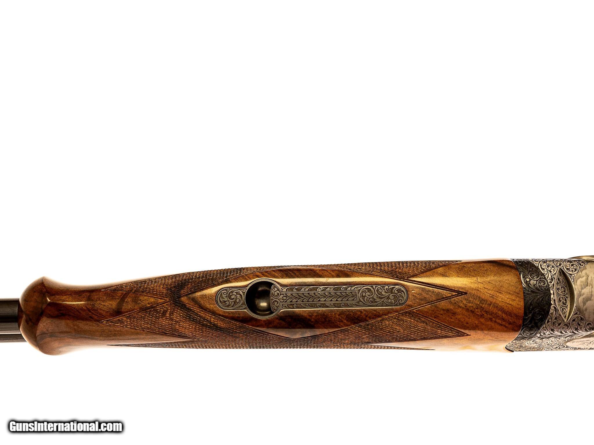 Description: Perazzi - MX8-20 SC3, O/U, 20ga. 29 ½” Barrels with Screw-in Choke Tubes. Vent rib, vent mid rib, absolutely stunning target grip stock, includes 2 matching forends, a target grip and a Schnabel grip, thin leather faced recoil pad, drop out single selective trigger, automatic ejectors, sensational bulino engraving of woodcock and quail game vignettes over a coined finish signed by Master Engraver Campana, cased with accessories, including choke tubes, spare trigger parts, Perazzi card, stock removal tool, and gun sleeves, gun appears unfired, near perfect, incredible and hard to find gun. Inv: 64962 7 lbs. 6 oz. 14 ½” x 1 ½” x 2 ¼” $25,999.00 SOLD |