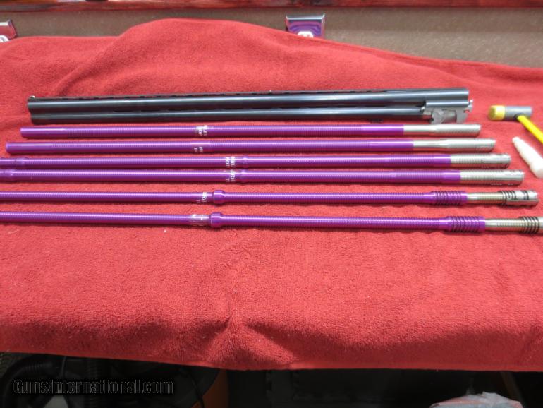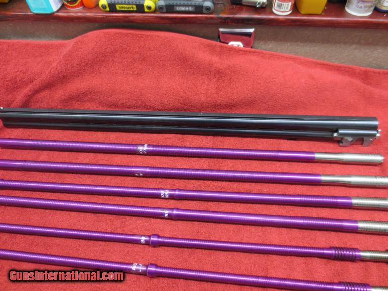 Description: For sale is a true MX8 carrier barrel. This barrel cannot be shot as a twelve gauge. Can only be shot if the tube sets installed. There are a total of 24 screw in choke tubes by Briley. The full length tubes are Briley. 29.5 inches long. Flat rib, no step. 11mm x 11mm parallel rib. The barrel weight with out the tubes is 2lb's 12.90z's. With any tube set installed the barrel weight is 3lb's 9oz's. Serial number series is 93xxx. The barrel work was done by Briley. Comes with a canvas and leather Boyt breakdown case that will hold all the tubes, accessories, the barrel/forearm and receiver butt stock. SOLD |