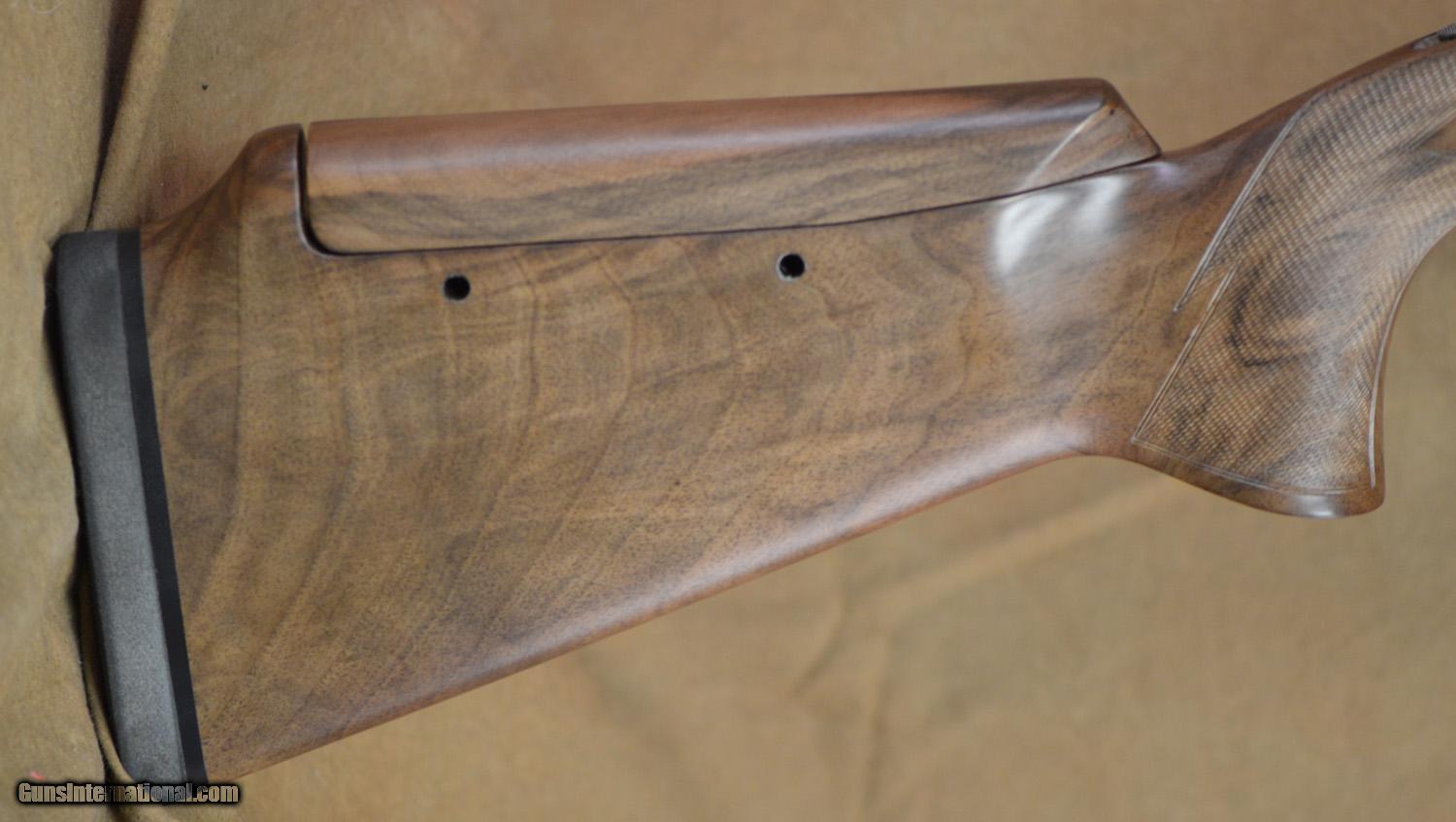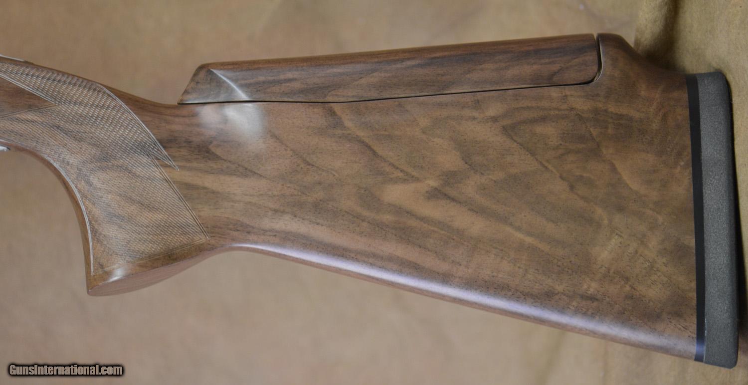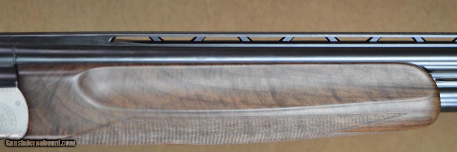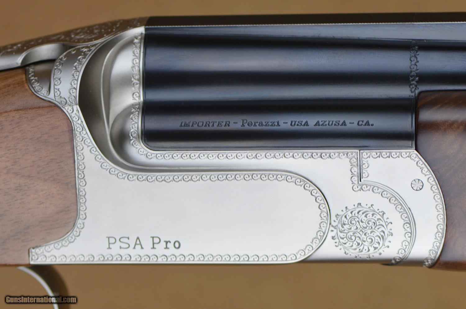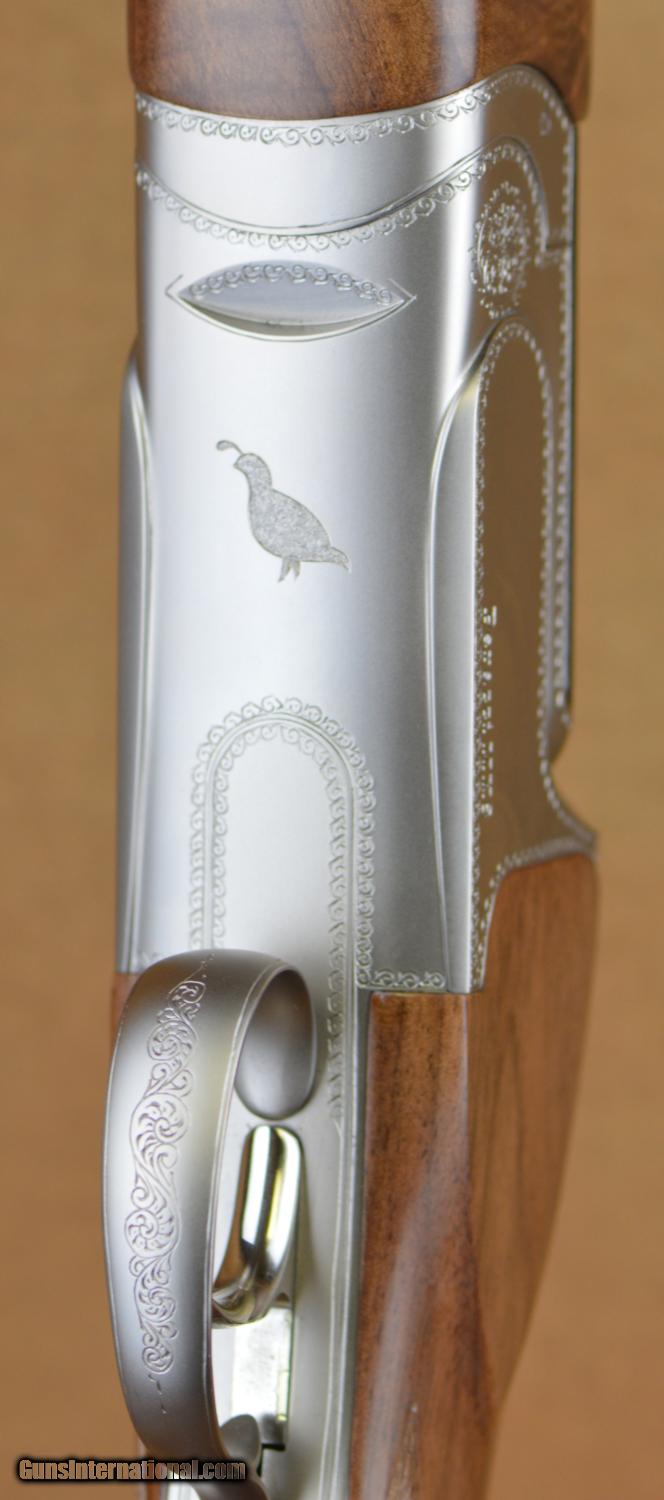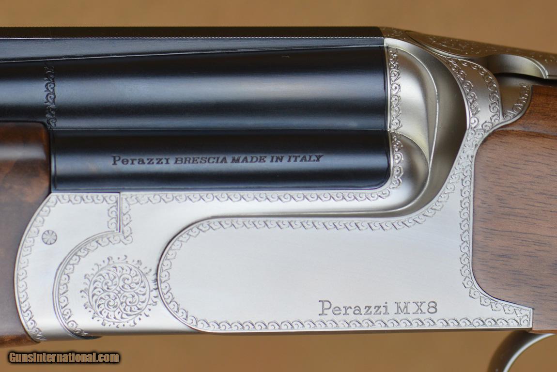Description: New Perazzi MX8 "PSA Pro" Skeet 12GA with 30" fixed choke (SKT/SKT) barrels, 11x7 2mm ramped tramline rib. Nickel receiver with border engraving and quail. Features all nickel parts (trigger guard, forearm iron, safety and toplever) and polished silver trigger. New option from Perazzi for 2015. Factory adj. comb Monte Carlo stock and slim beavertail forearm. Includes full set of Briley UL (20,28 & .410) sub-gauge tubes. Americase with tools. SOLD |
