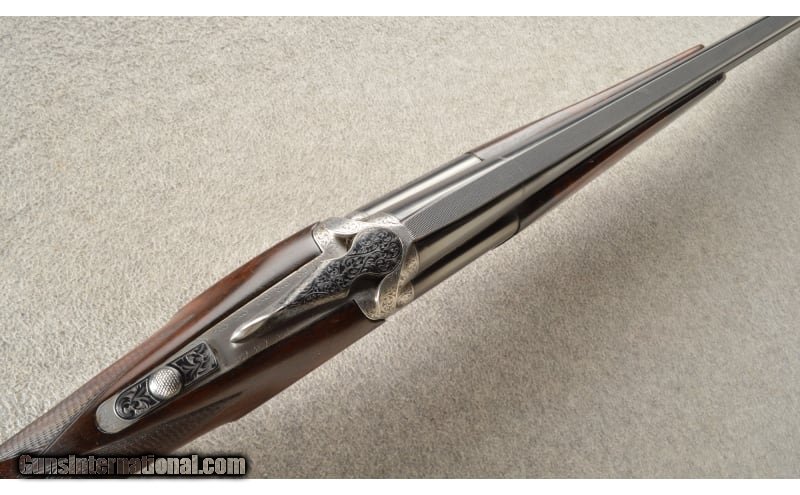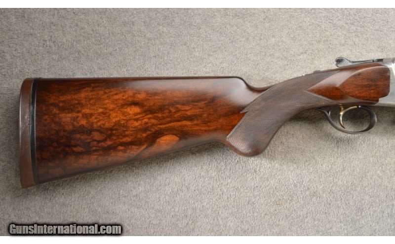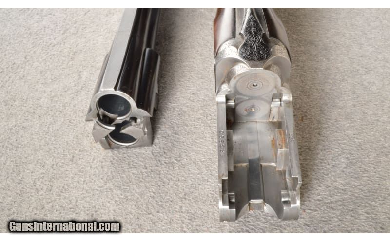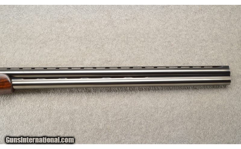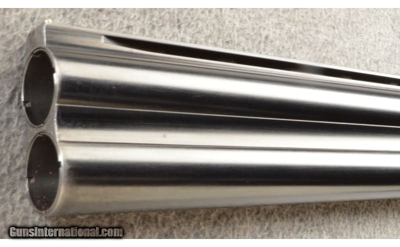 Description: The Perazzi MX8 SC3 is an over / under, top break shotgun with an Inertia trigger. This example has nickel finish game scene engraved receiver with a detachable trigger group and a manual safety / barrel selector. It has 31.5" ejector barrels with a wide checkered flat top rib and half vented side ribs. The barrels are threaded for removable Briley chokes with a front bead sight. The stocks are a two piece figured dark checkered stock and forend, rounded pistol grip, straight comb, and an OLD ENGLISH recoil pad. The drop at the comb is approximately 1 1/2" and 2" at the heel. The cast is slightly off. Comes with the factory travel case, stock tool, choke wrench, and six flush Briley chokes "Full x2, IC, CYL, MOD x2". 12 Gauge SOLD Chambers: 2 3/4" chambers. Metal Condition: There is light finish loss around the muzzles and light discoloration in the crevices and edges of the receiver. The top lever shows contact wear at the top of the lever. Wood Condition: "The stock set is in great condition and rates about 95% + with some minor handling marks, nothing major. The checkering shows no signs of damage. Bore Condition: Excellent smooth reflective bores. Barrels: 31.5" barrels. Triggers: Single gold trigger. Stock Dimensions: LOP 14 7/8". Fore End: Checkered. Butt Pad: Rubber. Sights: Bead. Chokes: Removable. Item Location: Owatonna, MN |