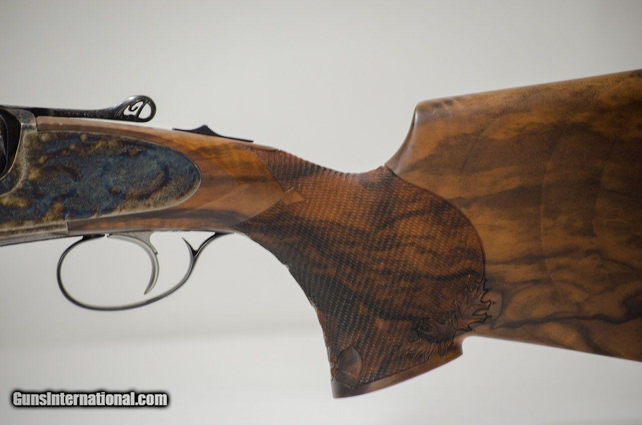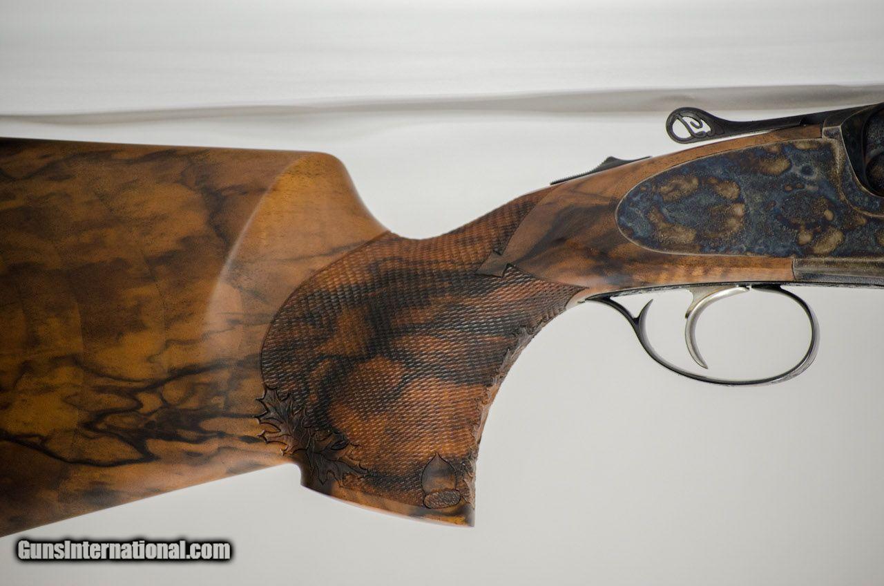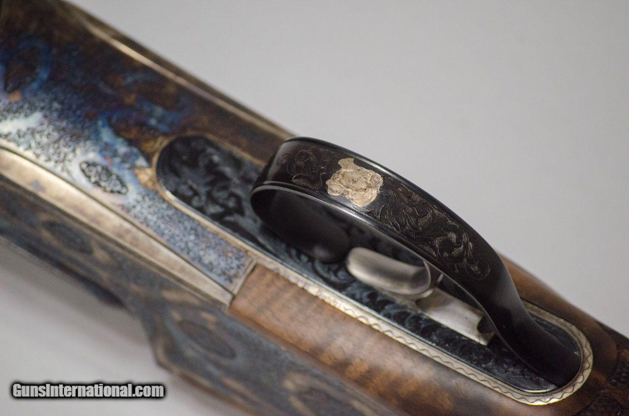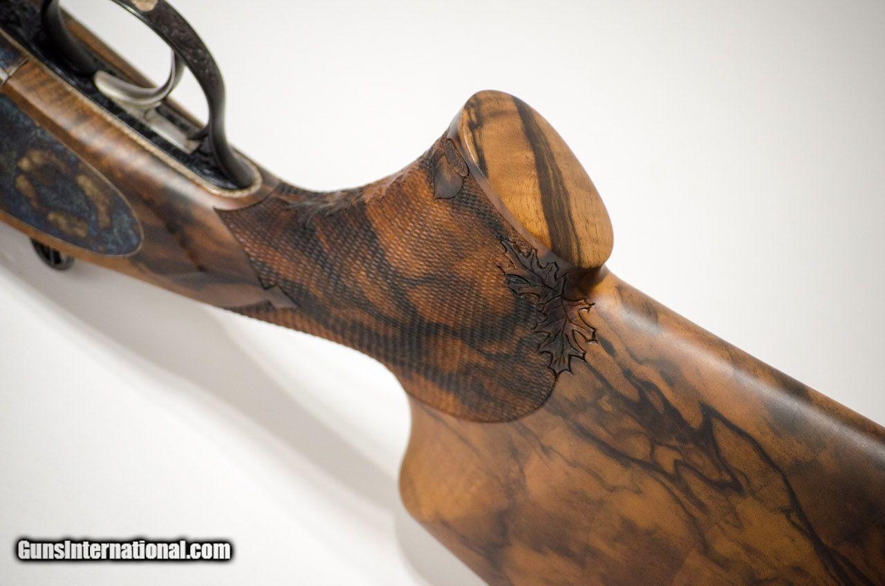 Description: Thsi shotgun was manufactured in 2005. It left the Perazzi factory as MX8 2 Barrel combo. It was then professionally upgraded to simulate a SCO Sideplate Custom. This stunning side-plate Perazzi SCO was engraved by Gobbi. Rose and scroll with case coloring. 2 Barrel set, both with step ribs (7/16 x 9/32). Barrel 1: 34″ 1.72kg fixed chokes IM/F Barrel 2: 32″ 1.64kg fixed chokes IM/F Custom Turkish Walnut stock made by Wenig. Exquisite oak and acorn checkering. LOP: 15.125″ Comb: 1.5″ parallel Drop at Monte Carlo (heel): 2.5″ Both forearms have pigeons inlaid in the bottom. All serial #s match #134922. Two barrels / two seperate forearms. SOLD |
