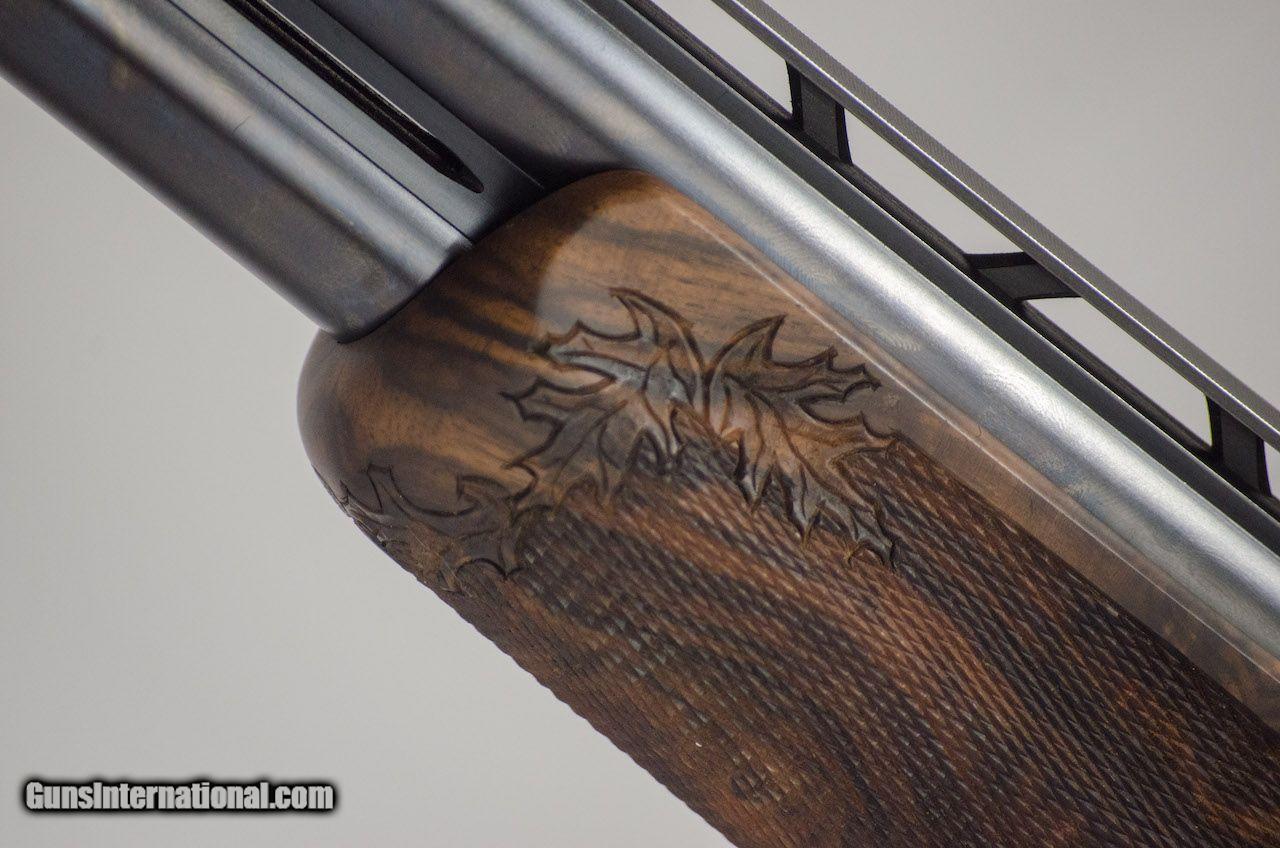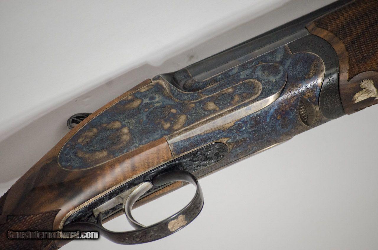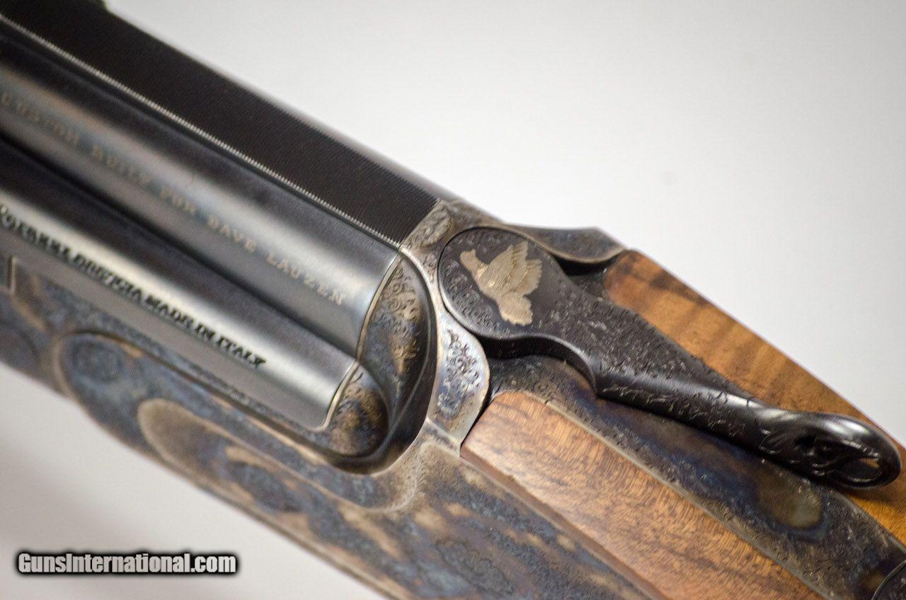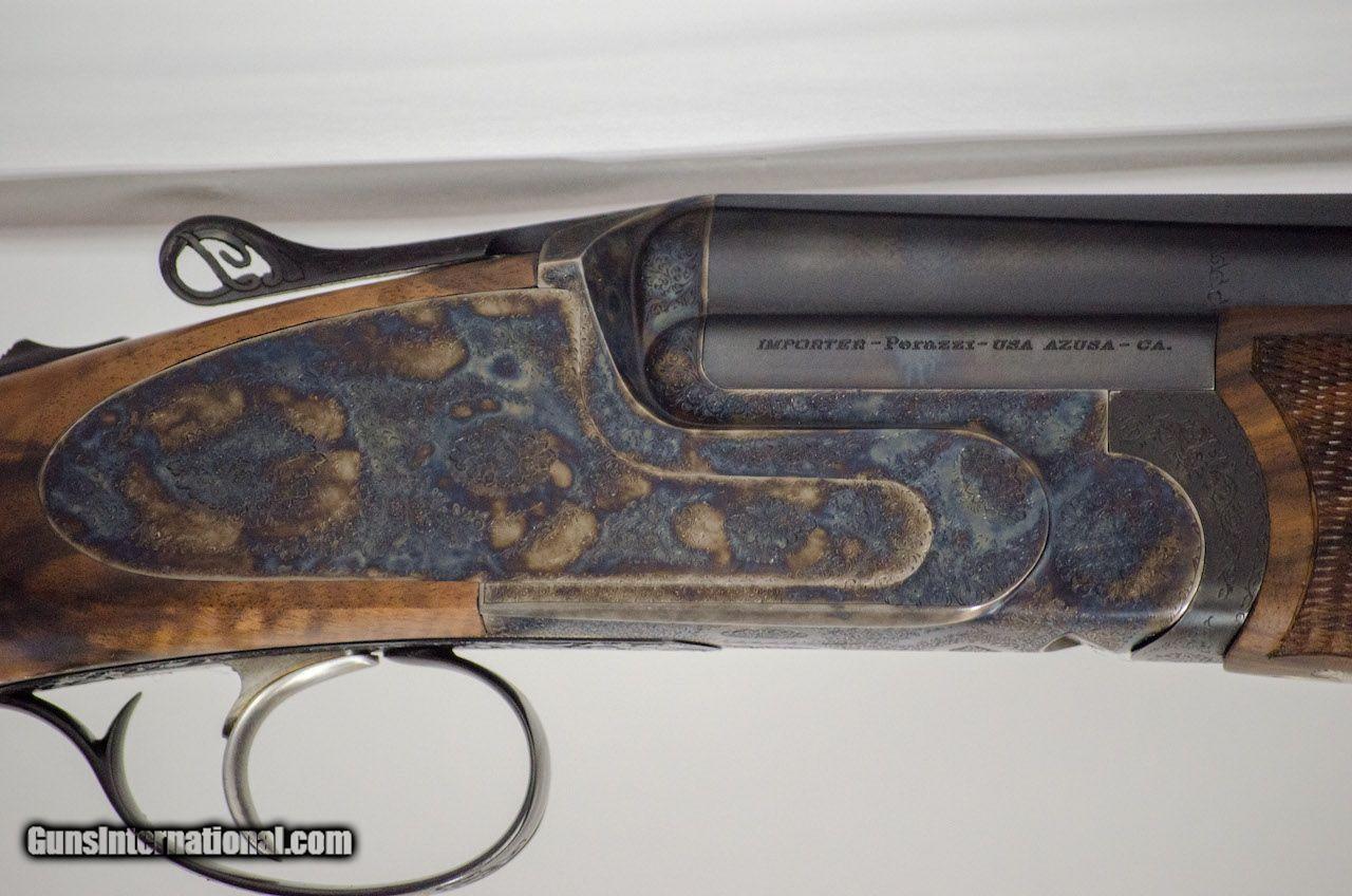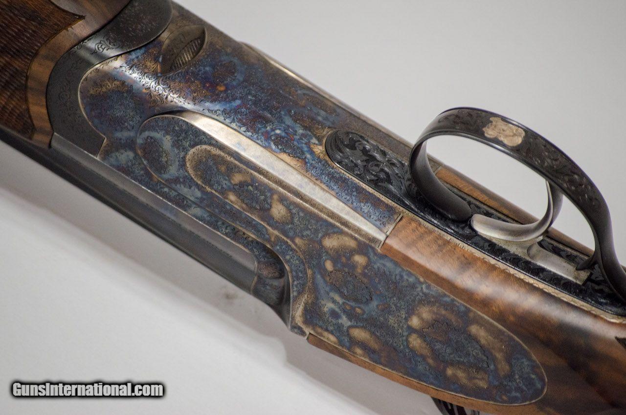 Description: Thsi shotgun was manufactured in 2005. It left the Perazzi factory as MX8 2 Barrel combo. It was then professionally upgraded to simulate a SCO Sideplate Custom. This stunning side-plate Perazzi SCO was engraved by Gobbi. Rose and scroll with case coloring. 2 Barrel set, both with step ribs (7/16 x 9/32). Barrel 1: 34″ 1.72kg fixed chokes IM/F Barrel 2: 32″ 1.64kg fixed chokes IM/F Custom Turkish Walnut stock made by Wenig. Exquisite oak and acorn checkering. LOP: 15.125″ Comb: 1.5″ parallel Drop at Monte Carlo (heel): 2.5″ Both forearms have pigeons inlaid in the bottom. All serial #s match #134922. Two barrels / two seperate forearms. SOLD |