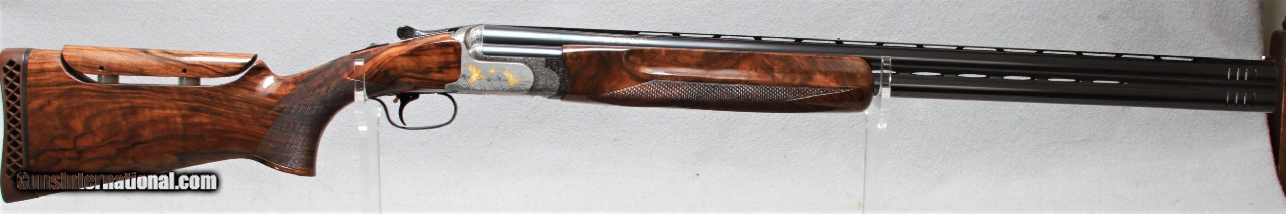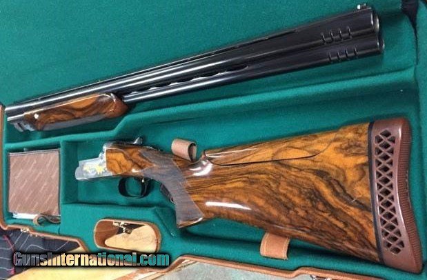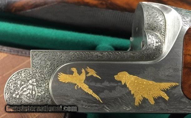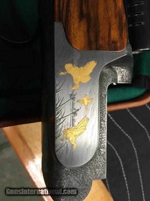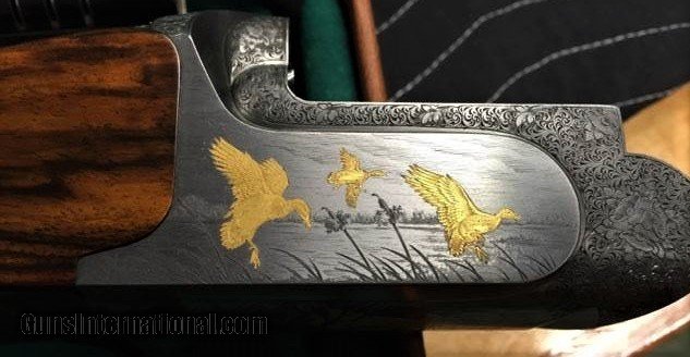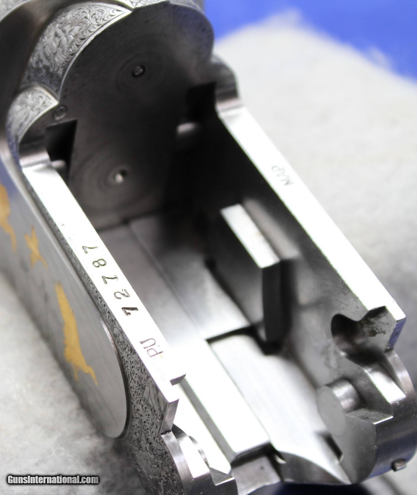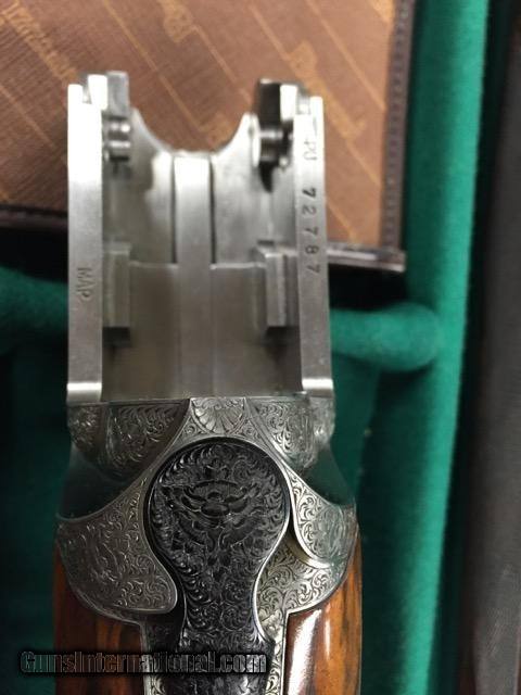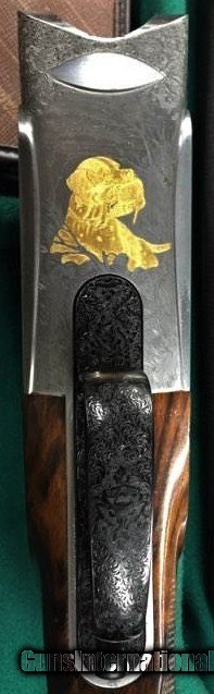 Description: Offered here is a Perazzi MX8 SCO ORO Gold four barell set (not tubed), manufactured in 1983. This gun has been meticulously maintained by the owner. It has 28” barrels all fixed choke skeet. The trigger is adjustable and removable. The comb is fully adjustable up/down and right to left. The LOP is fully adjustable by moving the trigger forward or backwards. The complete set was recently sent to Giacomo Sporting USA, a Perazzi factory approved gunsmith, to replace the forearm on the .12 Ga. barrel. While there, the other three barell sets were re-fitted and their ejector springs replaced and timed to factory specifications and a new locking block was installed. The frame has been exquisitely engraved and signed by the renowned Angelo Galeazzi who retired from the art in 1994. One of his signature styles was to compose a picture within a finite space and capture the magic of its story. There are six gold inlays depicting a pointer and two flushed pheasants on the left side of the frame; three ducks preparing to land on the right side and a retriever with game in the mouth on the underside. You can see Mr. Galeazzi’s signature behind the mallard on the right side of the frame. The entire set comes with the original Perazzi leather bound case. Each barrel set is housed in its own sleeve and compartment to eliminate any chance of rubbing against one another. Check my photos closely and email me at mibridownrangegmail if you have any questions. SOLD SOLD Shotgun Gauge: 12 Gauge, 20 Gauge, 28 Gauge, .410 Gauge Manufacturer: Perazzi Model: MX8 SCO ORO Barrel Length: 28 Bore: Clear Condition: Excellent Metal Condition: Excellent Wood Condition: Excellent Bore Condition: Clear and shiny Action: O/U Triggers: adjustable Stock: Walnut LOP: adjustable Finish: Highly polished blue Manufacture Date: 1983 Chokes: fixed skeet Engraving: By Angelo Galeazzi Extras: see description Case: hard case included Item Location: Connecticut |