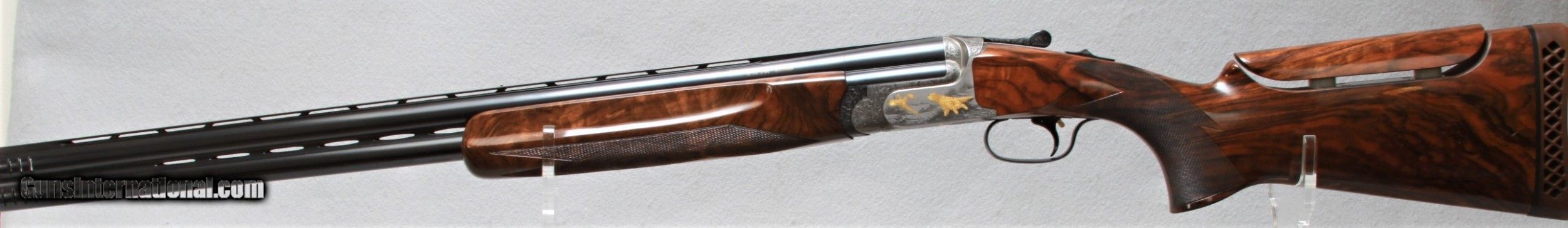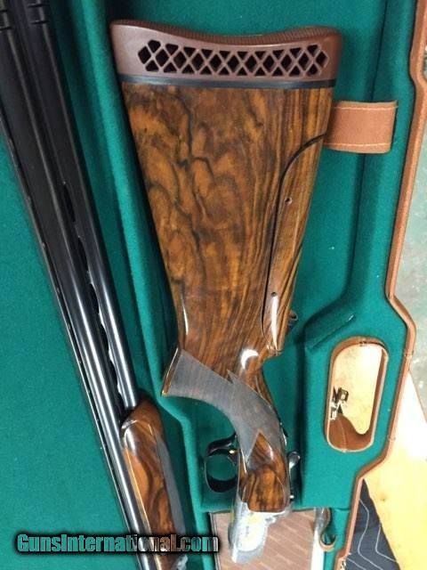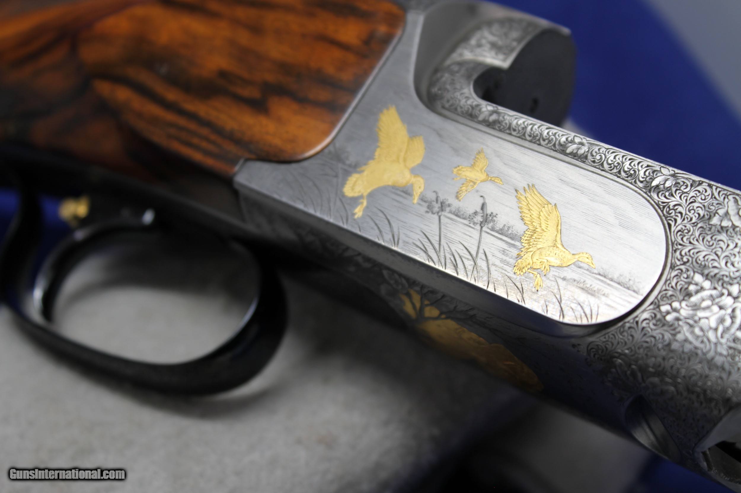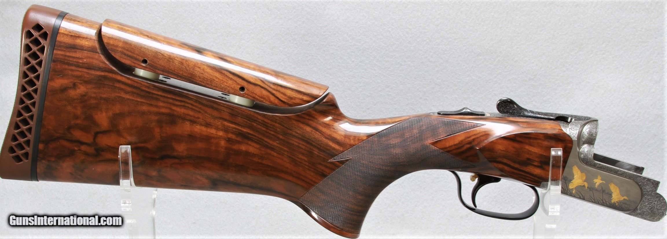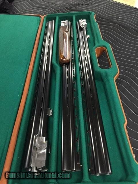 Description: Offered here is a Perazzi MX8 SCO ORO Gold four barell set (not tubed), manufactured in 1983. This gun has been meticulously maintained by the owner. It has 28” barrels all fixed choke skeet. The trigger is adjustable and removable. The comb is fully adjustable up/down and right to left. The LOP is fully adjustable by moving the trigger forward or backwards. The complete set was recently sent to Giacomo Sporting USA, a Perazzi factory approved gunsmith, to replace the forearm on the .12 Ga. barrel. While there, the other three barell sets were re-fitted and their ejector springs replaced and timed to factory specifications and a new locking block was installed. The frame has been exquisitely engraved and signed by the renowned Angelo Galeazzi who retired from the art in 1994. One of his signature styles was to compose a picture within a finite space and capture the magic of its story. There are six gold inlays depicting a pointer and two flushed pheasants on the left side of the frame; three ducks preparing to land on the right side and a retriever with game in the mouth on the underside. You can see Mr. Galeazzi’s signature behind the mallard on the right side of the frame. The entire set comes with the original Perazzi leather bound case. Each barrel set is housed in its own sleeve and compartment to eliminate any chance of rubbing against one another. Check my photos closely and email me at mibridownrangegmail if you have any questions. SOLD SOLD Shotgun Gauge: 12 Gauge, 20 Gauge, 28 Gauge, .410 Gauge Manufacturer: Perazzi Model: MX8 SCO ORO Barrel Length: 28 Bore: Clear Condition: Excellent Metal Condition: Excellent Wood Condition: Excellent Bore Condition: Clear and shiny Action: O/U Triggers: adjustable Stock: Walnut LOP: adjustable Finish: Highly polished blue Manufacture Date: 1983 Chokes: fixed skeet Engraving: By Angelo Galeazzi Extras: see description Case: hard case included Item Location: Connecticut |