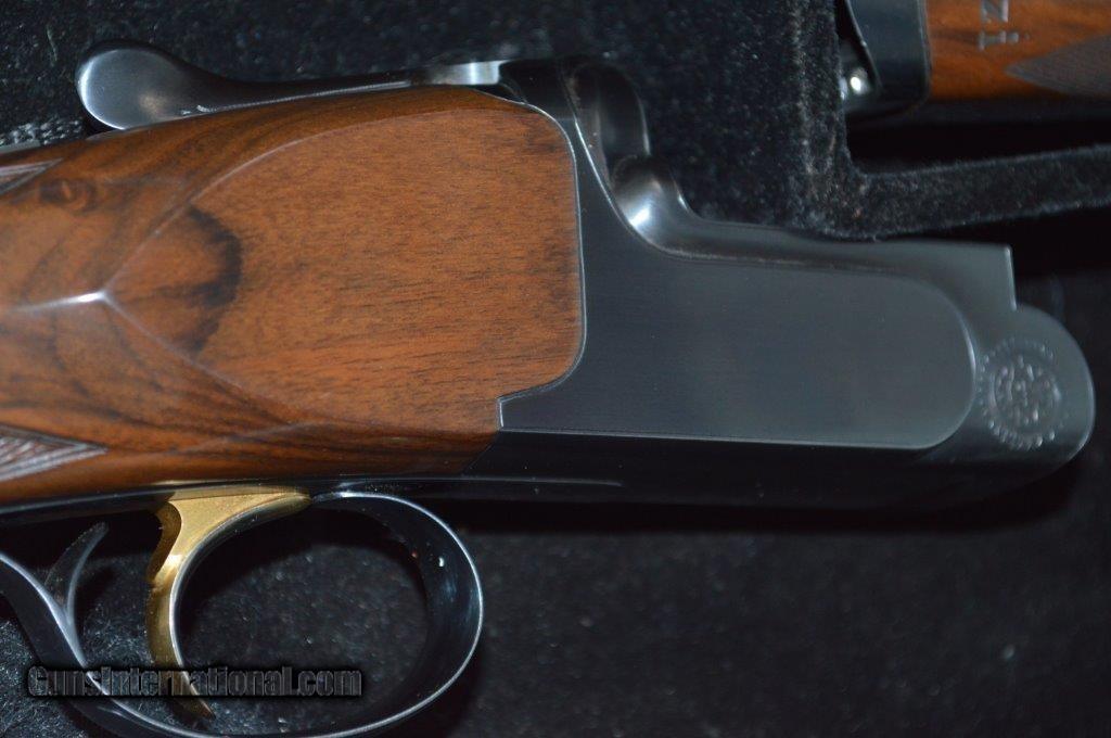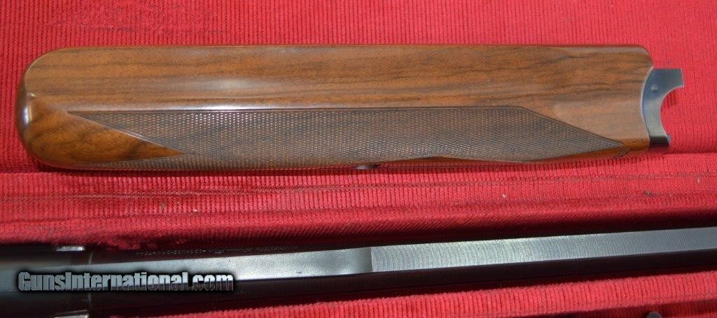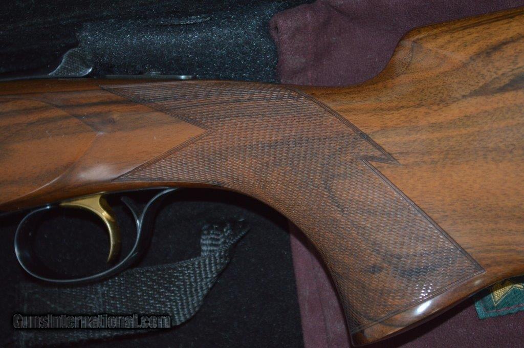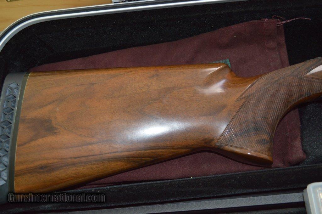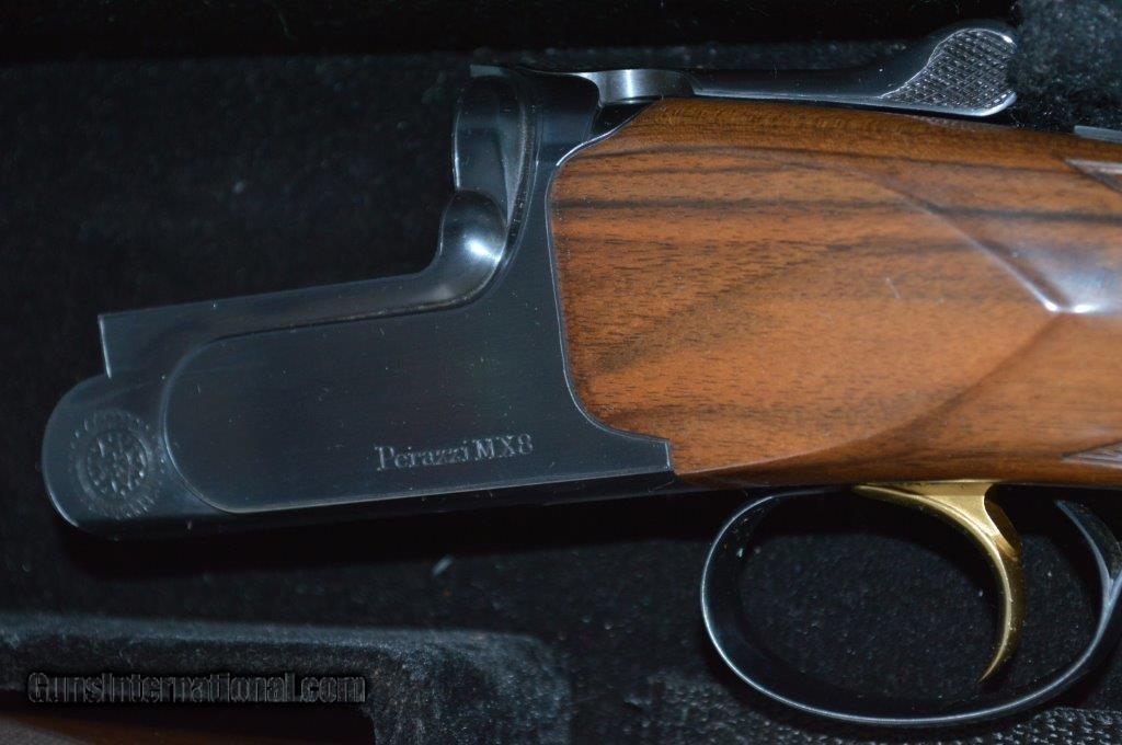 Description: Perazzi MX8 28" with Briley Ultra-Lite all gauge tubes. This is a high condition gun with very little blue wear and just a very few minor bumps in the wood. The tubes have extra Briley chokes and the 12 gauge barrel is choked with Brileys as well. The hand checkering is flawless and the wood finish is beautiful. The length of pull is 14-1/4" to a recoil pad and the gun weighs 7 pounds 12 oz. This gun is set up to shoot skeet or sporting clays and gives you the option to shoot all the small gauges as well. It comes in a fitted case to transport all of the equipment to your shoots or field. It has a typical 11mm stepped ventilated rib with a mid bead. SOLD |