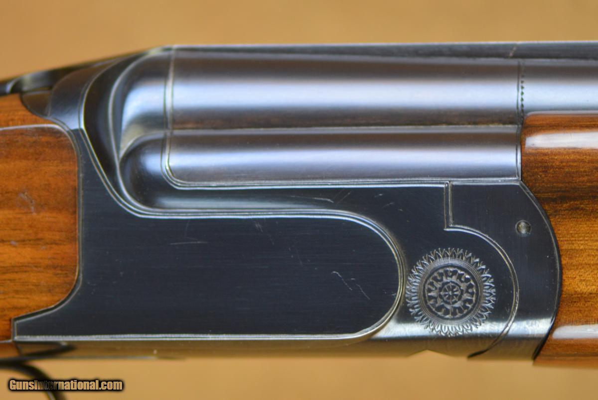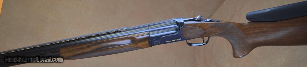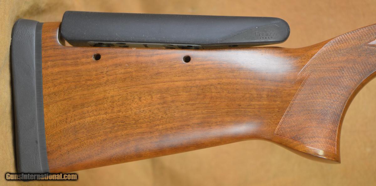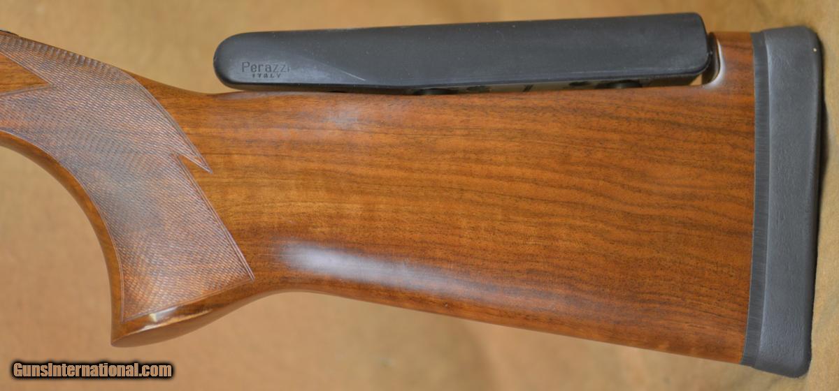 Description: Perazzi MX8 Special 12GA with 31 1/2" 4mm Stepped Rib, fixed (.016/.028) choke barrels. Factory blued MX8 Special receiver with removable, adj. trigger (non-selective). Minor bluing wear on edges of receiver and on trigger guard. Factory pistol grip stock with factory silicon adj. comb, right-hand palmswell and beavertail forearm. Overall finish of wood is outstanding, repaired crack behind tang in stock, wood is not original to this gun, barrels have been fit and re-numbered to match. Includes case. SOLD |