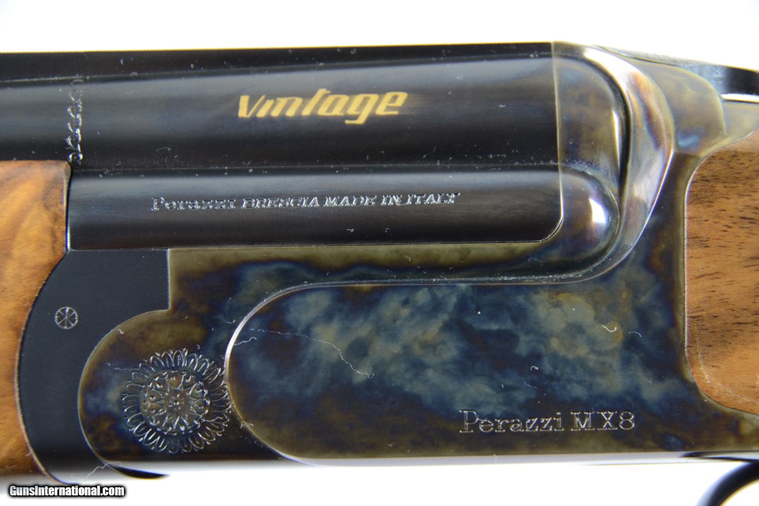 Description: Perazzi MX8 Vintage 12ga 31 1/2"" Sporting Shotgun SN:154745 This Perazzi has beautiful color case hardened frame with upgraded SC2 grade wood with a selective trigger. New in box with factory adjustable comb. Federal firearms laws do not allow us to ship firearms directly to you. Please contact us for ordering and shipping information. Gauge: 12 Barrel Weight: 1710g Barrel Length: 31 1/2" Chamber: 2 3/4" Bore Diameter: 18.7 Chokes: 7 Extended screw in Rib: 4mm Step classic Rib Stock Dimensions Drop at nose: 1 1/2" Drop at heel: 2 1/4" Cast Off: 1/8" at heel Pad: Cervalatti 22mm Forend Style: Grooved Sporting style Length of pull: 14 3/4" Comb: Adjustable Weight: 8lbs 10oz SOLD |