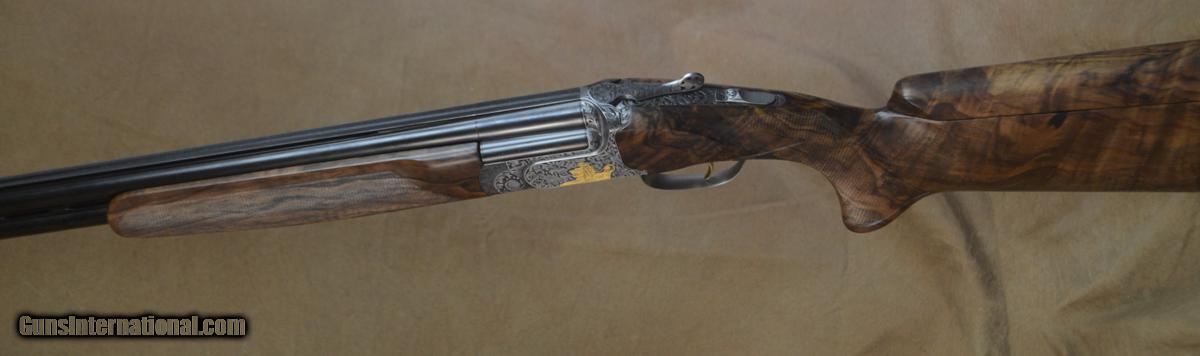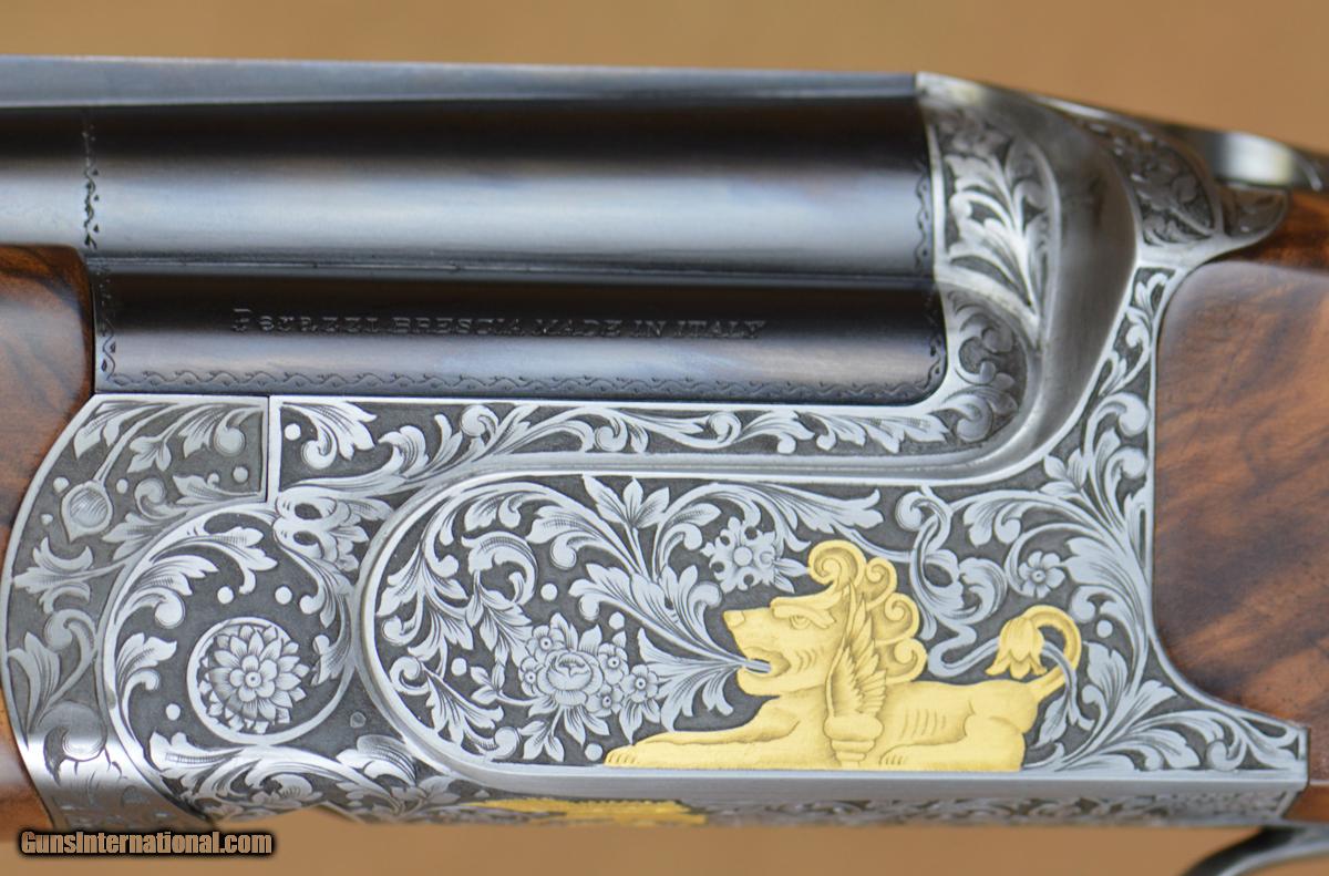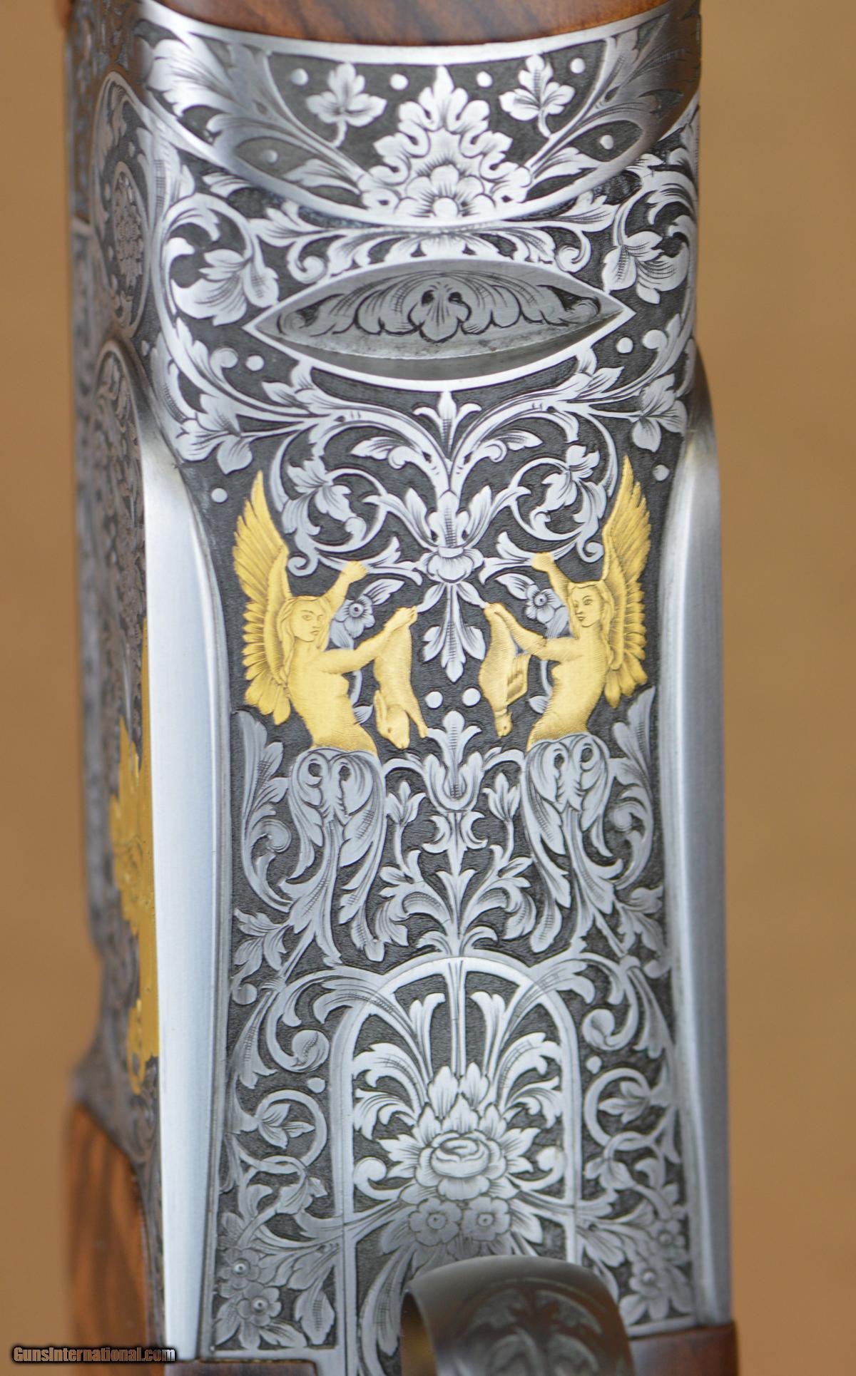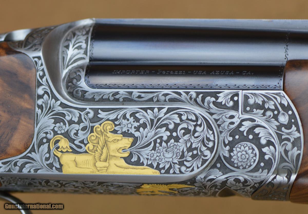 Description: New Perazzi MX8C SCO Gold Sporting 12GA with 31 1/2" factory choke tubed barrels, 11x7 tapered flat tramline rib. Coin finished SCO No. 25 pattern with gold featuring fully hand engraved Griffins, Angels and scrolls by the Italian Master Engraving studio Creative Art. Selective removable trigger group, outstanding SCO Grade Adj. Comb stock with right-hand palmswell and fully checkered PSA Pro style forearm. Includes full leather factory case, choke tubes and tools. SOLD |