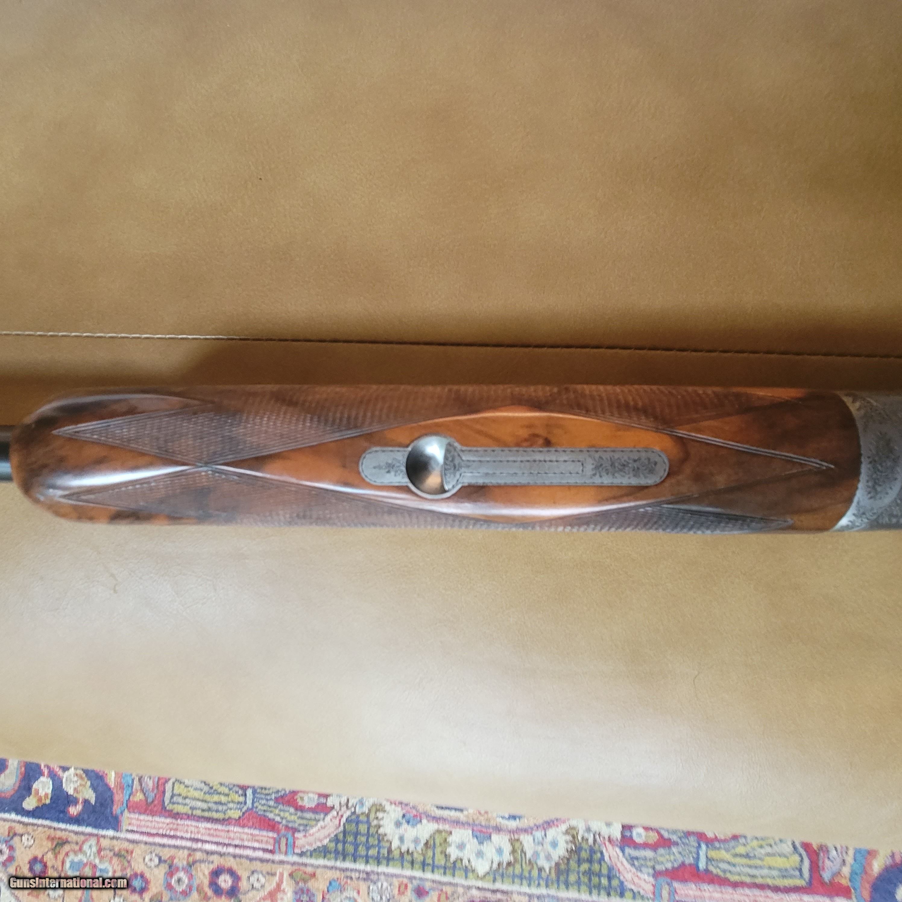 Description: Circa 1993. This Italian made 12 gauge boxlock shotgun is fit with both a (A) 29 - 1/2" and (B) 31 -1/2" mono-bloc nitro proof blued steel barrels that are built with ejectors and 2 - 3/4" chambers. Both barrels are choked Full and Improved Modified. The ribs on barrel set (A) consists of a ventilated side rib and a machined ventilated top rib with a hi-visibility orange front sight. The ribs on barrel set (B) consist of a ventilated side rib and a tapered machined ventilated top rib with white front and middle sight beads. Left side top barrel of barrel set (A) near breech reads "PERAZZI BRESCIA MADE IN ITALY". The left side top barrel also reads "CAM.70", "18.4" and Italian proof marks while the left side of the bottom barrel reads "KG 1.530", "18.4" and Italian proof marks. Bottom of the bottom barrel reads "12-70". Bottom of the barrel’s mon-block have the serial number "88300" and Italian poof marks. Left side of the top barrel set (B) near breech reads "PERAZZI BRESCIA MADE IN ITALY 12 GA 2 3/4" CHAMBER". The left side top barrel also reads "CAM.70", "18.4" and Italian proof marks while the left side of the bottom barrel reads "KG 1.620", "18.4" and Italian proof marks. Bottom of the bottom barrel reads "20-70". Bottom of the barrel’s mono-bloc have the number "88020", "MTR" and Italian proof marks. The coin finish action with single inertia removable trigger group is adorned with rose bouquets and scrolls engraving signed by "CONDANI INC" on the right side by trigger plate and an engraved top lever with engraved thumbpiece. The safe slide is checkered with "S" on the tang directly above and the word "BLOCCATO" both inlaid in gold. Gun is non-auto safe. The honey-color Turkish walnut stock with handsome dark contrasting streaks is furnished with 2 checkered panels, pistol hand grip, and black rubber recoil pad. Beavertail forend similarly checkered with a lightly scroll engraved Deeley style lever release. Iron metal is engraved with scrolls and interior metals are blacked with serial number. CONDITION: Excellent. Both barrel sets with approximately 85% blue with rub marks from forend. Action, ejectors, and trigger are sound and the barrels are tight. Stock and forend with slight handling/storage marks. (CP) AccessoriesBBL, extra firing pins and tool Barrel Length(A) 29 - 1/2" (B) 31 - 1/2" Barrel Wall Thickness(A)O:.033 U:.030 (B)O:.031 U:.033 Chamber2 - 3/4" (BOTH) Choke(A)O:.032 U:.025 (B)O:.042 U:.028 Drop at Comb1 - 1/2" Drop at Heel2" FFL StatusModern Gauge12 bore (Both) Internal Bore Diameter(A)O:.725 U:.726 (B)O:.727 U:.725 Length of Pull14 - 1/4" ManufacturerPerazzi ModelSC3 SOLD Shotgun Gauge: 12 Gauge Manufacturer: Perazzi Model: SC3 Barrel Length: 29 - 1/2" and 31 - 1/2 Manufacture Date: 1993 Engraving: Scroll work Extras: Extra firing pins and tool Item Location: Atlanta |