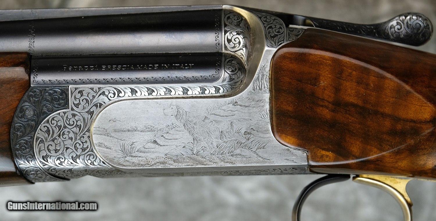 Description: Pre-Owned Perazzi MX8 SC3 Skeet Combo 12GA/12GA with 29 1/2" fixed (SKT/SKT) Heavy Barrels, Additional 29 1/2" Briley Thinwall choked light-weight barrel with full set of Briley UL (20/28/.410) sub-gauge tubes fitted to barrels. Coin finished SC3 Grade action featuring fully hand engraved scrolls and game scenes by Gamba; receiver shows darkening and very light rust on left-side of action, factory removable non-selective flat spring trigger group, bluing wear on trigger group and trigger guard. Factory pistol grip stock with right-hand palmswell and beavertail forearm. Handling marks, finish and checkering wear. Consignment, ineligible for trade-ins. SOLD Shotgun Gauge: 12 Gauge |
