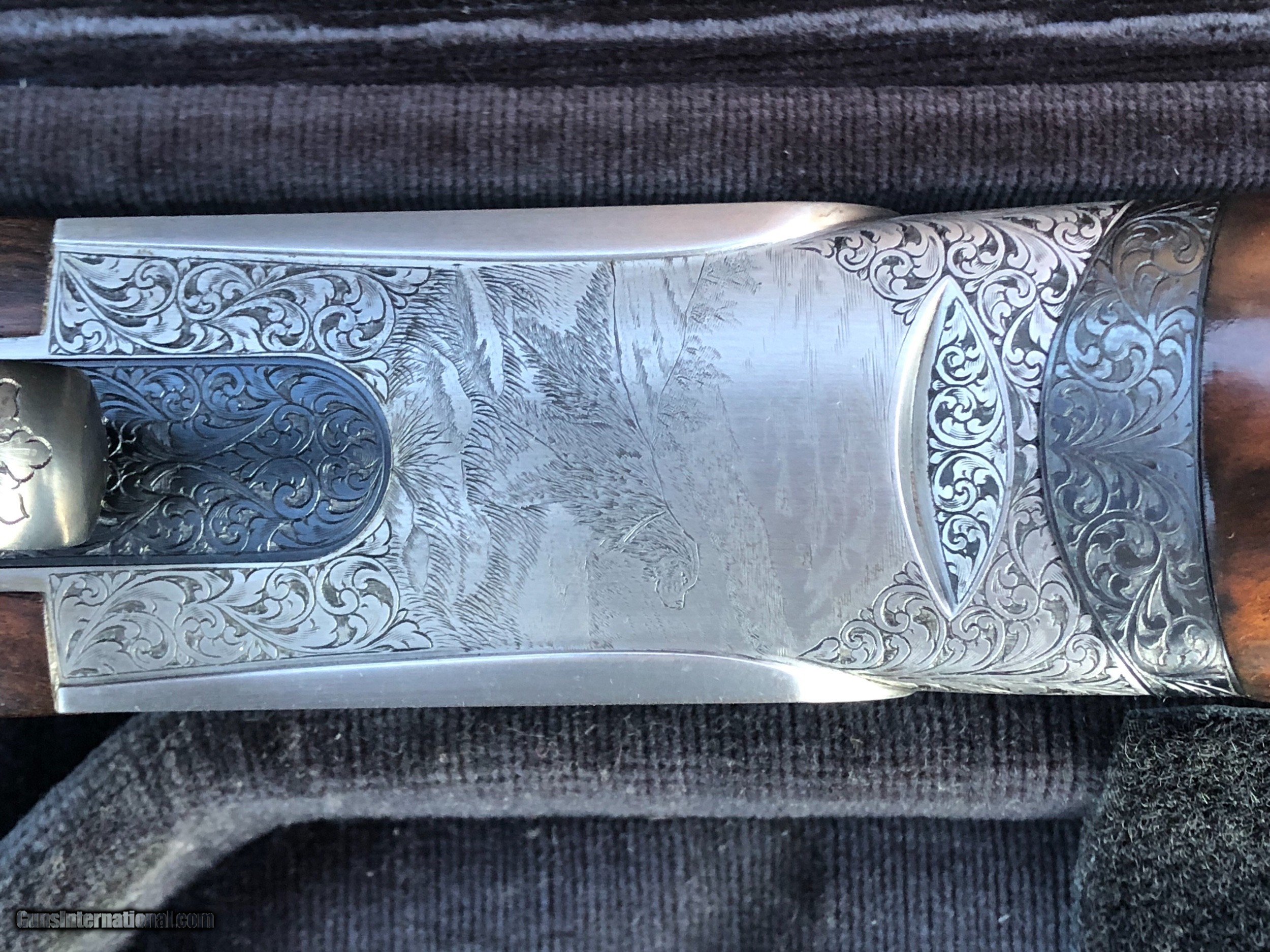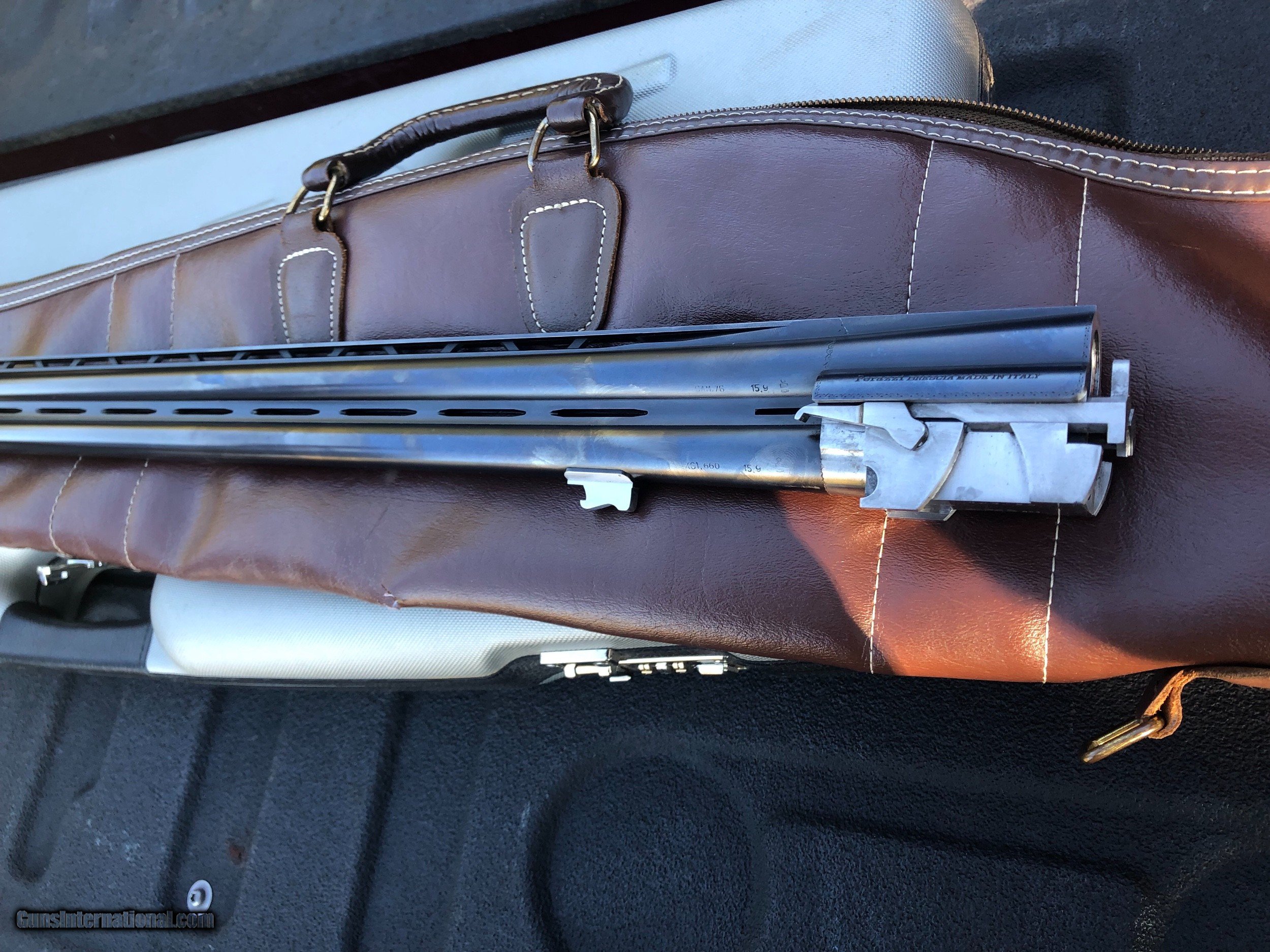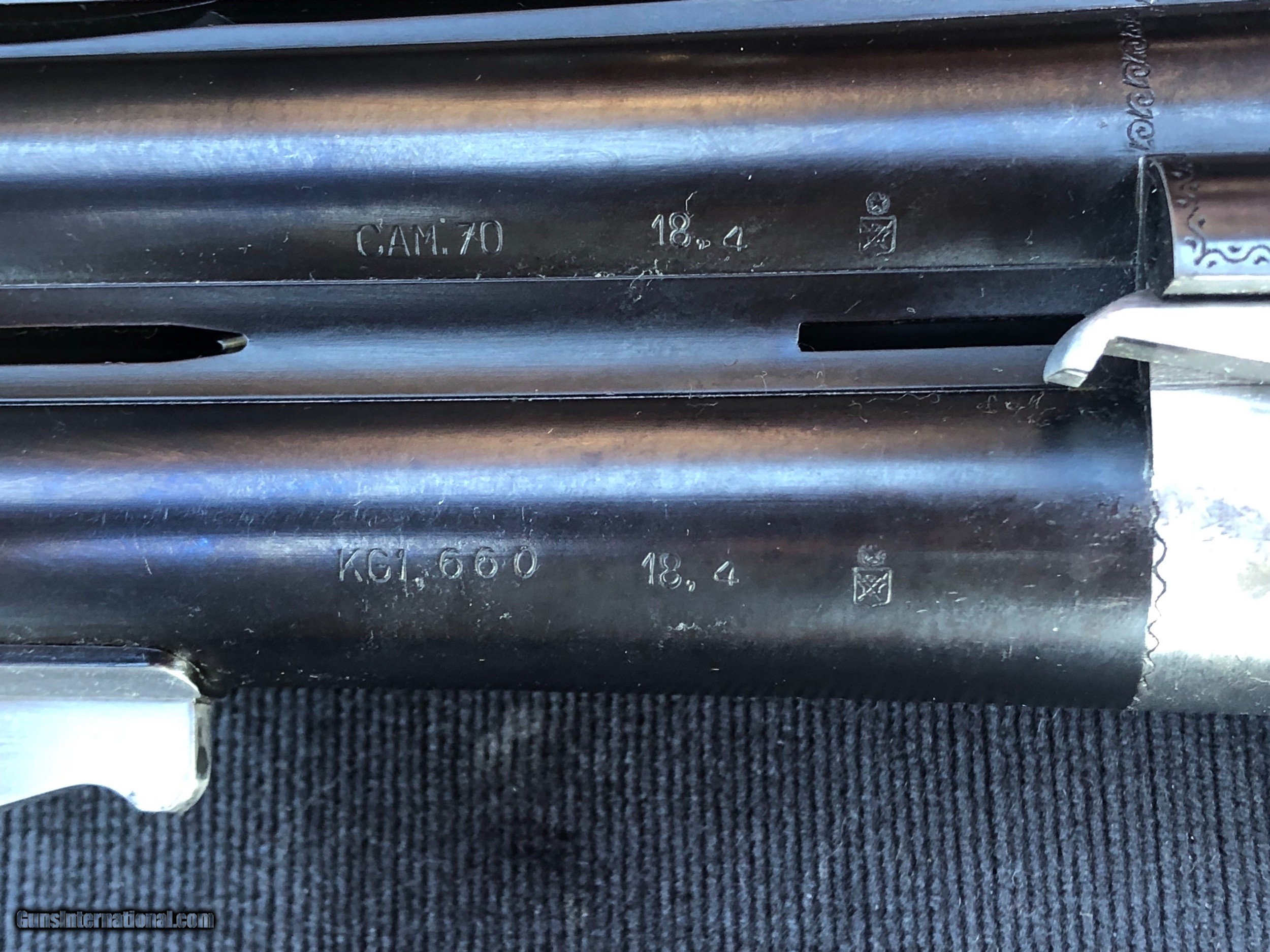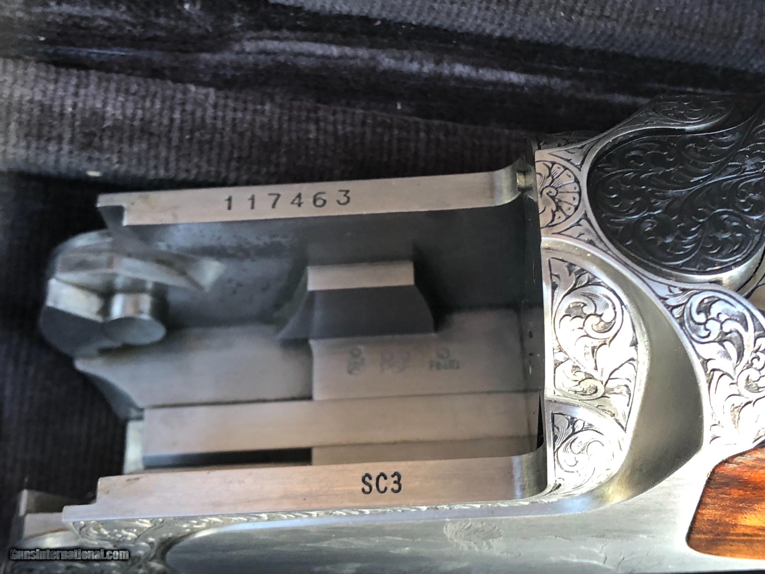 Description: This is a gorgeous late 90's SC3 Sporter that rings the bell in all areas. A Badalini game scene engraved gun with 29 1/2" 12 gauge barrels that are factory choked and include a boatload of extended chokes. It features the popular tramline vent rib and selective detachable trigger group. All numbers match! The wood is extra nice and the forend is a non-schnabel that is fully checkered-a nice bonus. The stock dimensions are 14 3/4 x 1 3/8 x 2 1/8 with a small right hand palm swell. Included with this gun are a set of 20ga SC3 barrels that are 31 1/2 inches long and are factory screw choked. This set is perfectly fitted and the serial number is about 1800 numbers higher. This barrel set also has the tramline rib. The gun weighs 8-7 with the 12 ga Barrels and gives you great versatility with the 12/20 gauge combination. Use buy now and I'll insure and ship it in the lower 48. A lotta gun for a very reasonable price! SOLD |