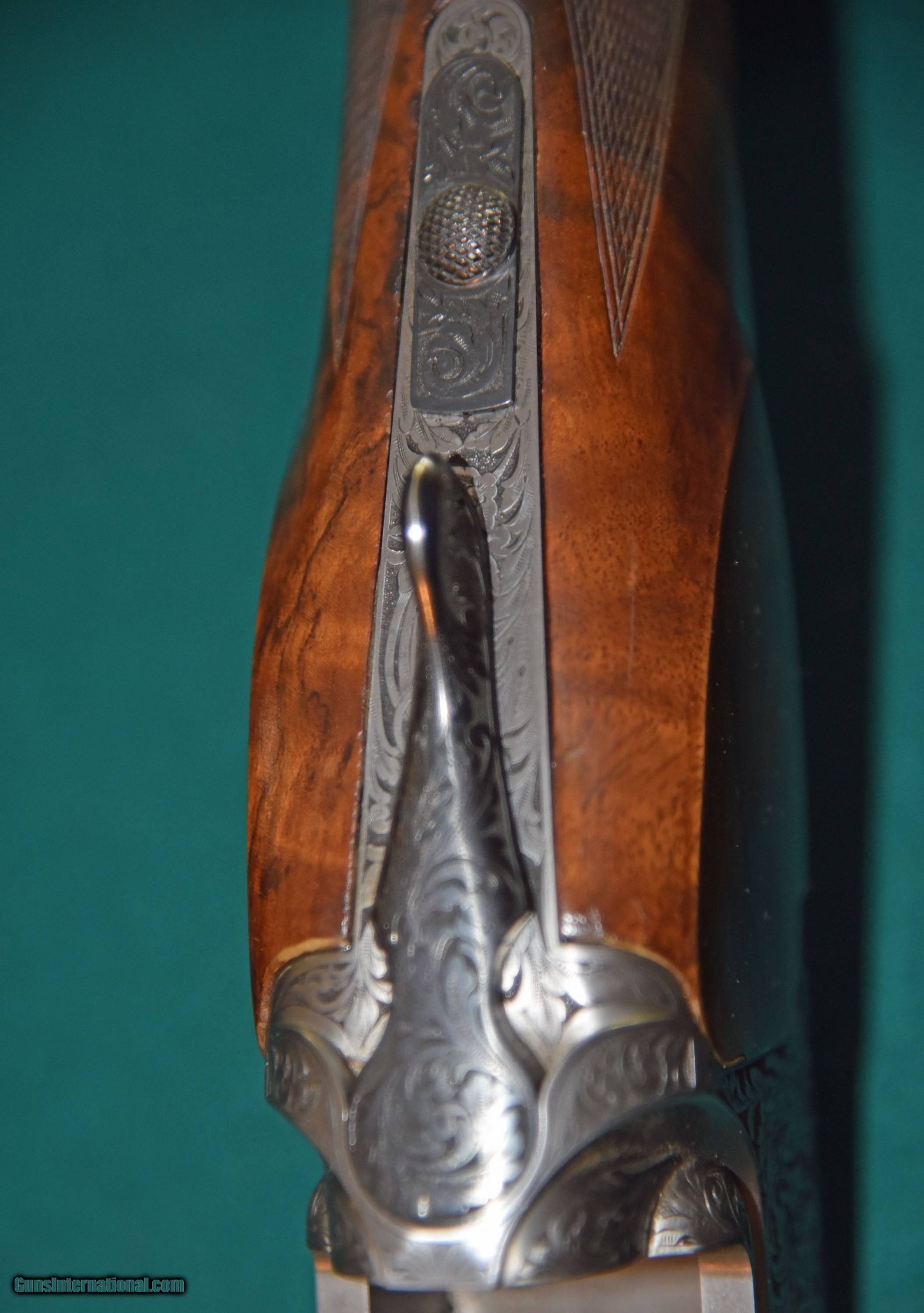 Description: Perazzi SCO 12 ga Here we have a gorgeous Perazzi SCO (SN 120XXX) with an action exquisitely engraved by Creative Arts of rambling acanthus. Gun is stocked with a pistol grip of stunningly beautiful Turkish walnut with swirling streaks and marbling intermixed with honey and chocolate colorations. Comes equipped with a flat tapered ventilated rib on 31 ½” barrels equipped with Briley thin wall chokes. Fitted with a removable selectable trigger group. Gun weighs 8lbs 4 0zs and is lively to the hand with good stock dimensions of DAC 1.25" DAH of Monte Carlo 1.5" and LOP 14.75". Comes Briley thin wall chokes, extra V springs, firing pins, tool and original papers. This gun has been a safe queen for several years and has less than a 1000 rounds fired since purchased, wood has one little ding on the bottom of the pistol grip. All in all here is a 99% SCO with great wood, checkering, engraving and metal blue for a price amounting to half of what a replacement gun would cost It is a dream gun to shoot and would be a great addition to any collection. Price: $20,000.00 SOLD |