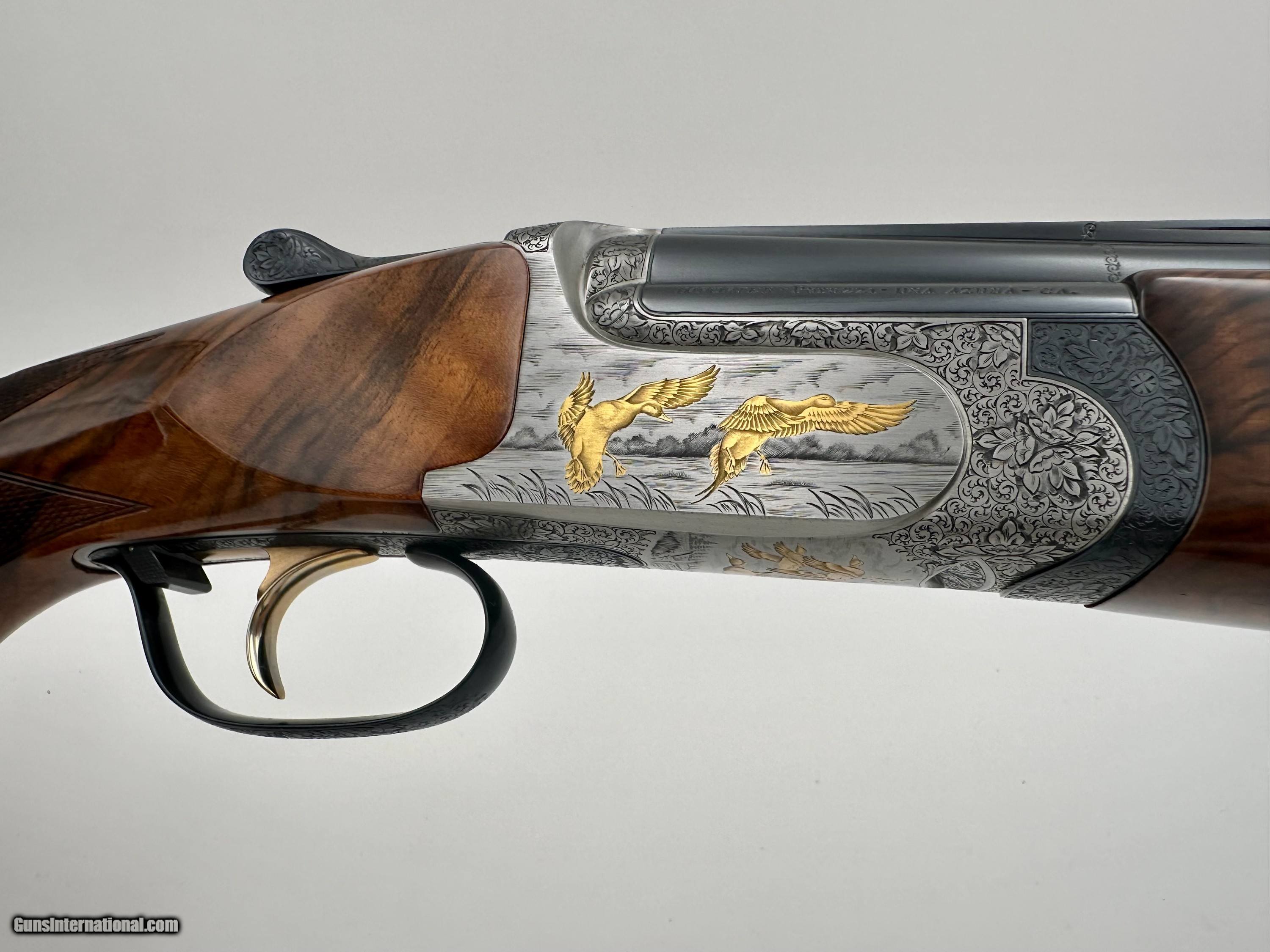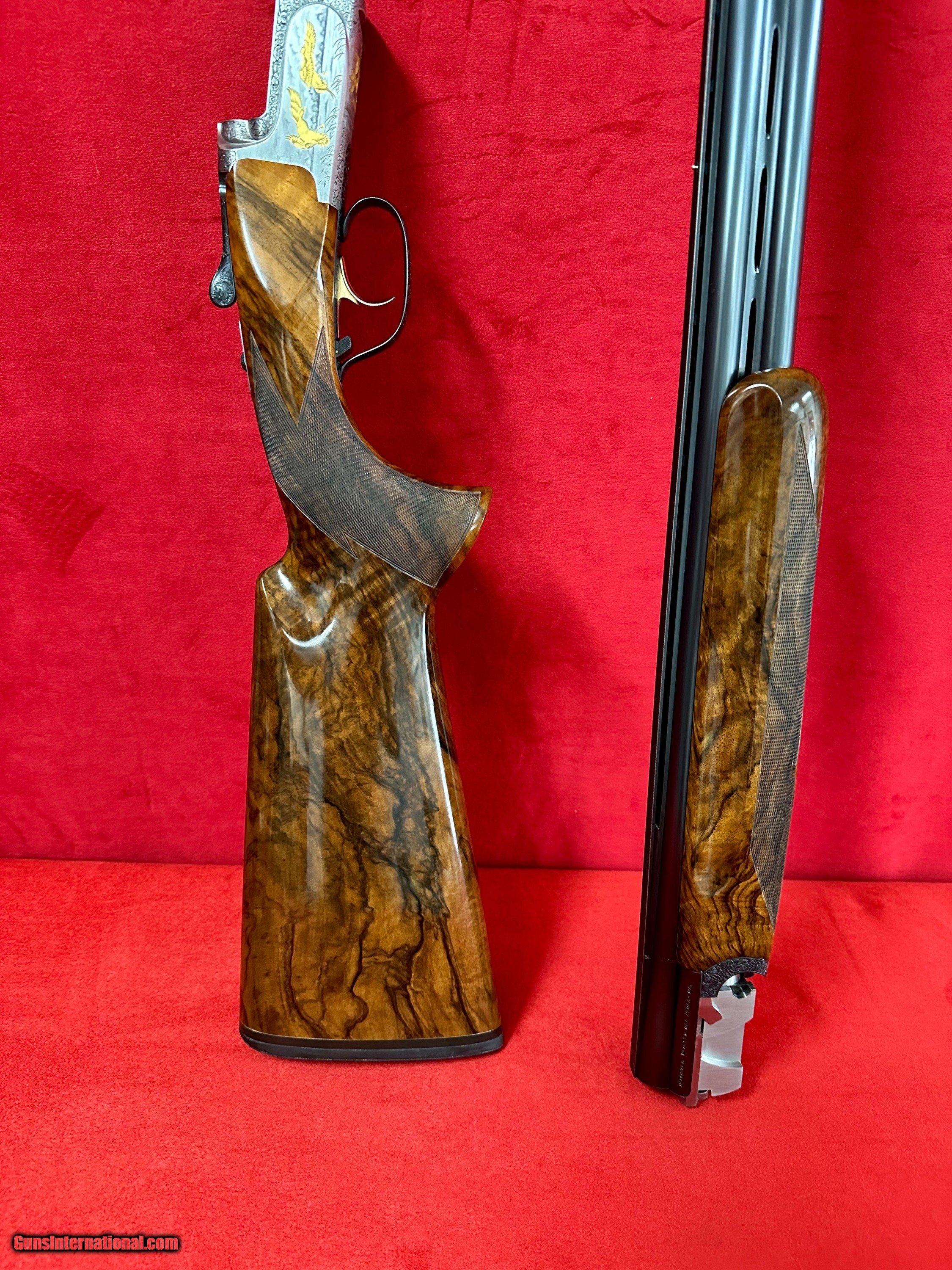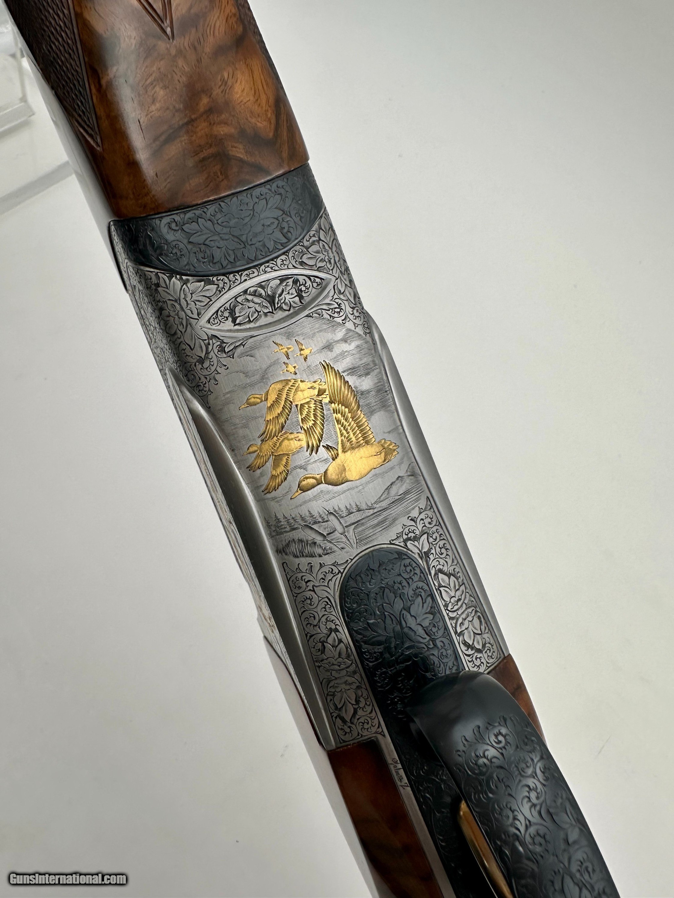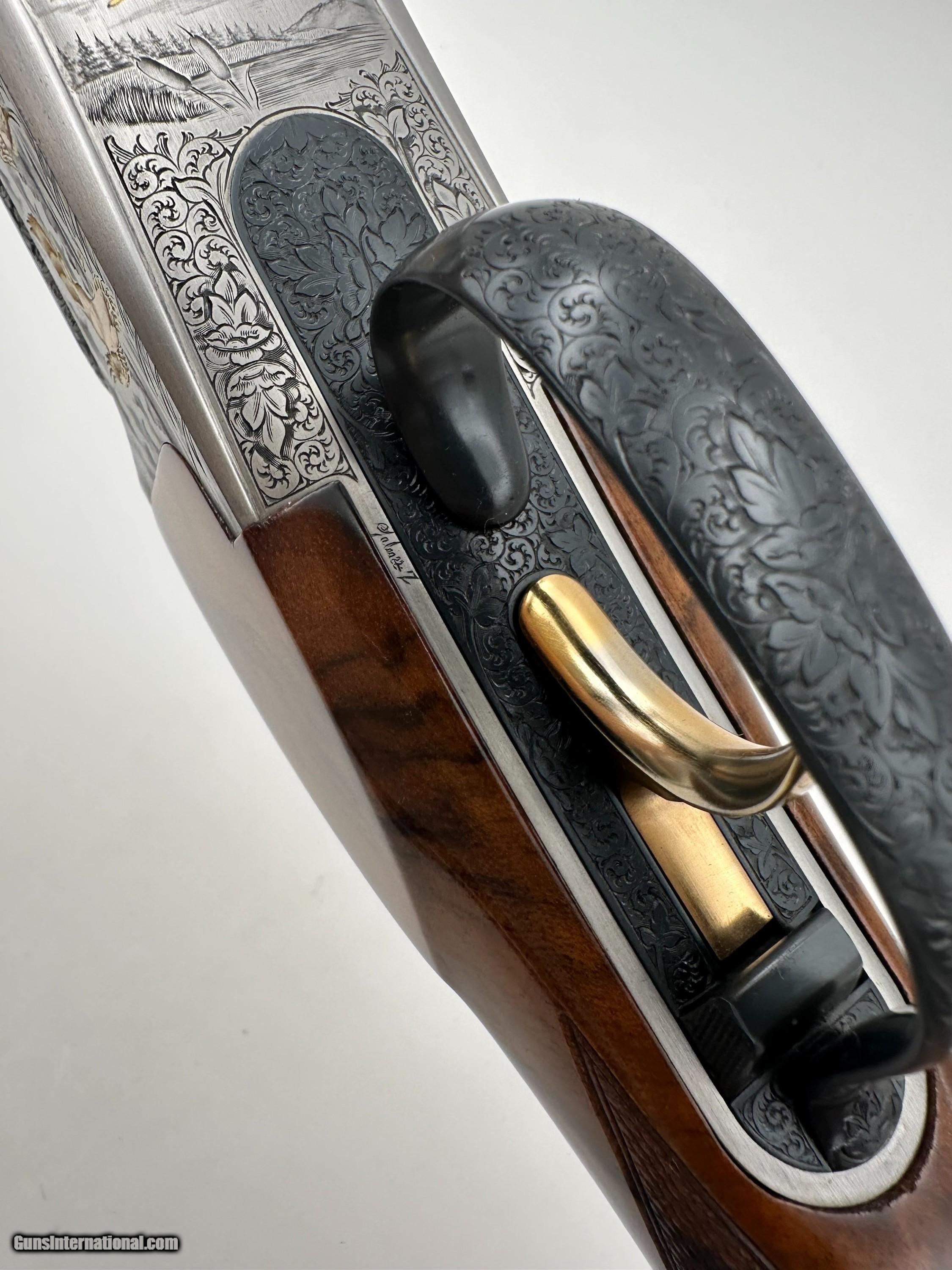 Description: Perazzi SCO gold. MX8-20. 20 gauge receiver with dropout externally selectable trigger. Gun is in pristine MINT condition. All serial numbers matching at #117XXX. Engraved and signed by Galeazzi Fausto. This is one of the top 5 factory engraved guns I have seen from Perazzi, the detail in the gold engraving is stunning. The shading in the Bulino engraving just makes the gold game scenes glow and pop Barrel specs: 32 inch 10x6 tapered rib 15.9 bore Comes with a full set of factory flush choke tubes 0/2/4/6/8 Stock dimensions: 1.375 x 1.92 Length of pull to very thin pad 14.625 Length of pull to end of wood 14.125 3/8 cast off at the toe Small right hand palm swell SOLD |
