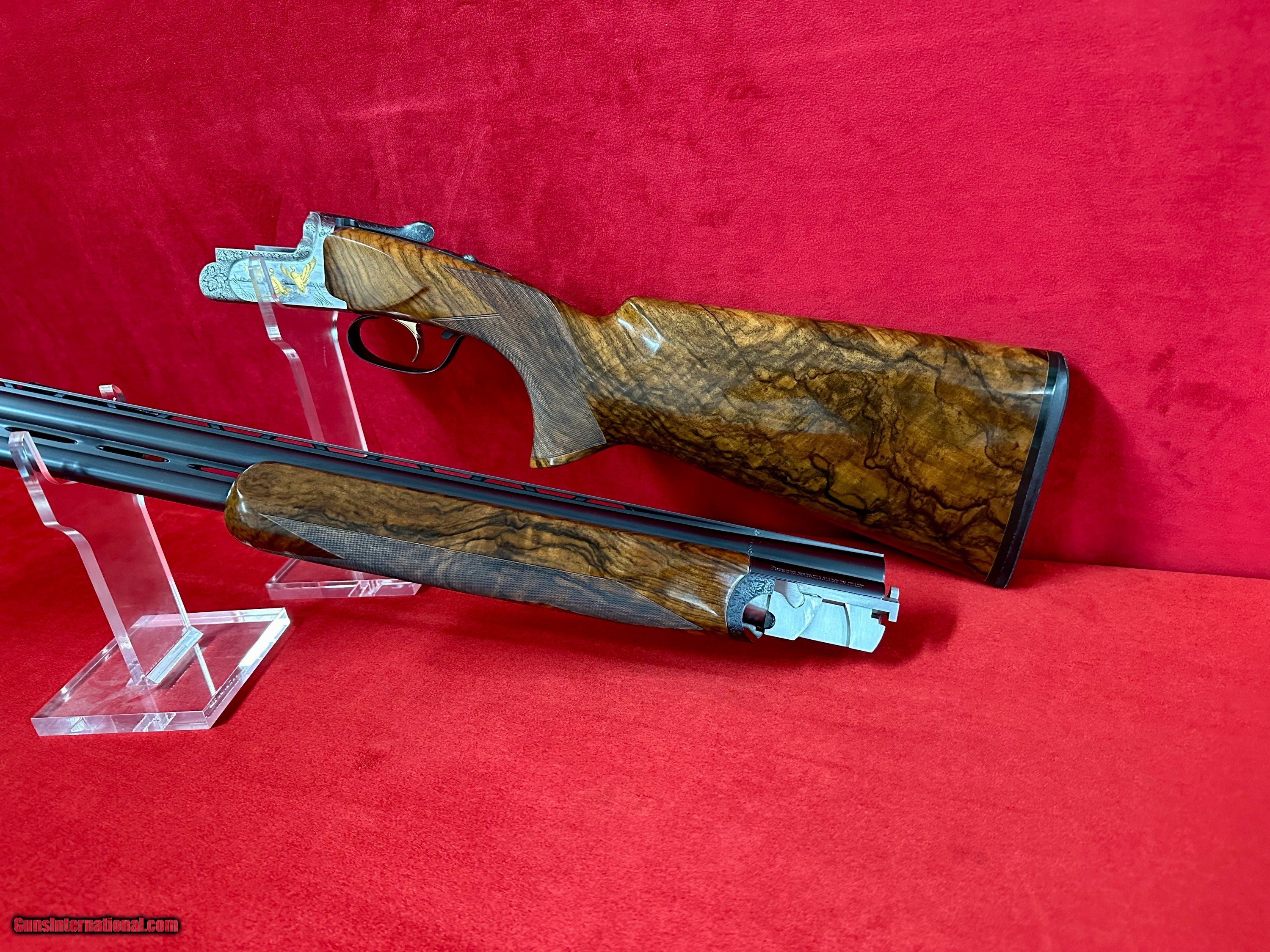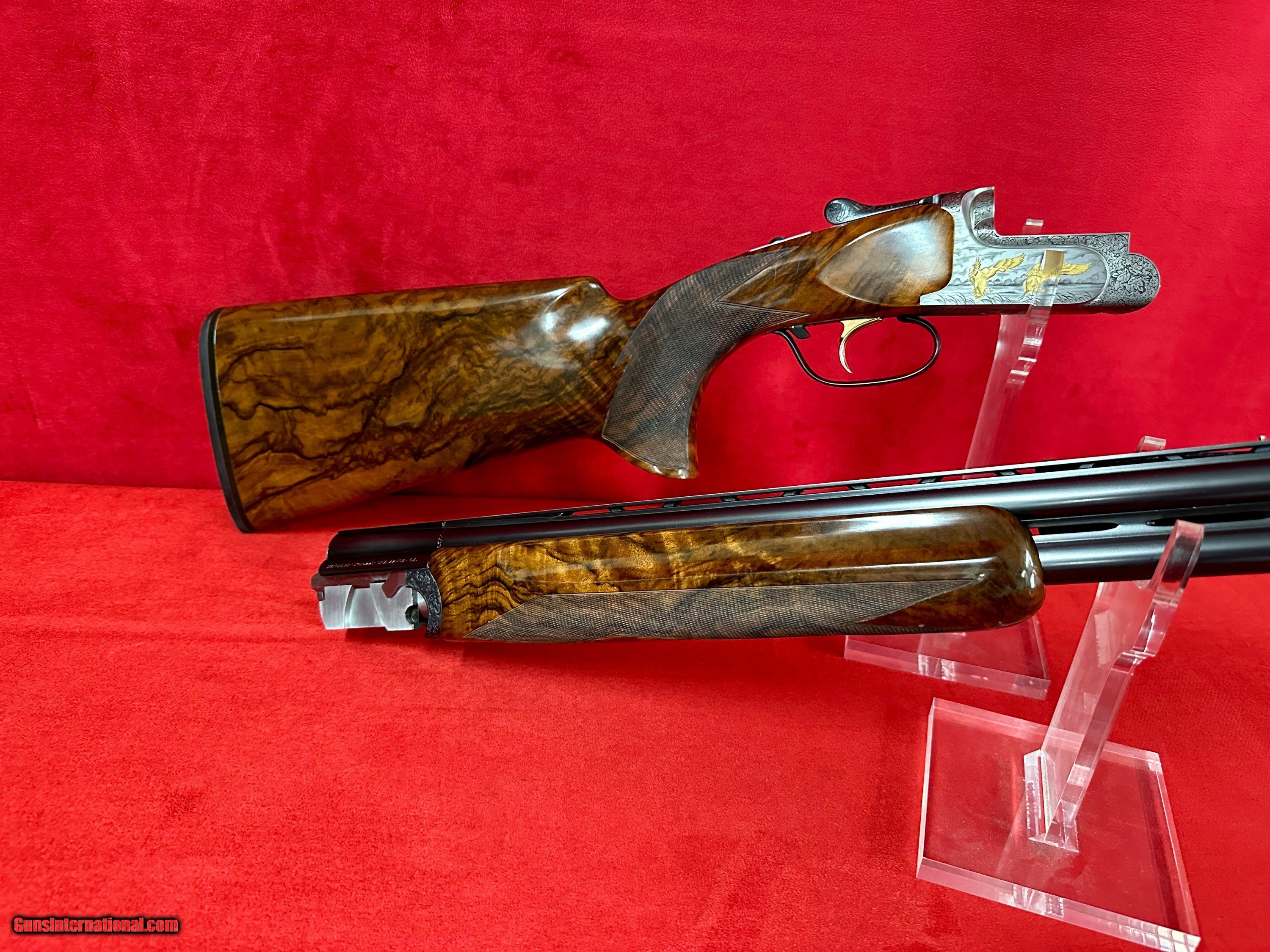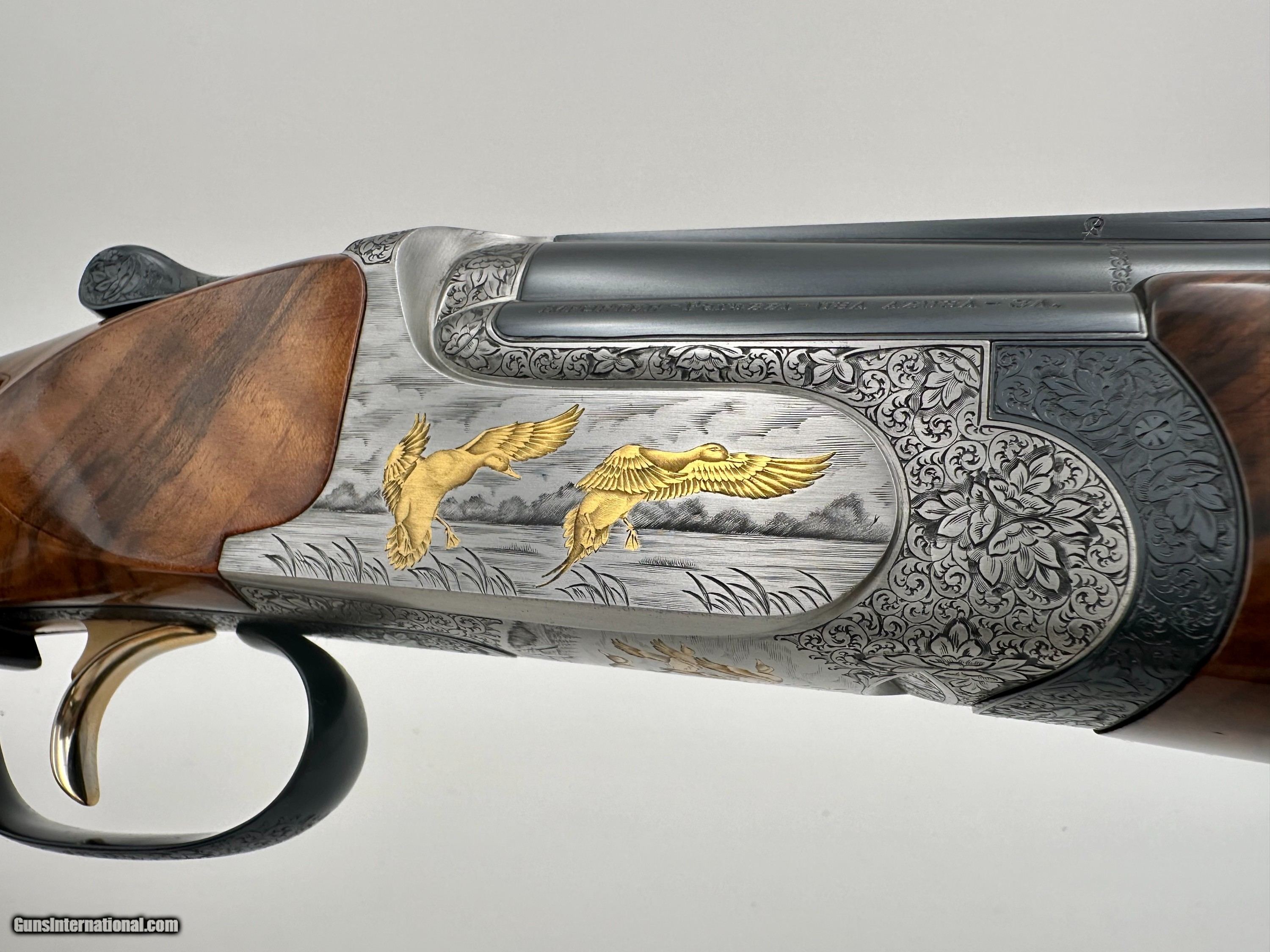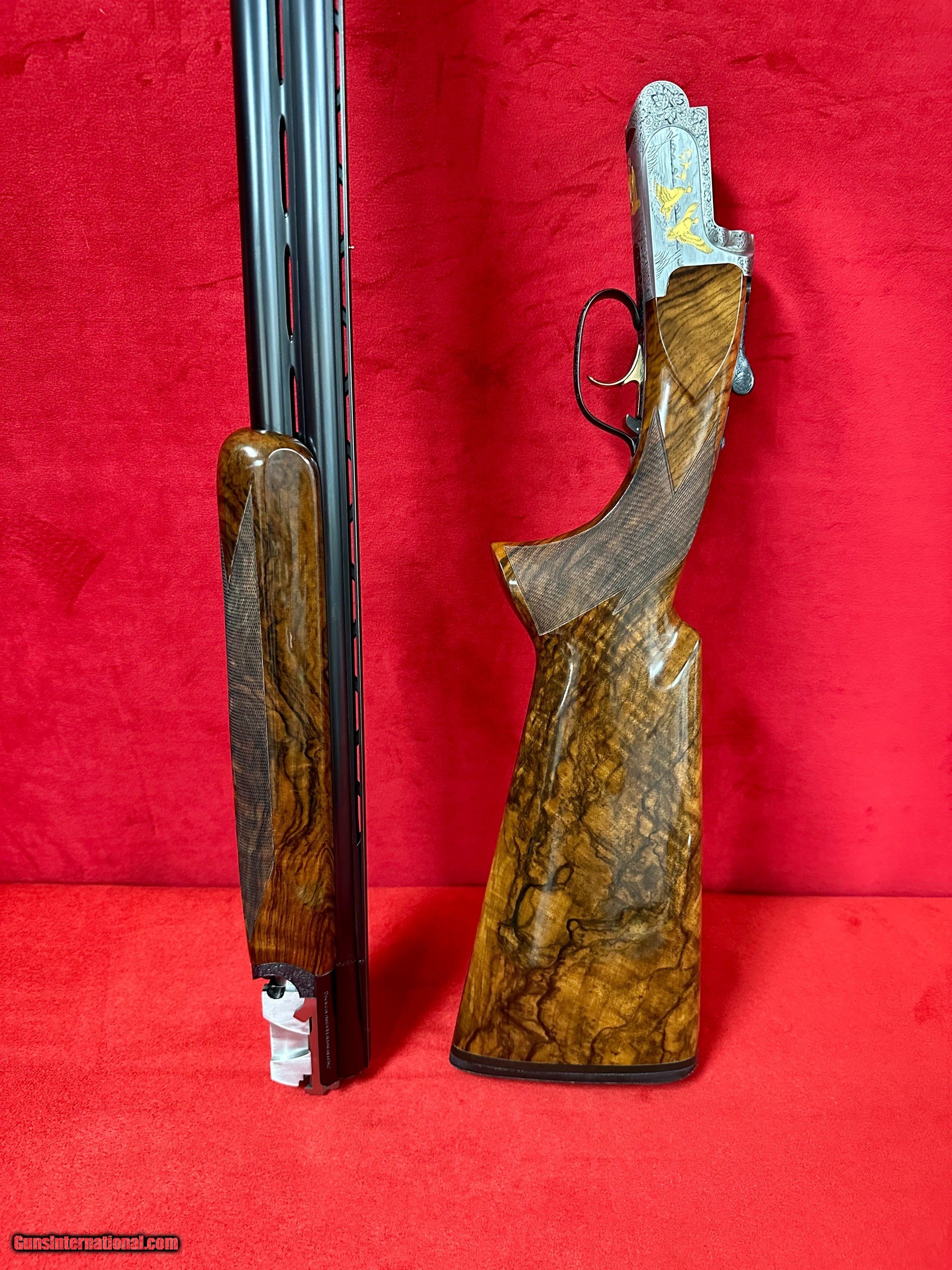 Description: Perazzi SCO gold. MX8-20. 20 gauge receiver with dropout externally selectable trigger. Gun is in pristine MINT condition. All serial numbers matching at #117XXX. Engraved and signed by Galeazzi Fausto. This is one of the top 5 factory engraved guns I have seen from Perazzi, the detail in the gold engraving is stunning. The shading in the Bulino engraving just makes the gold game scenes glow and pop Barrel specs: 32 inch 10x6 tapered rib 15.9 bore Comes with a full set of factory flush choke tubes 0/2/4/6/8 Stock dimensions: 1.375 x 1.92 Length of pull to very thin pad 14.625 Length of pull to end of wood 14.125 3/8 cast off at the toe Small right hand palm swell SOLD |