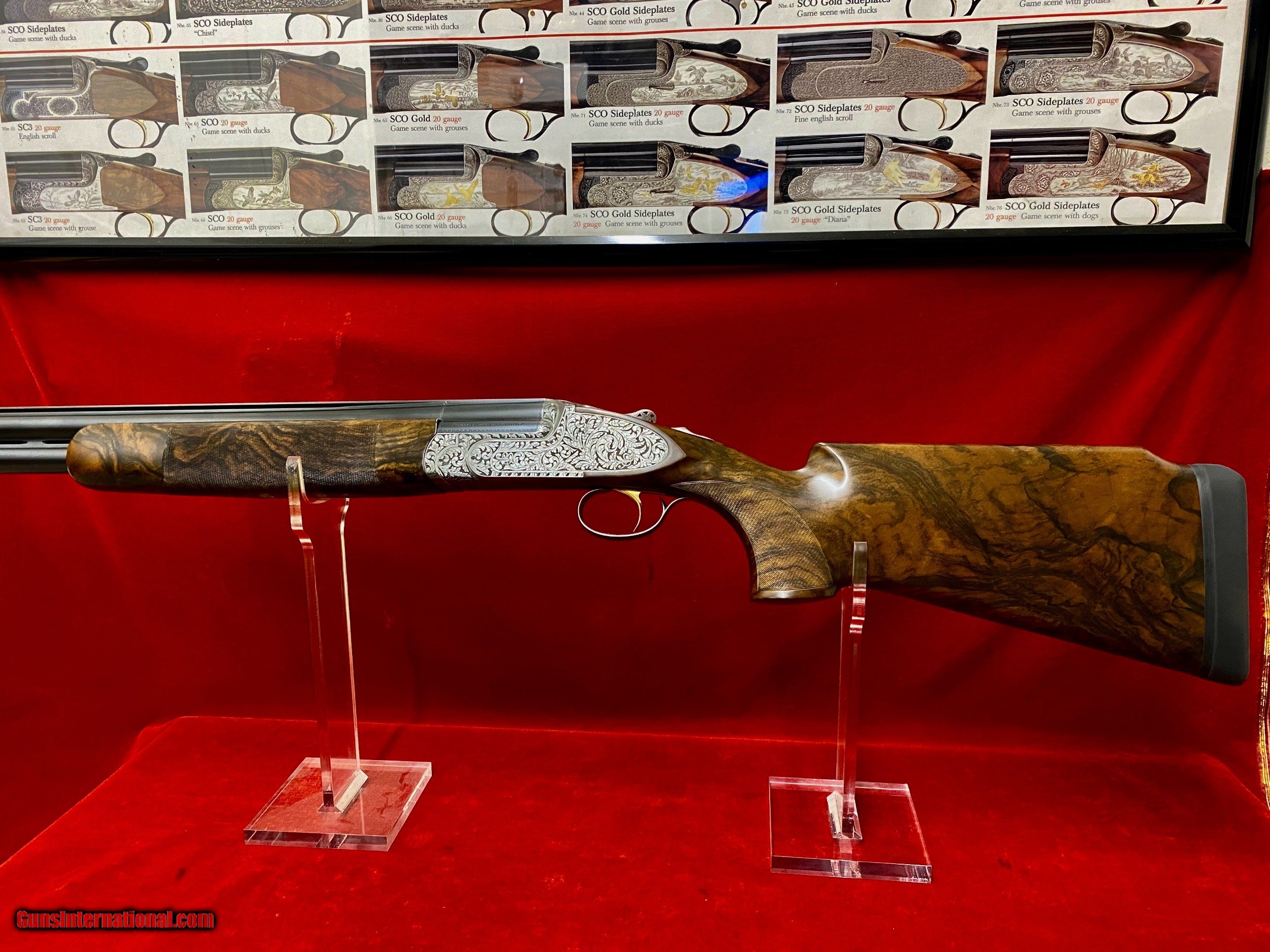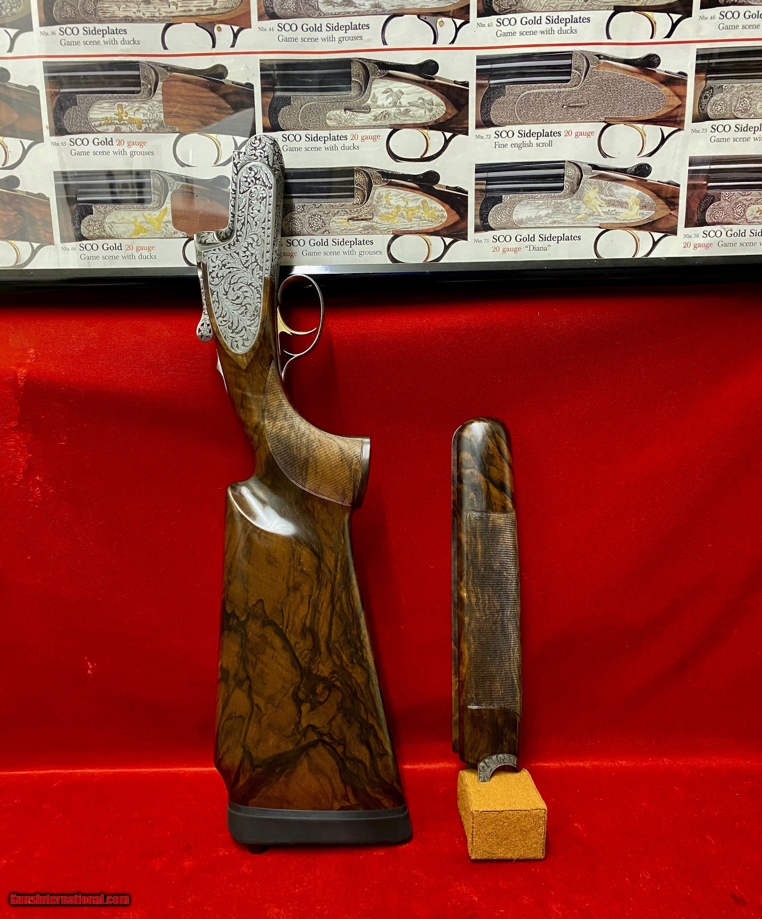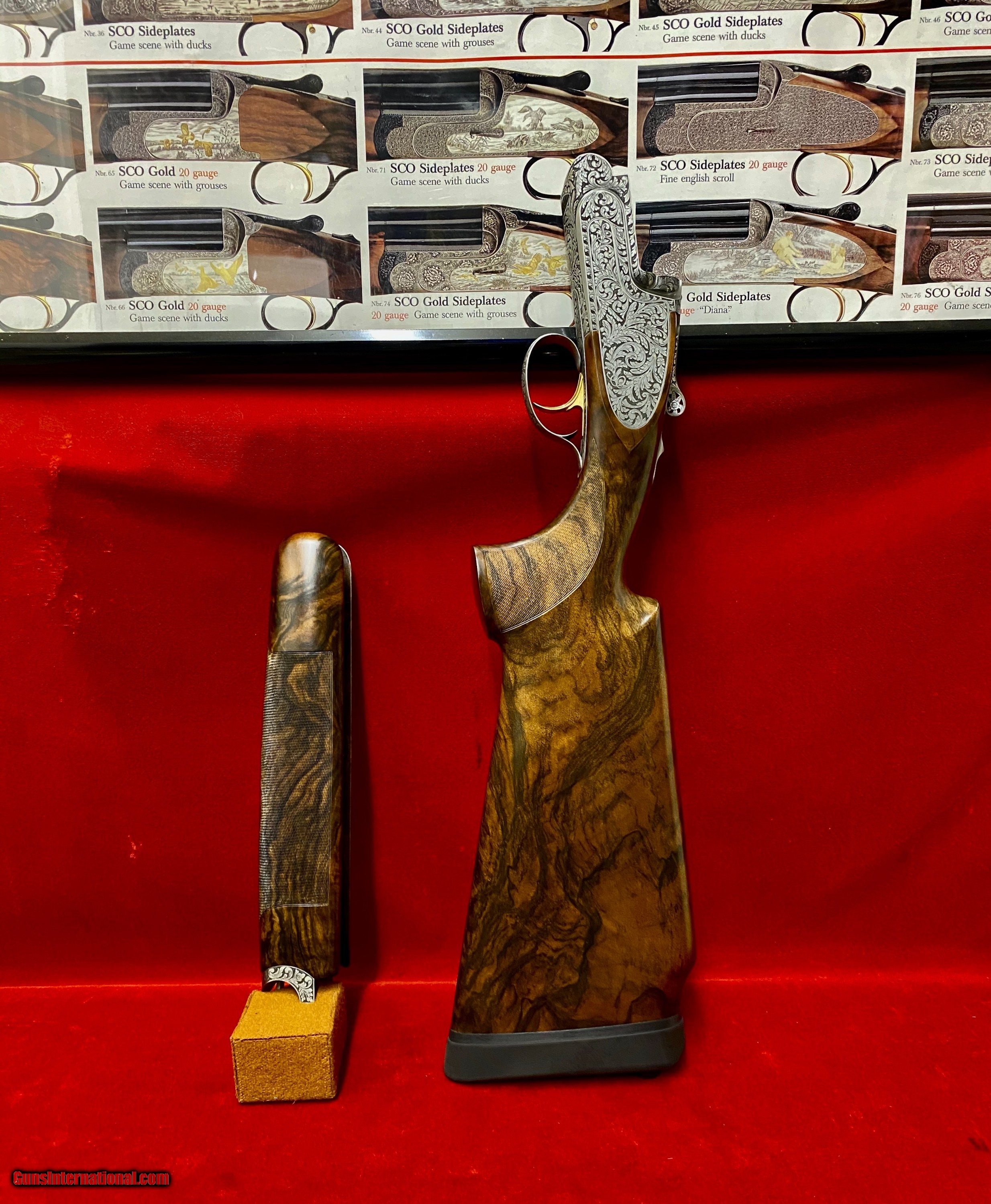 Description: Perazzi SCO sideplate in pristine MINT condition. All serial numbers matching #141XXX. Gun has hardly been shot and remains in original condition Stock dimensions: 1.25 x 1.41 x 1.93 Length of pull 14.75 Right hand palm swell Cast off at the toe 3/8 Barrel specs: 29.5 inch 1.580KG 18.4 bore 11x11 Tramline rib (very rare) Fixed choke .032 bottom and .040 top Comes with original factory leather SCO case, books, tools $34999 SOLD |