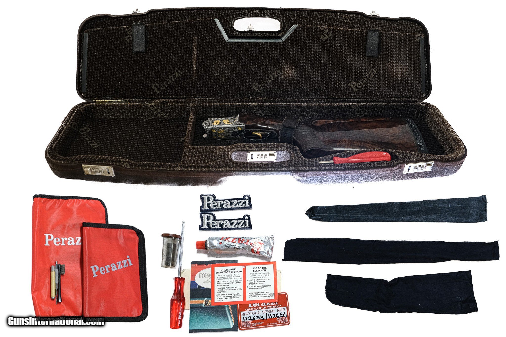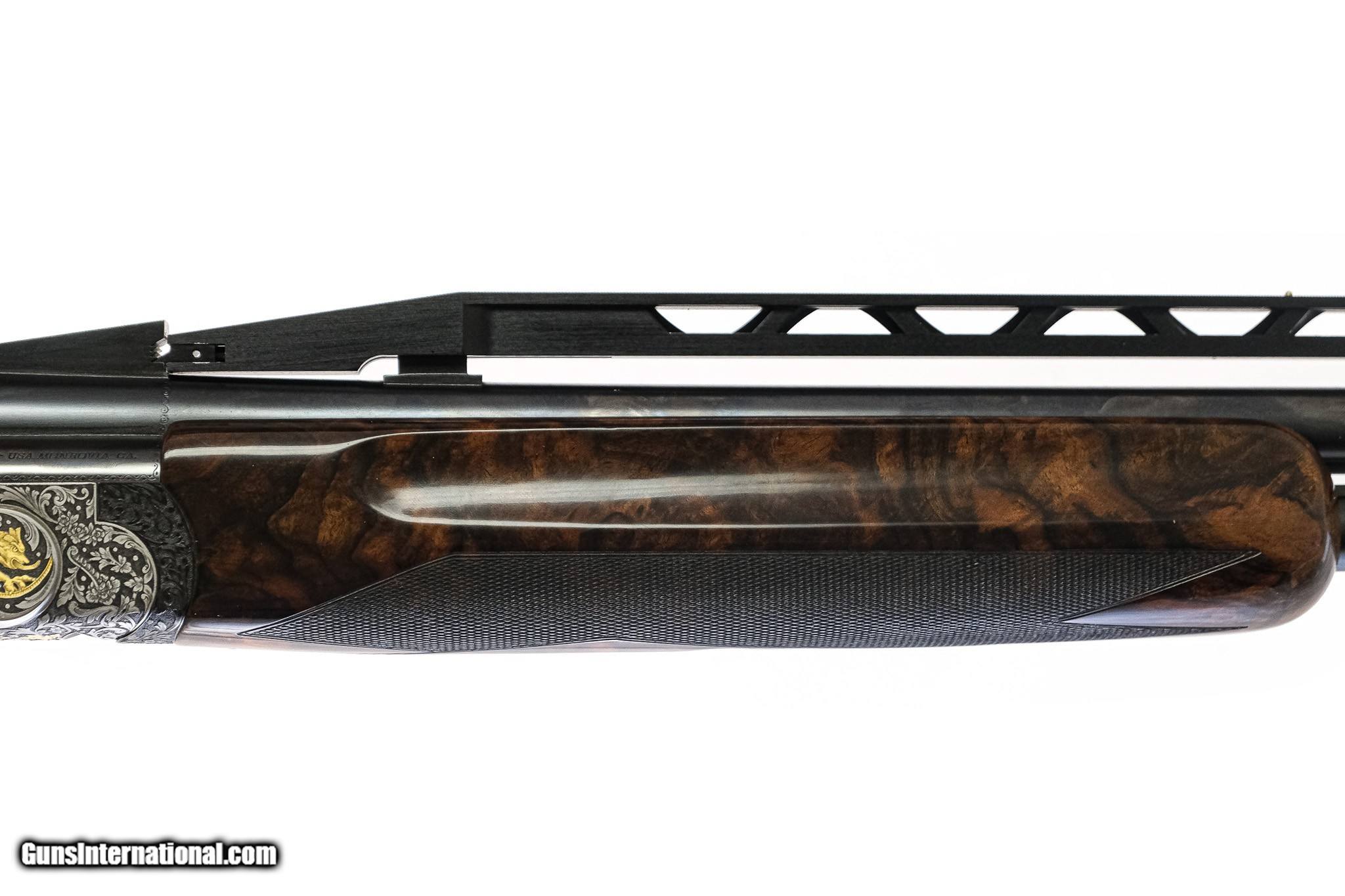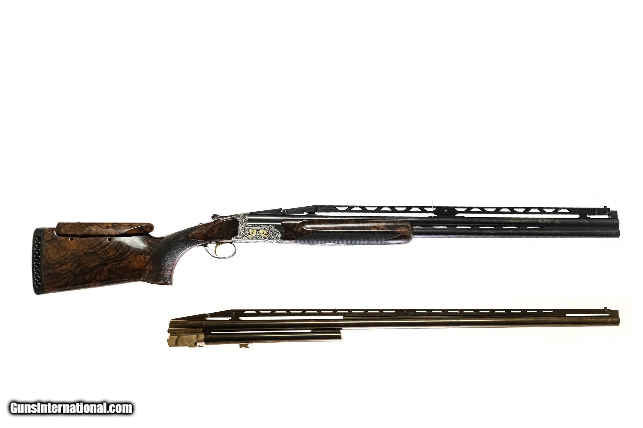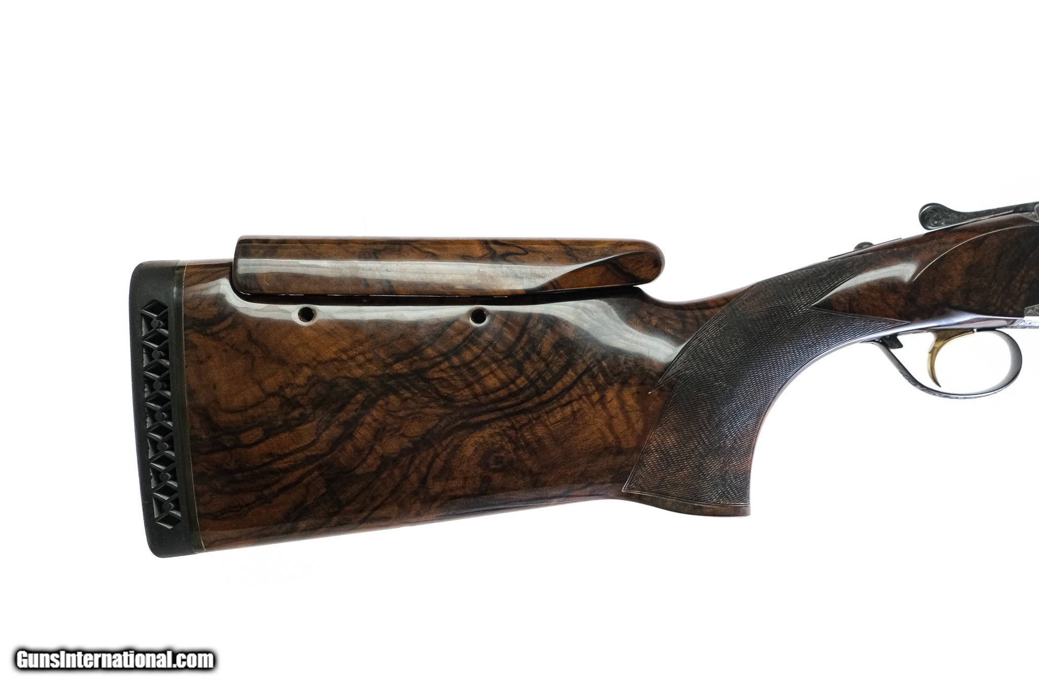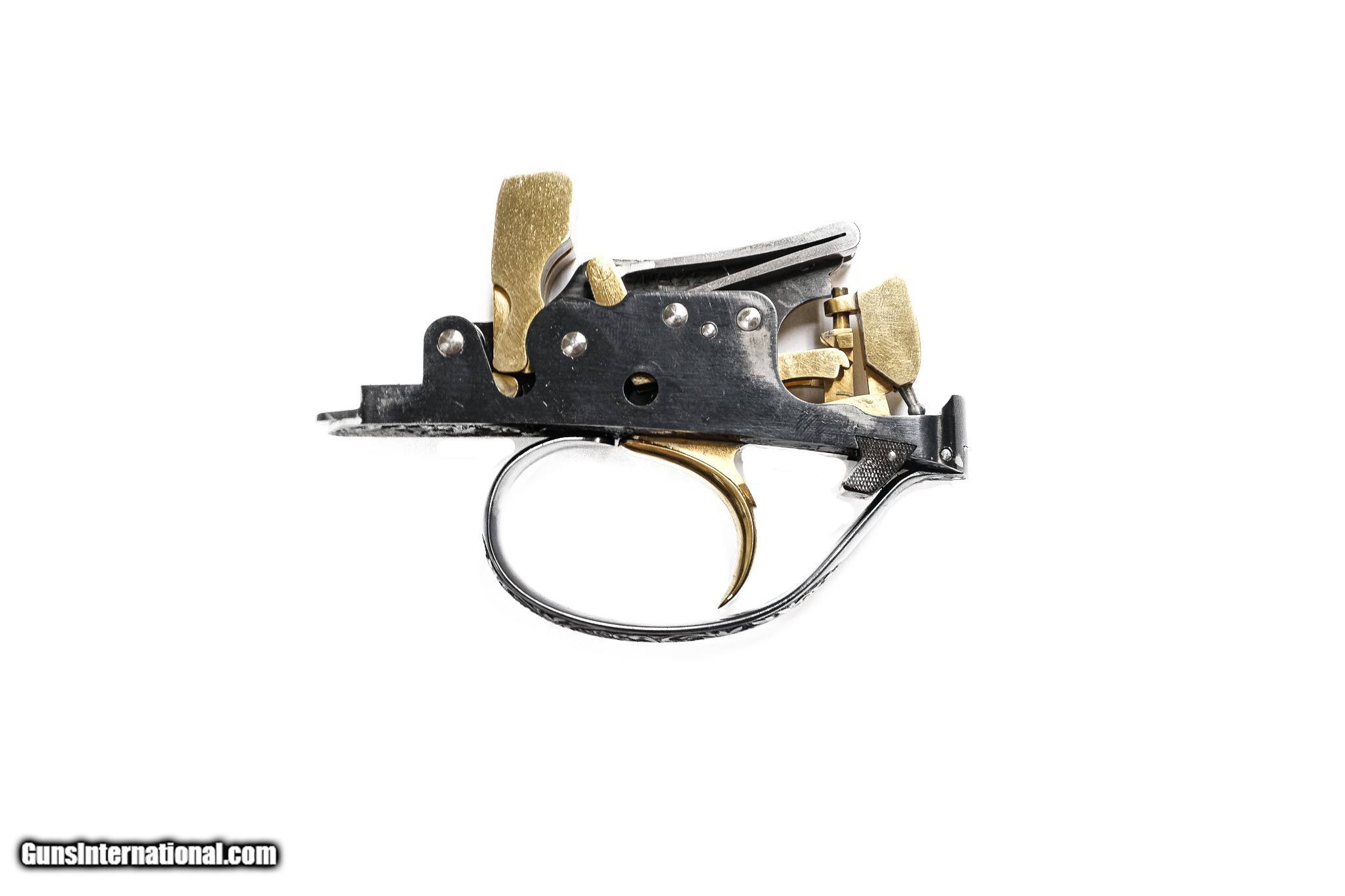 Description: Perazzi - SCO, Special Order, Two Barrel Set, 12ga. 29 ½" Barrels & 34" Top Single Barrel. 29 ½” barrel with adjustable rib, 34” top single with adjustable rib. Drop out gold trigger that has 100% of the gold and no marks on it. Engraved with gold dragon pattern, semi relief scroll, pistol grip, hand selected special order Turkish exhibition grade walnut from the factory. Perazzi pad and comb riser. There is not a mark on this gun, not a mark on the face or a firing pin on the hammer; this gun is just new. In the Perazzi case with accessories, including sleeves and wrench. Virtually new as if the gun was just delivered. This outstanding set is the finest on the market. Has a right-hand palm swell and is essentially a new gun. The single barrel gun is by Tom Wilkinson out of North Carolina for 27-yard trap. This is the ultimate set. Warrantied for life to the original owner courtesy of Connecticut Shotgun. Inv: 83354 8 lbs. 0 oz. $36,500.00 SOLD |