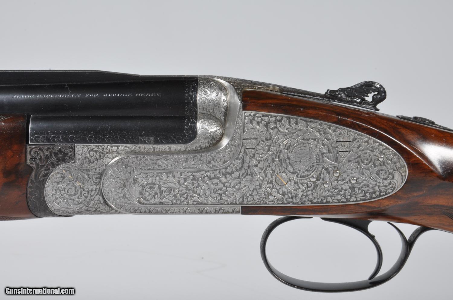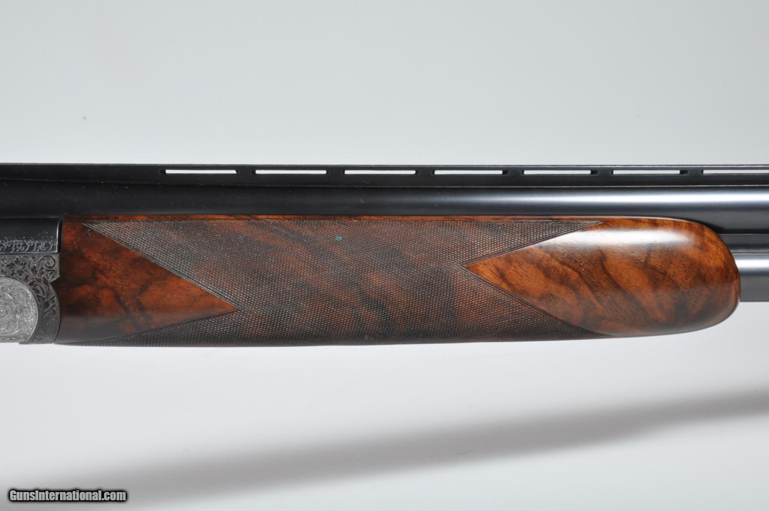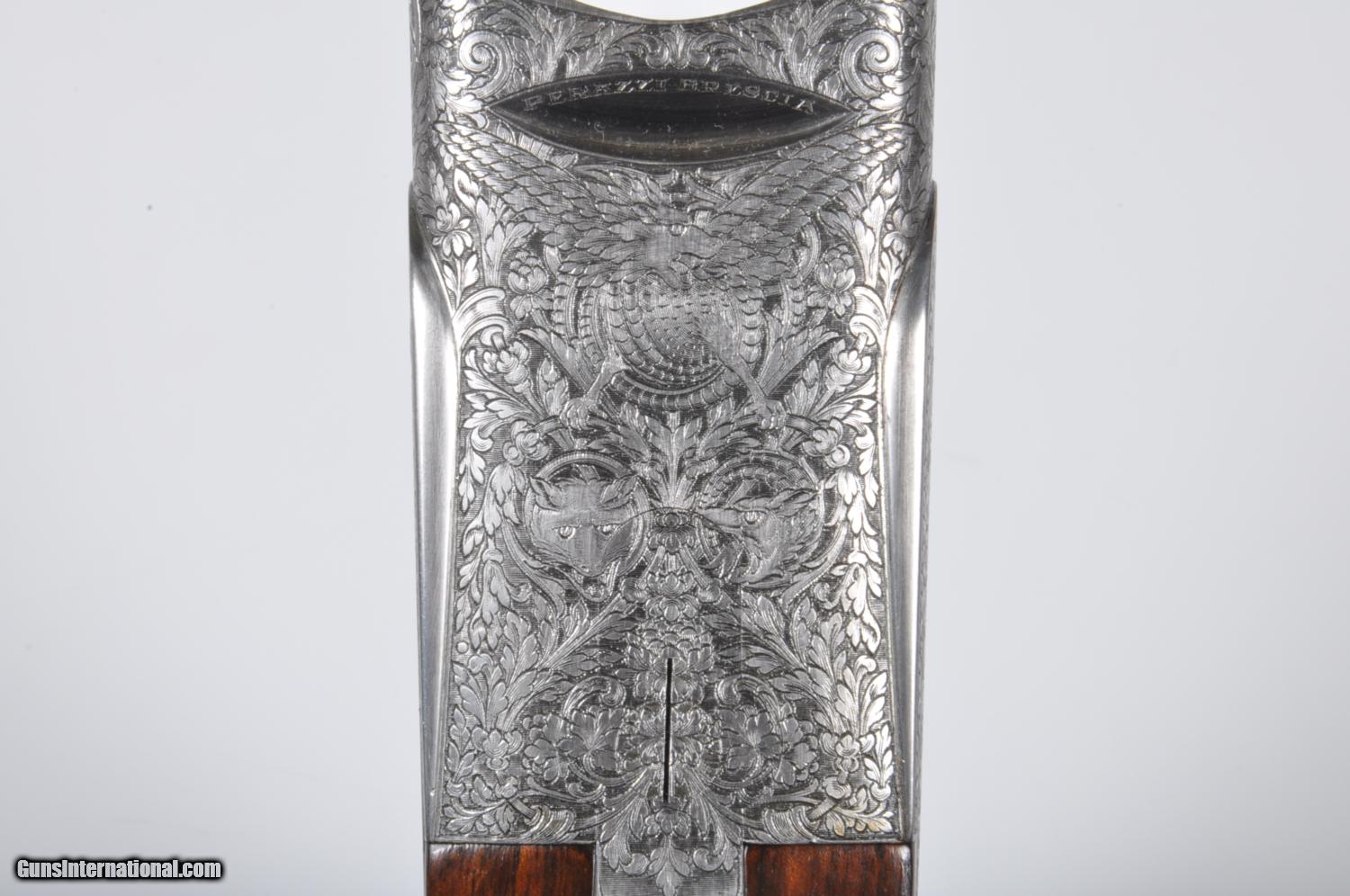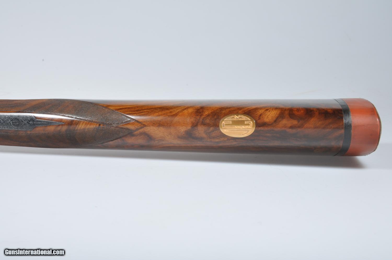 Description: 12 gauge, 2-3/4″ chambers. Three sets of 29″ demi-bloc barrels marked with “I”, “II”, and “II” over a lazy “I” are choked IC and Mod, Mod and full, and Full and full, and are each fitted with concave, matted, ventilated rib. Top rights of barrels are engraved “PERAZZI BRESCIA”, and top lefts with “MADE ESPECIALLY FOR GEORGE NEARY”. Bottoms of mono-blocs are stamped with matching serial numbers, makers initials (MAP), and 1967 Italian nitro proofs. Bottoms of barrels are engraved “ACCIAIO PHONIX DEMIBLOC”. All barrels are served by a single forend. Coin finished, low profile, full sidelock, OU action features non-automatic safety (S inlaid in gold), gold line tumbler end cocking indicators, and single non-selective trigger. Action is engraved with full coverage semi relief, boldly shaded, open scrolling acanthus, highlighted by a mixture of mythological beasts including gargoyles, griffins, and chickens peering through foliage in classic baroque style. Central motifs on sideplates are of bulldogs heads. Bottom of action portrays a face-on griffin, wings outstretched over a fox and some other noxious beast. “PERAZZI BRESCIA” is engraved on forend iron cutout. Blued top lever has matching foliage, and thumb piece is pierced and in the form of a crouching griffin. Foliage and beasts continue onto the trigger guard which has the serial number at grip. This very fine classic engraving is by noted engraver to Perazzi, Abbiatico & Salvinelli, Fabbri et al, Angelo Galeazzi, whose signature is on trigger plate. Fine exhibition quality marbled and stump figured European walnut straight grip buttstock with slight Monte Carlo, measures 14-5/8″ over leather faced Silver type pad. Very closely spaced, perhaps 36 LPI, point pattern checkering with mullered borders is at grip. A gold oval engraved “JCB” is on toe line. Matching semi-beavertail one piece forend has Anson type release with catch in central escutcheon similar in appearance to a Deeley release. Barrel set “I”: Bore diameter: top -.731, bottom -.728. Bore restrictions: top -.007 (IC), bottom -.032 (full). Barrel set “II”: Bore diameter: top -.725, bottom -.724. Bore restrictions: top -.027 (mod), bottom -.038 (full). Barrel set “II” over lazy “I”: Bore diameter: top -.728, bottom -.729. Bore restrictions: top -.028 (Imod), bottom -.045 (extra full). Drop at heel: 2-1/16″, drop at comb: 1-5/16″. Weight: 7 lbs 13 oz. Length of pull: 14-5/8″. Browning vinyl case with space for action and three sets of barrels contains a set of four rosewood handled turnscrews, and a 3-pc rosewood and brass cleaning rod with black leather case containing mop, jag, and brush. Provenance: Internet info on Galeazzi. Condition: Excellent. Barrels retain nearly all of their original blue with slight silvering at muzzles and sharp edges, with a few light marks. Action retains essentially all of its coin finish. Breech faces show very faint firing halos. Stocks retain most of what appears to be their original oil finish, thinning, with some light marks, checkering lightly worn. Action is very slightly loose with barrel set “I” and barrels are very slightly off face. Action is tight as a tick with barrel sets “II” and “II” with lazy “I”. Bores are excellent. Mechanically crisp. Bottom ejector is a little weak. Case is good. Accessories are like new. A fine early collectible Perazzi embellished by one of the all time great Italian “new renaissance” engravers. No California Sales My office hours are 7am-4pm CST Monday through Thursday and 7am-11am Friday. Emails or phone calls received after hours and on the weekend will be answered on the following business day. SOLD Manufacturer: Perazzi Model: Extra Lusso Serial Number: 5284 Gauge Info: 12 |
