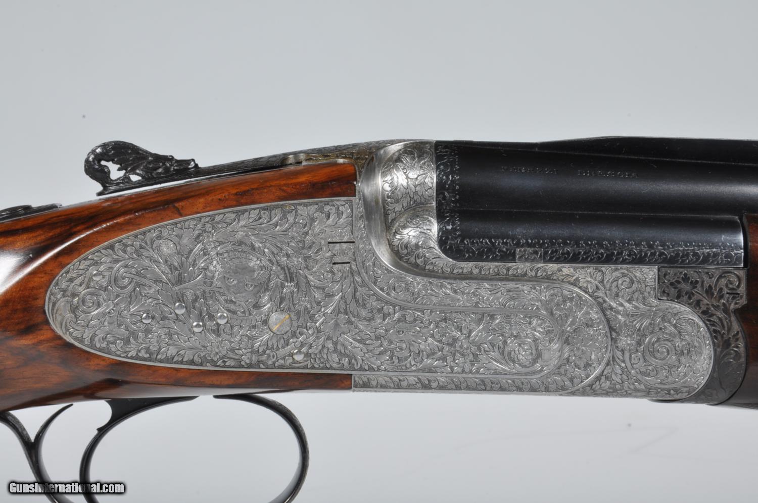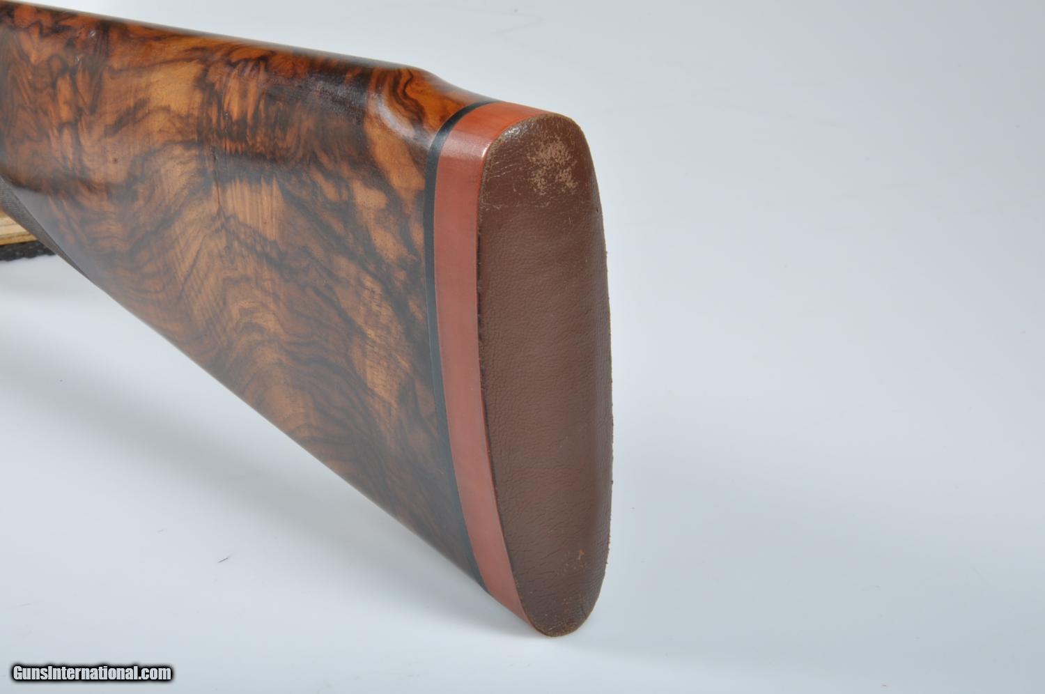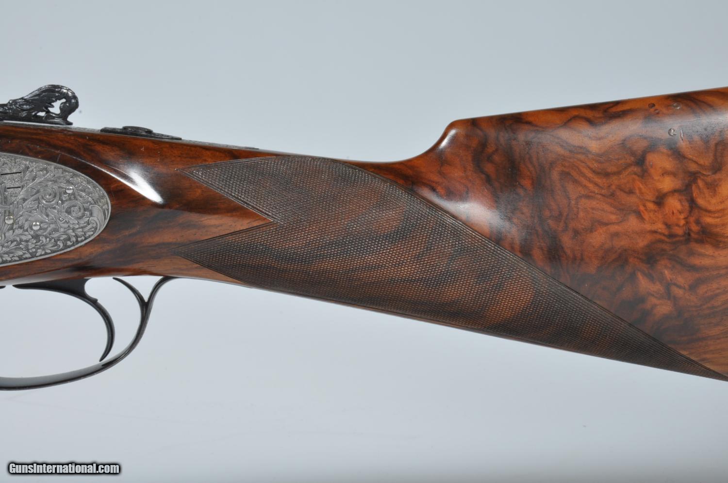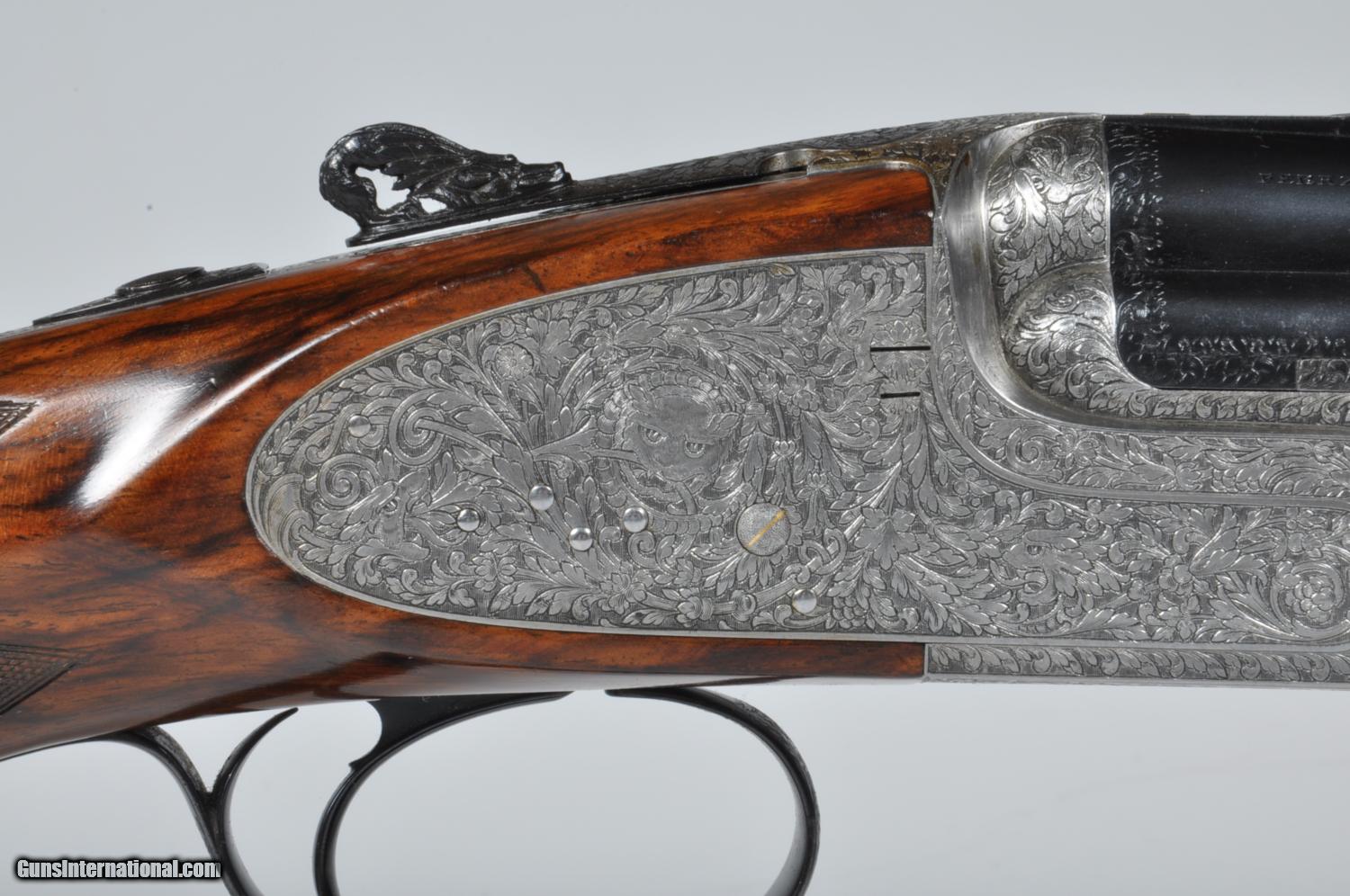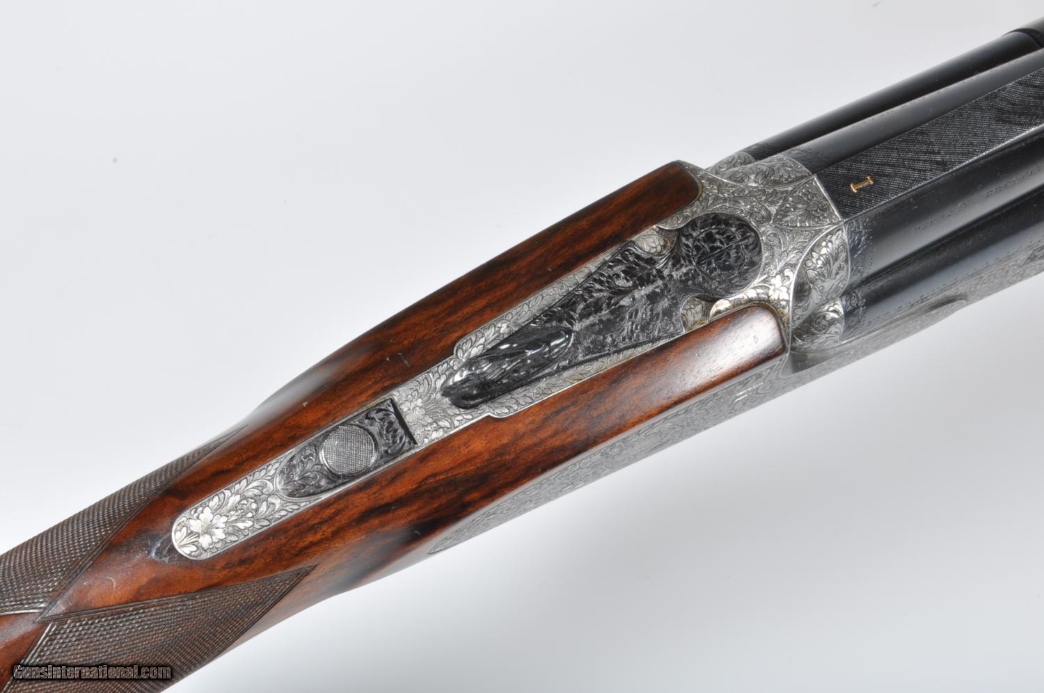 Description: 12 gauge, 2-3/4″ chambers. Three sets of 29″ demi-bloc barrels marked with “I”, “II”, and “II” over a lazy “I” are choked IC and Mod, Mod and full, and Full and full, and are each fitted with concave, matted, ventilated rib. Top rights of barrels are engraved “PERAZZI BRESCIA”, and top lefts with “MADE ESPECIALLY FOR GEORGE NEARY”. Bottoms of mono-blocs are stamped with matching serial numbers, makers initials (MAP), and 1967 Italian nitro proofs. Bottoms of barrels are engraved “ACCIAIO PHONIX DEMIBLOC”. All barrels are served by a single forend. Coin finished, low profile, full sidelock, OU action features non-automatic safety (S inlaid in gold), gold line tumbler end cocking indicators, and single non-selective trigger. Action is engraved with full coverage semi relief, boldly shaded, open scrolling acanthus, highlighted by a mixture of mythological beasts including gargoyles, griffins, and chickens peering through foliage in classic baroque style. Central motifs on sideplates are of bulldogs heads. Bottom of action portrays a face-on griffin, wings outstretched over a fox and some other noxious beast. “PERAZZI BRESCIA” is engraved on forend iron cutout. Blued top lever has matching foliage, and thumb piece is pierced and in the form of a crouching griffin. Foliage and beasts continue onto the trigger guard which has the serial number at grip. This very fine classic engraving is by noted engraver to Perazzi, Abbiatico & Salvinelli, Fabbri et al, Angelo Galeazzi, whose signature is on trigger plate. Fine exhibition quality marbled and stump figured European walnut straight grip buttstock with slight Monte Carlo, measures 14-5/8″ over leather faced Silver type pad. Very closely spaced, perhaps 36 LPI, point pattern checkering with mullered borders is at grip. A gold oval engraved “JCB” is on toe line. Matching semi-beavertail one piece forend has Anson type release with catch in central escutcheon similar in appearance to a Deeley release. Barrel set “I”: Bore diameter: top -.731, bottom -.728. Bore restrictions: top -.007 (IC), bottom -.032 (full). Barrel set “II”: Bore diameter: top -.725, bottom -.724. Bore restrictions: top -.027 (mod), bottom -.038 (full). Barrel set “II” over lazy “I”: Bore diameter: top -.728, bottom -.729. Bore restrictions: top -.028 (Imod), bottom -.045 (extra full). Drop at heel: 2-1/16″, drop at comb: 1-5/16″. Weight: 7 lbs 13 oz. Length of pull: 14-5/8″. Browning vinyl case with space for action and three sets of barrels contains a set of four rosewood handled turnscrews, and a 3-pc rosewood and brass cleaning rod with black leather case containing mop, jag, and brush. Provenance: Internet info on Galeazzi. Condition: Excellent. Barrels retain nearly all of their original blue with slight silvering at muzzles and sharp edges, with a few light marks. Action retains essentially all of its coin finish. Breech faces show very faint firing halos. Stocks retain most of what appears to be their original oil finish, thinning, with some light marks, checkering lightly worn. Action is very slightly loose with barrel set “I” and barrels are very slightly off face. Action is tight as a tick with barrel sets “II” and “II” with lazy “I”. Bores are excellent. Mechanically crisp. Bottom ejector is a little weak. Case is good. Accessories are like new. A fine early collectible Perazzi embellished by one of the all time great Italian “new renaissance” engravers. No California Sales My office hours are 7am-4pm CST Monday through Thursday and 7am-11am Friday. Emails or phone calls received after hours and on the weekend will be answered on the following business day. SOLD Manufacturer: Perazzi Model: Extra Lusso Serial Number: 5284 Gauge Info: 12 |