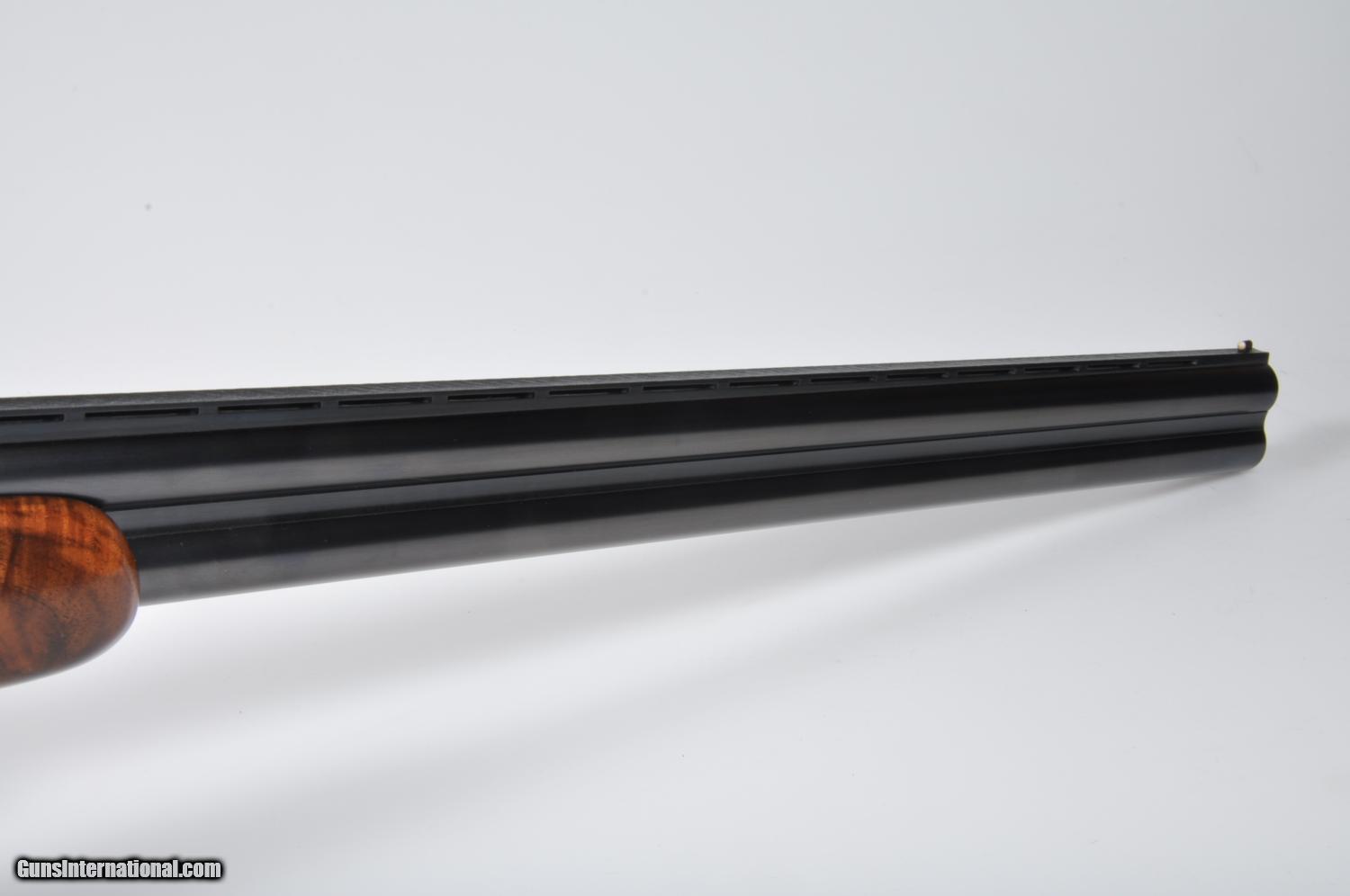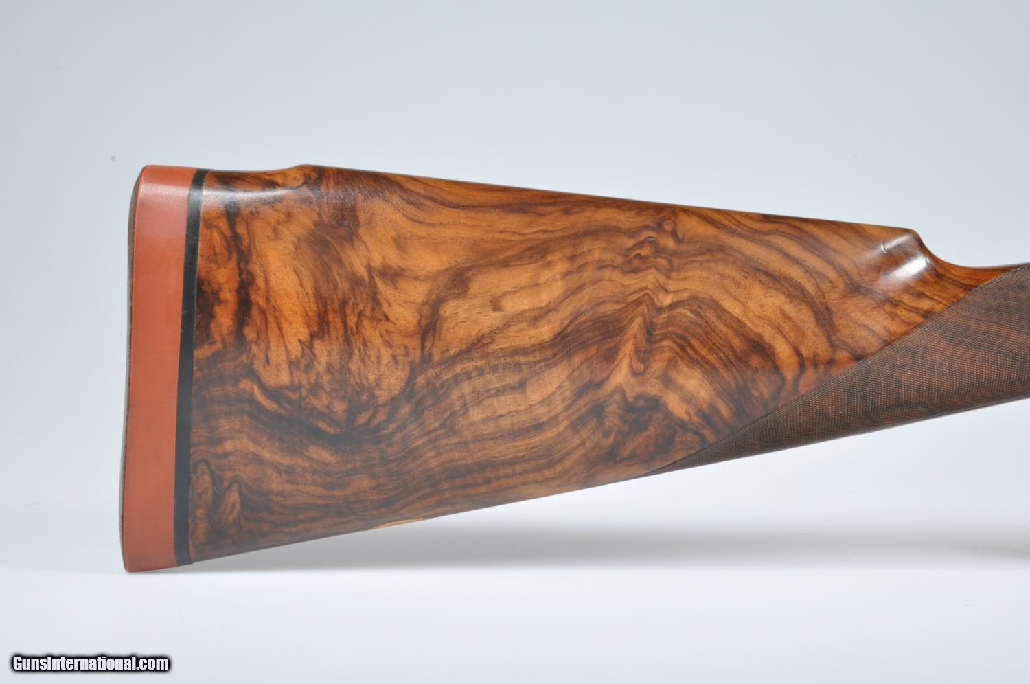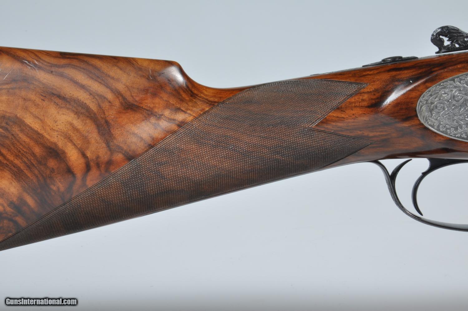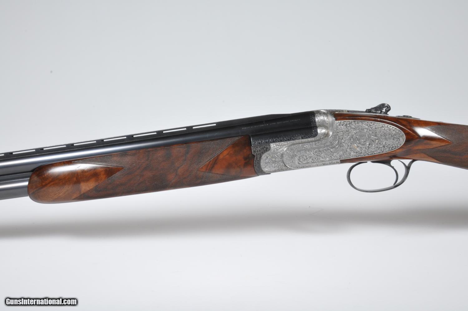 Description: 12 gauge, 2-3/4″ chambers. Three sets of 29″ demi-bloc barrels marked with “I”, “II”, and “II” over a lazy “I” are choked IC and Mod, Mod and full, and Full and full, and are each fitted with concave, matted, ventilated rib. Top rights of barrels are engraved “PERAZZI BRESCIA”, and top lefts with “MADE ESPECIALLY FOR GEORGE NEARY”. Bottoms of mono-blocs are stamped with matching serial numbers, makers initials (MAP), and 1967 Italian nitro proofs. Bottoms of barrels are engraved “ACCIAIO PHONIX DEMIBLOC”. All barrels are served by a single forend. Coin finished, low profile, full sidelock, OU action features non-automatic safety (S inlaid in gold), gold line tumbler end cocking indicators, and single non-selective trigger. Action is engraved with full coverage semi relief, boldly shaded, open scrolling acanthus, highlighted by a mixture of mythological beasts including gargoyles, griffins, and chickens peering through foliage in classic baroque style. Central motifs on sideplates are of bulldogs heads. Bottom of action portrays a face-on griffin, wings outstretched over a fox and some other noxious beast. “PERAZZI BRESCIA” is engraved on forend iron cutout. Blued top lever has matching foliage, and thumb piece is pierced and in the form of a crouching griffin. Foliage and beasts continue onto the trigger guard which has the serial number at grip. This very fine classic engraving is by noted engraver to Perazzi, Abbiatico & Salvinelli, Fabbri et al, Angelo Galeazzi, whose signature is on trigger plate. Fine exhibition quality marbled and stump figured European walnut straight grip buttstock with slight Monte Carlo, measures 14-5/8″ over leather faced Silver type pad. Very closely spaced, perhaps 36 LPI, point pattern checkering with mullered borders is at grip. A gold oval engraved “JCB” is on toe line. Matching semi-beavertail one piece forend has Anson type release with catch in central escutcheon similar in appearance to a Deeley release. Barrel set “I”: Bore diameter: top -.731, bottom -.728. Bore restrictions: top -.007 (IC), bottom -.032 (full). Barrel set “II”: Bore diameter: top -.725, bottom -.724. Bore restrictions: top -.027 (mod), bottom -.038 (full). Barrel set “II” over lazy “I”: Bore diameter: top -.728, bottom -.729. Bore restrictions: top -.028 (Imod), bottom -.045 (extra full). Drop at heel: 2-1/16″, drop at comb: 1-5/16″. Weight: 7 lbs 13 oz. Length of pull: 14-5/8″. Browning vinyl case with space for action and three sets of barrels contains a set of four rosewood handled turnscrews, and a 3-pc rosewood and brass cleaning rod with black leather case containing mop, jag, and brush. Provenance: Internet info on Galeazzi. Condition: Excellent. Barrels retain nearly all of their original blue with slight silvering at muzzles and sharp edges, with a few light marks. Action retains essentially all of its coin finish. Breech faces show very faint firing halos. Stocks retain most of what appears to be their original oil finish, thinning, with some light marks, checkering lightly worn. Action is very slightly loose with barrel set “I” and barrels are very slightly off face. Action is tight as a tick with barrel sets “II” and “II” with lazy “I”. Bores are excellent. Mechanically crisp. Bottom ejector is a little weak. Case is good. Accessories are like new. A fine early collectible Perazzi embellished by one of the all time great Italian “new renaissance” engravers. No California Sales My office hours are 7am-4pm CST Monday through Thursday and 7am-11am Friday. Emails or phone calls received after hours and on the weekend will be answered on the following business day. SOLD Manufacturer: Perazzi Model: Extra Lusso Serial Number: 5284 Gauge Info: 12 |
