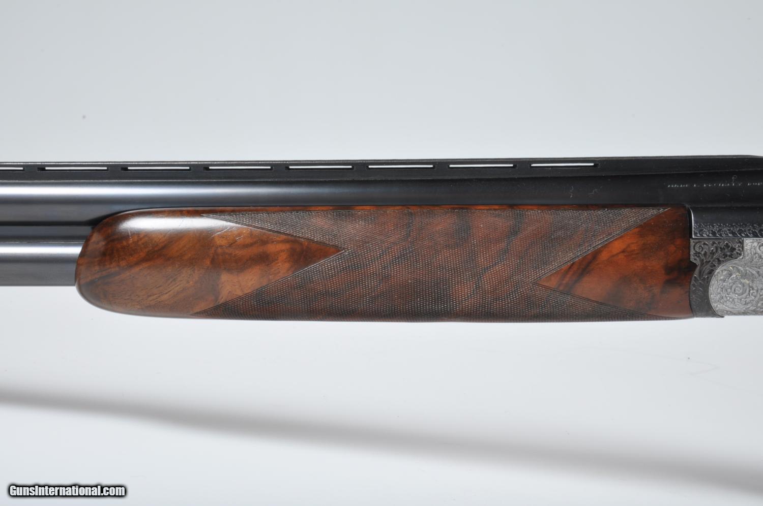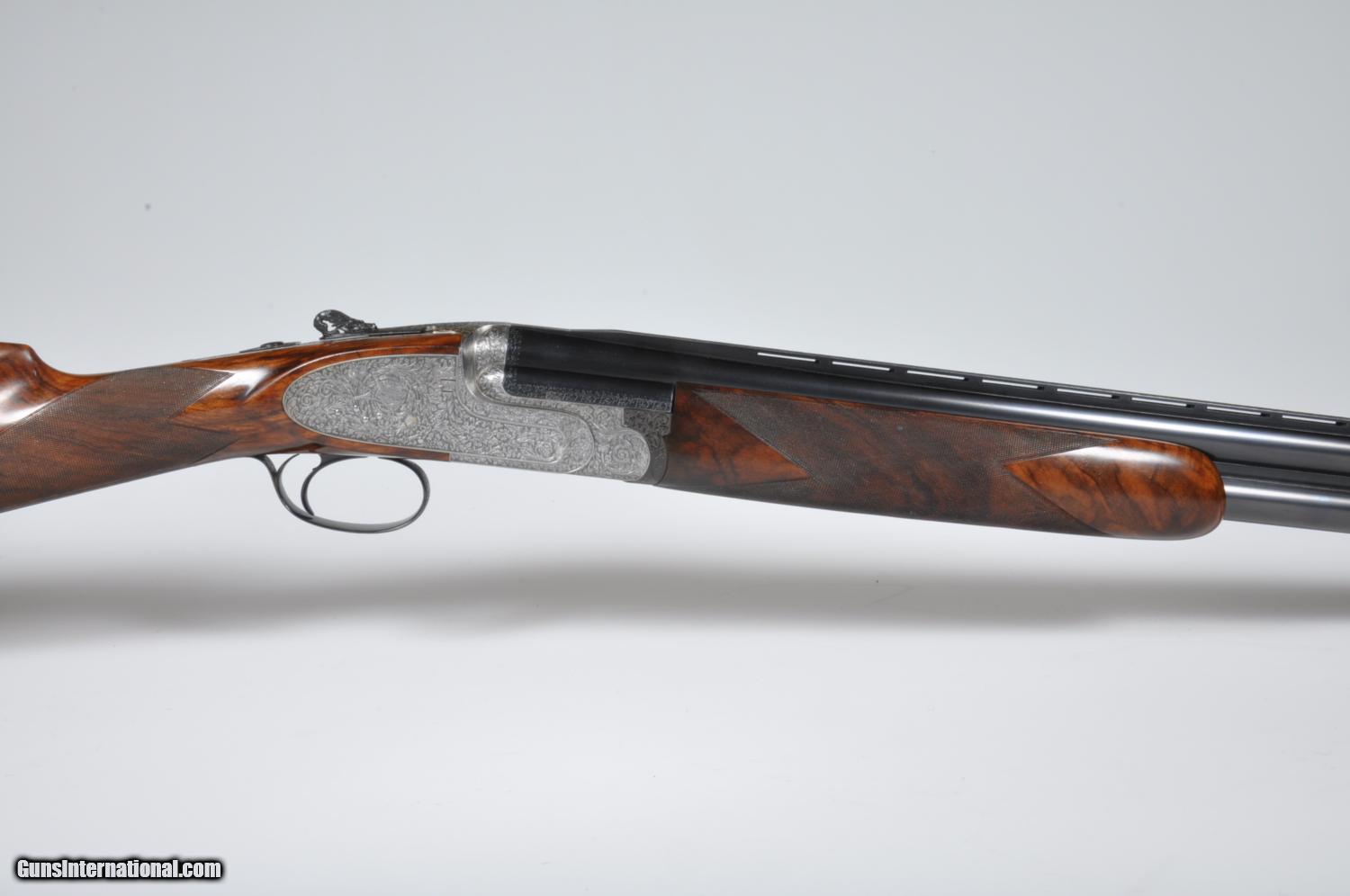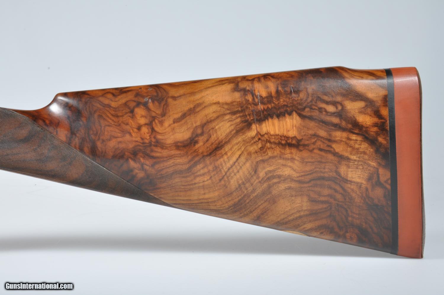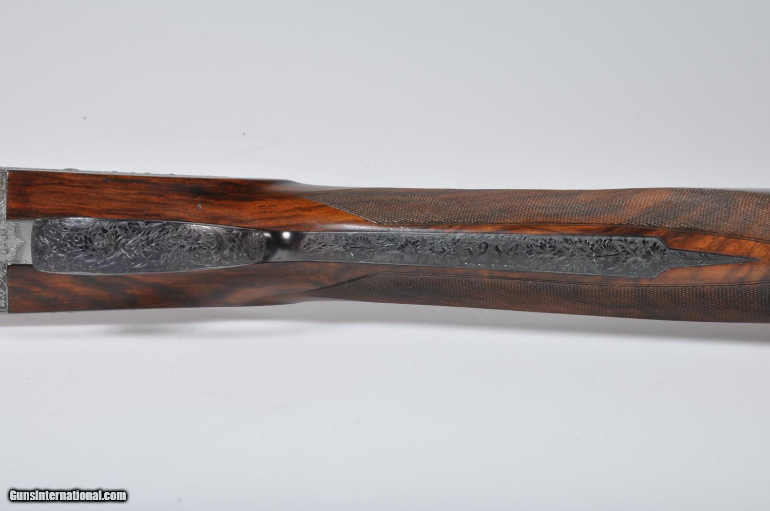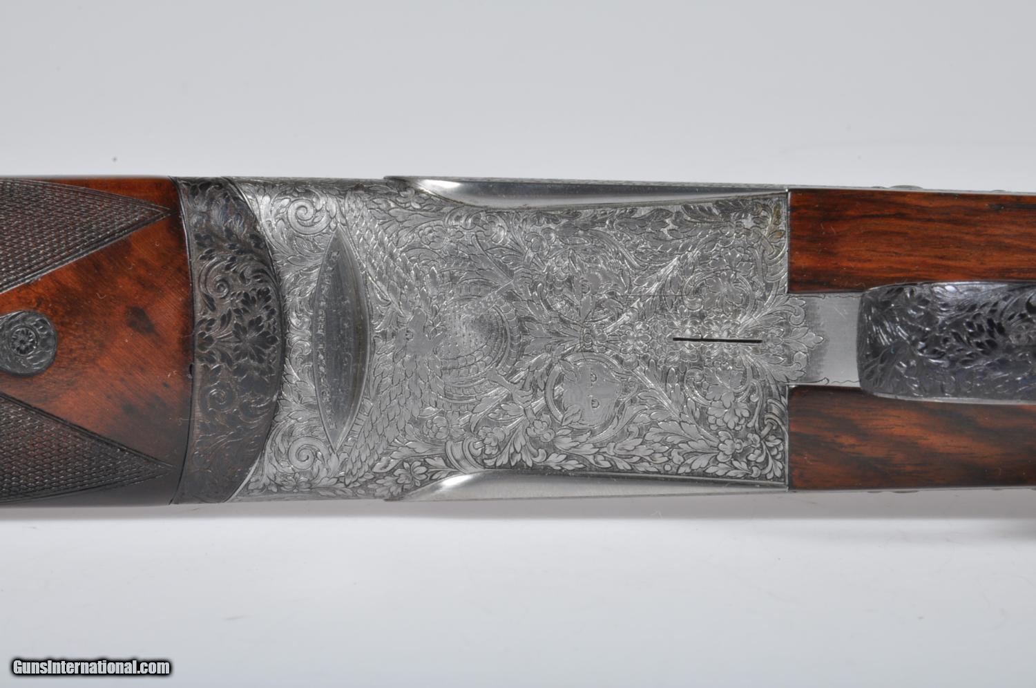 Description: 12 gauge, 2-3/4″ chambers. Three sets of 29″ demi-bloc barrels marked with “I”, “II”, and “II” over a lazy “I” are choked IC and Mod, Mod and full, and Full and full, and are each fitted with concave, matted, ventilated rib. Top rights of barrels are engraved “PERAZZI BRESCIA”, and top lefts with “MADE ESPECIALLY FOR GEORGE NEARY”. Bottoms of mono-blocs are stamped with matching serial numbers, makers initials (MAP), and 1967 Italian nitro proofs. Bottoms of barrels are engraved “ACCIAIO PHONIX DEMIBLOC”. All barrels are served by a single forend. Coin finished, low profile, full sidelock, OU action features non-automatic safety (S inlaid in gold), gold line tumbler end cocking indicators, and single non-selective trigger. Action is engraved with full coverage semi relief, boldly shaded, open scrolling acanthus, highlighted by a mixture of mythological beasts including gargoyles, griffins, and chickens peering through foliage in classic baroque style. Central motifs on sideplates are of bulldogs heads. Bottom of action portrays a face-on griffin, wings outstretched over a fox and some other noxious beast. “PERAZZI BRESCIA” is engraved on forend iron cutout. Blued top lever has matching foliage, and thumb piece is pierced and in the form of a crouching griffin. Foliage and beasts continue onto the trigger guard which has the serial number at grip. This very fine classic engraving is by noted engraver to Perazzi, Abbiatico & Salvinelli, Fabbri et al, Angelo Galeazzi, whose signature is on trigger plate. Fine exhibition quality marbled and stump figured European walnut straight grip buttstock with slight Monte Carlo, measures 14-5/8″ over leather faced Silver type pad. Very closely spaced, perhaps 36 LPI, point pattern checkering with mullered borders is at grip. A gold oval engraved “JCB” is on toe line. Matching semi-beavertail one piece forend has Anson type release with catch in central escutcheon similar in appearance to a Deeley release. Barrel set “I”: Bore diameter: top -.731, bottom -.728. Bore restrictions: top -.007 (IC), bottom -.032 (full). Barrel set “II”: Bore diameter: top -.725, bottom -.724. Bore restrictions: top -.027 (mod), bottom -.038 (full). Barrel set “II” over lazy “I”: Bore diameter: top -.728, bottom -.729. Bore restrictions: top -.028 (Imod), bottom -.045 (extra full). Drop at heel: 2-1/16″, drop at comb: 1-5/16″. Weight: 7 lbs 13 oz. Length of pull: 14-5/8″. Browning vinyl case with space for action and three sets of barrels contains a set of four rosewood handled turnscrews, and a 3-pc rosewood and brass cleaning rod with black leather case containing mop, jag, and brush. Provenance: Internet info on Galeazzi. Condition: Excellent. Barrels retain nearly all of their original blue with slight silvering at muzzles and sharp edges, with a few light marks. Action retains essentially all of its coin finish. Breech faces show very faint firing halos. Stocks retain most of what appears to be their original oil finish, thinning, with some light marks, checkering lightly worn. Action is very slightly loose with barrel set “I” and barrels are very slightly off face. Action is tight as a tick with barrel sets “II” and “II” with lazy “I”. Bores are excellent. Mechanically crisp. Bottom ejector is a little weak. Case is good. Accessories are like new. A fine early collectible Perazzi embellished by one of the all time great Italian “new renaissance” engravers. No California Sales My office hours are 7am-4pm CST Monday through Thursday and 7am-11am Friday. Emails or phone calls received after hours and on the weekend will be answered on the following business day. SOLD Manufacturer: Perazzi Model: Extra Lusso Serial Number: 5284 Gauge Info: 12 |